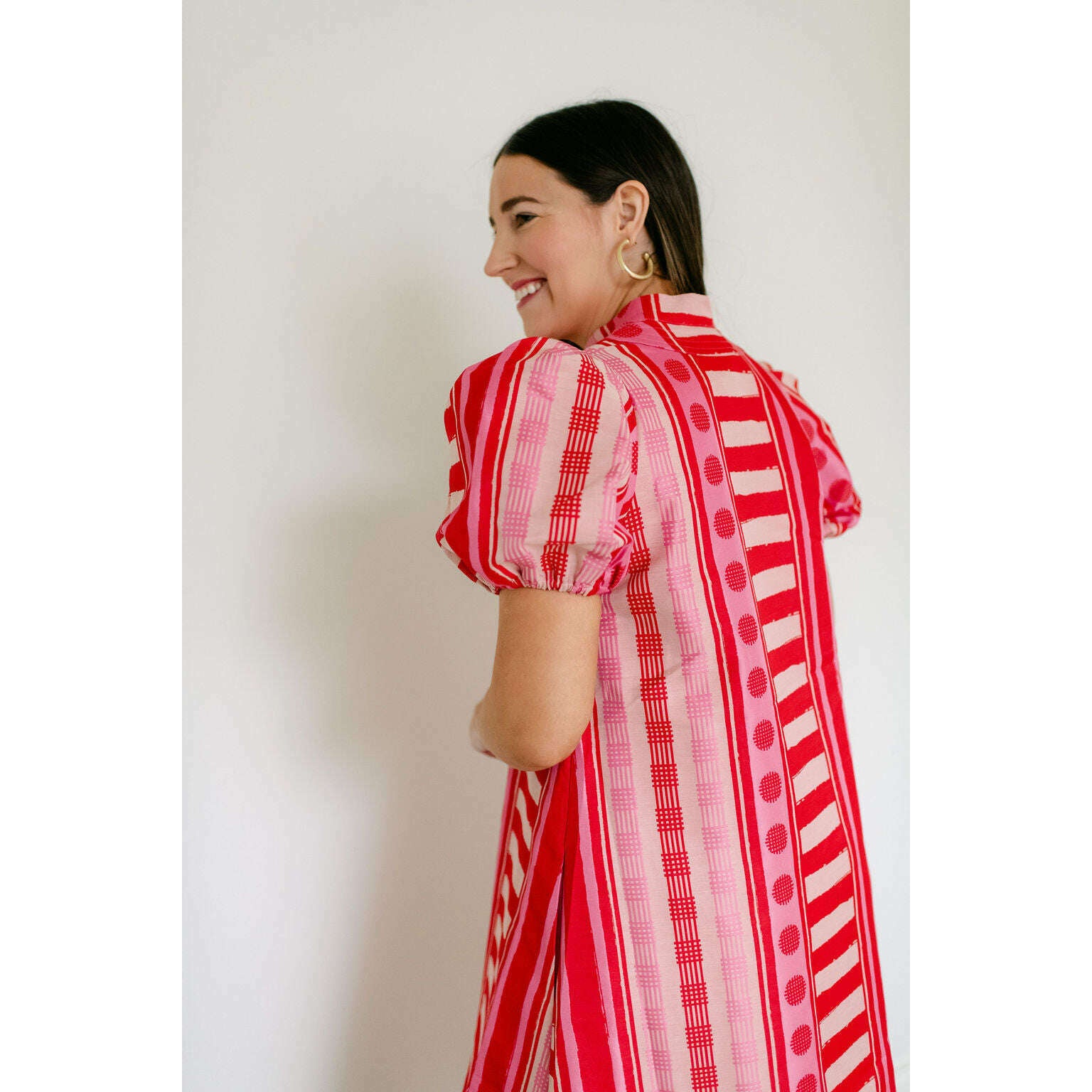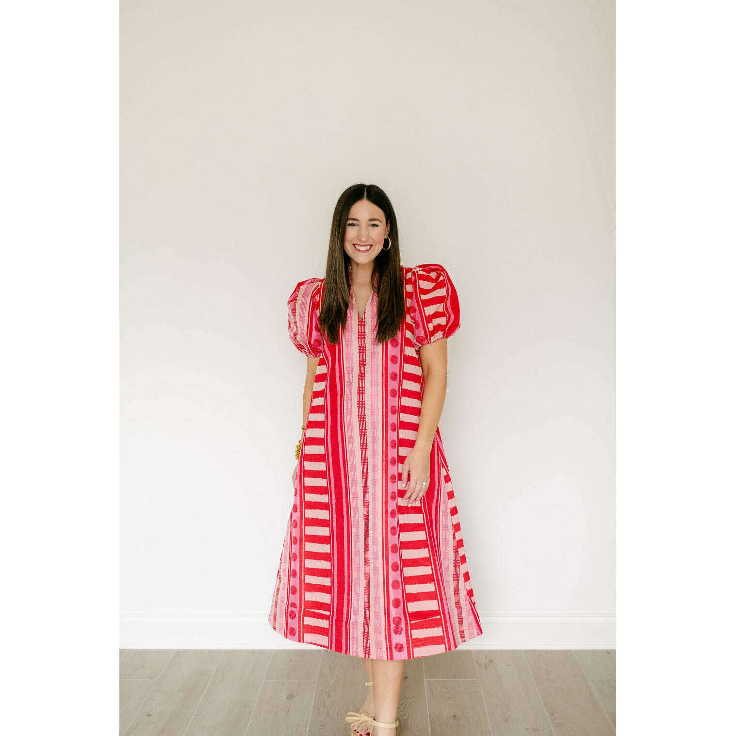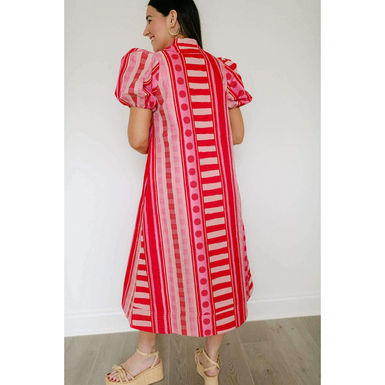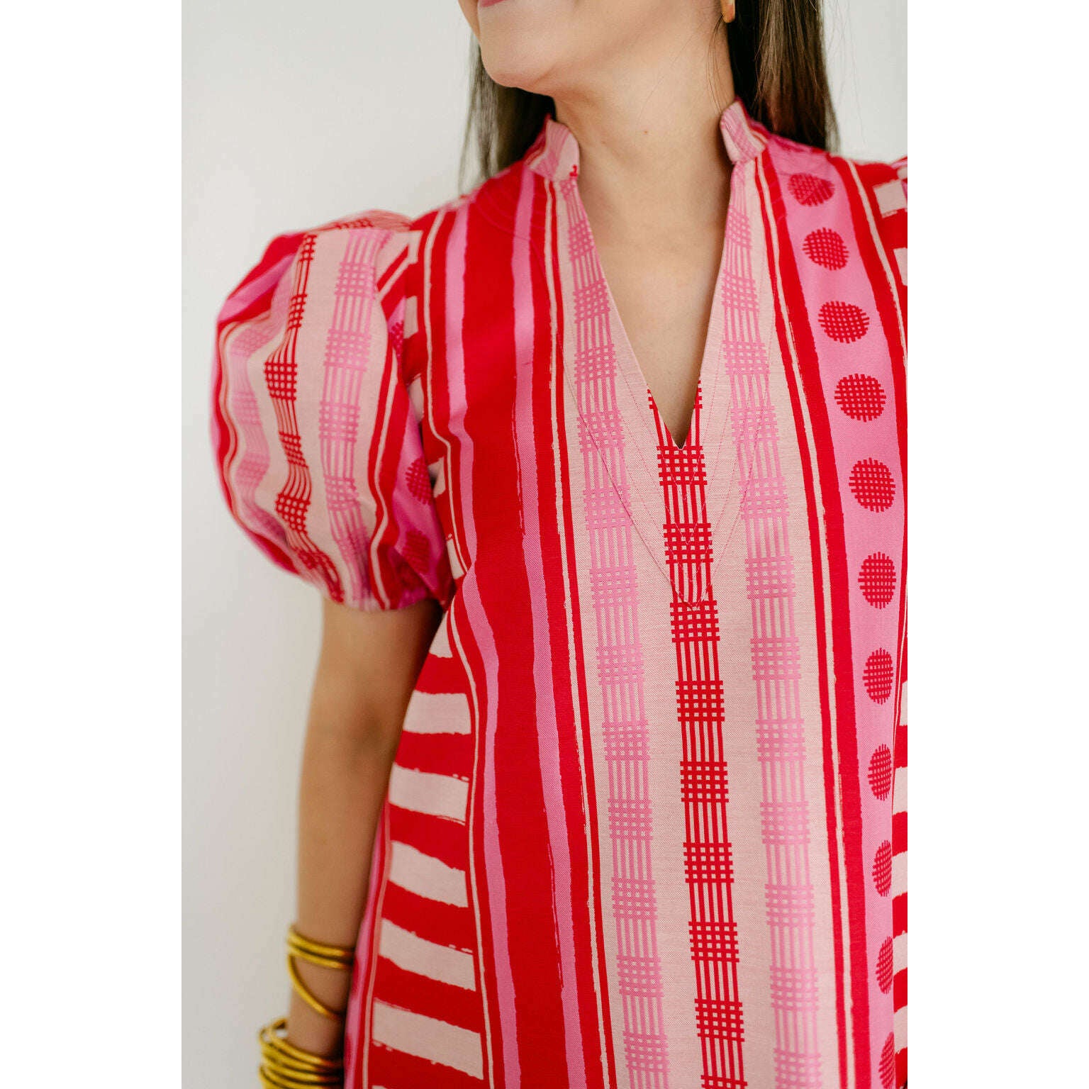 The Emily McCarthy Hampton Dress in Peach Jubilee is a playful yet polished statement with a distinctly feminine spirit. Designed with an easy, relaxed shape, this style features a mandarin-style collar, puff sleeves, and an asymmetrical layout that creates visual interest and movement. Peach Jubilee showcases a vibrant mix of patterns, rendered in a luxe jacquard that offers soft structure and a subtle glow. Lighthearted and confident, this dress strikes the perfect balance between flirty charm and elevated design.