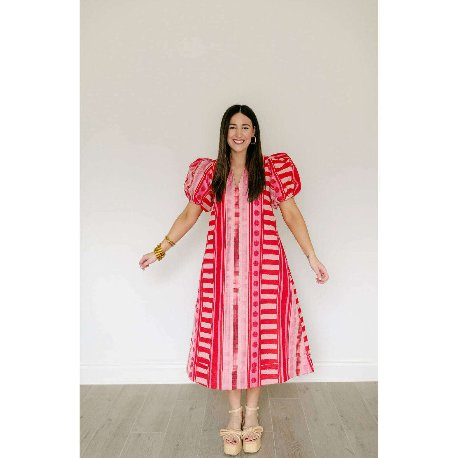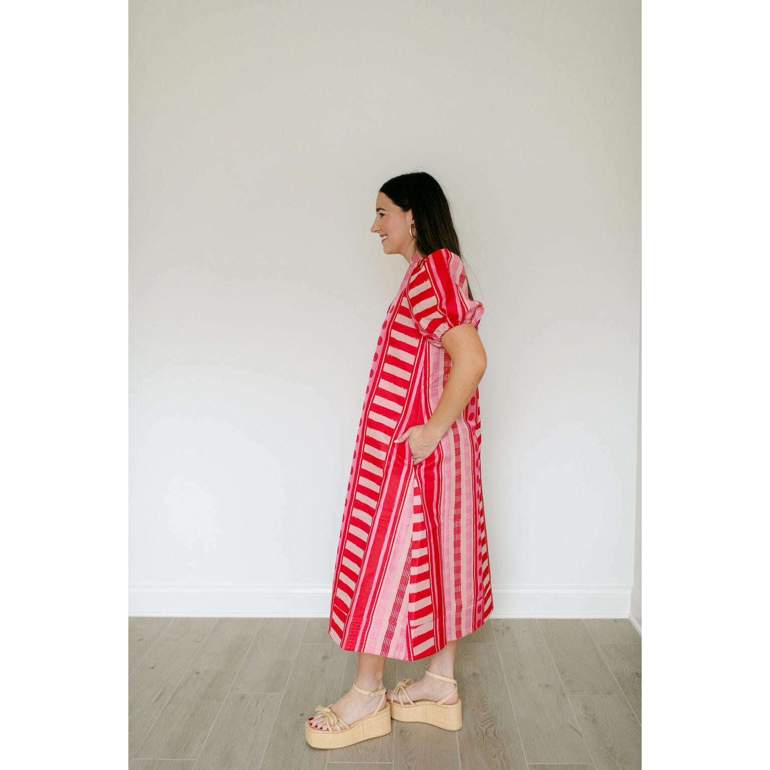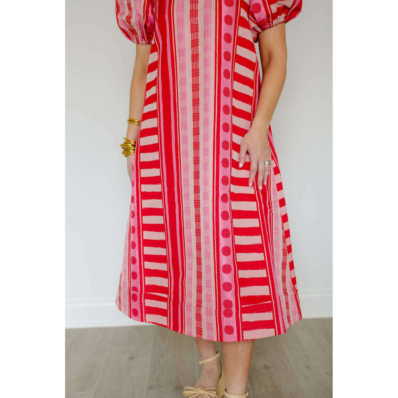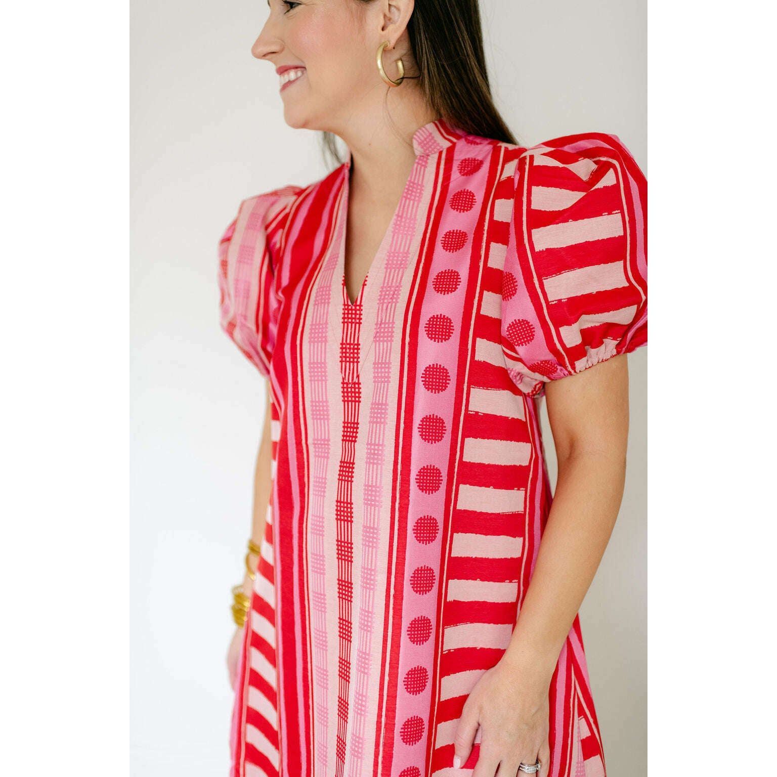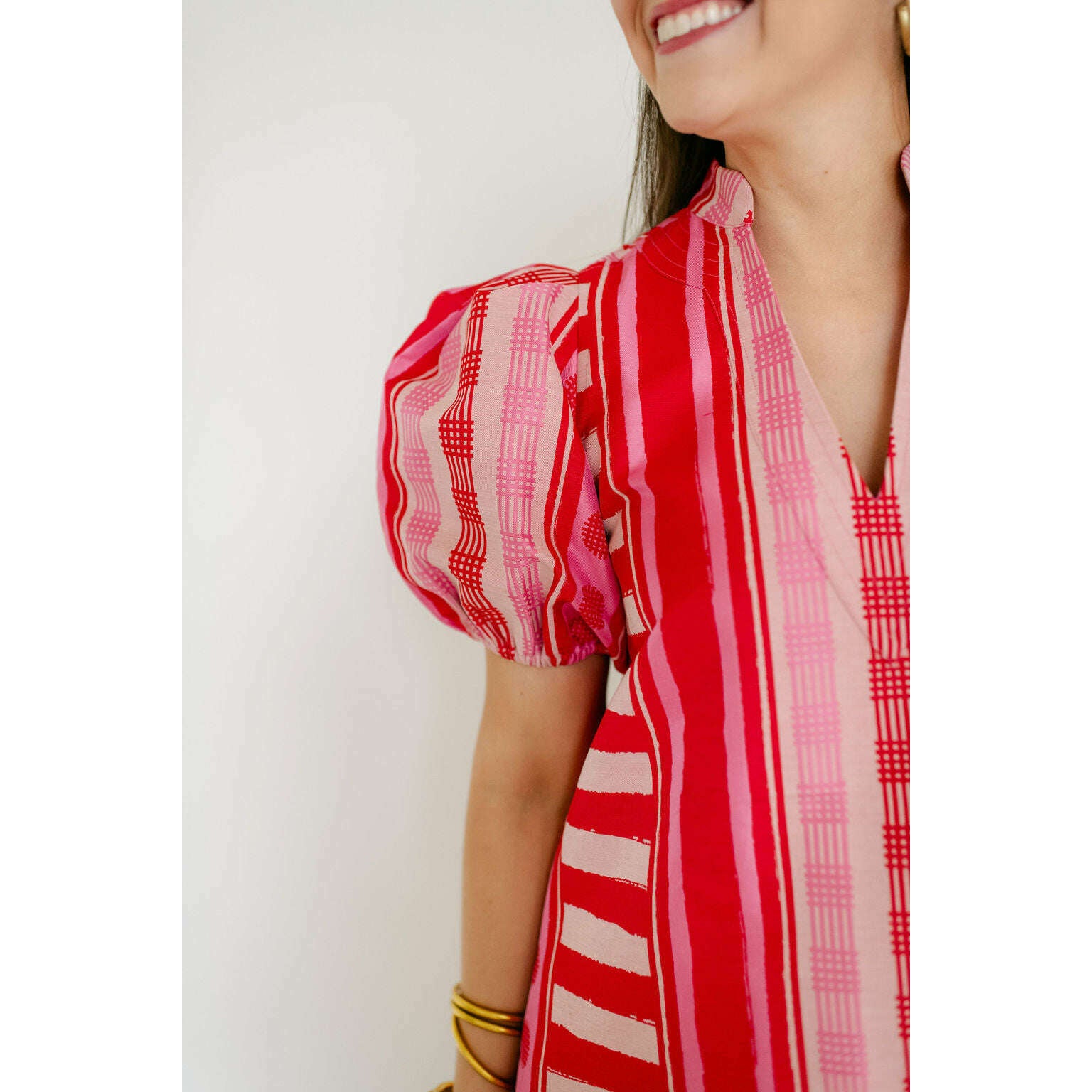 The Emily McCarthy Hampton Dress in Peach Jubilee is a playful yet polished statement with a distinctly feminine spirit. Designed with an easy, relaxed shape, this style features a mandarin-style collar, puff sleeves, and an asymmetrical layout that creates visual interest and movement. Peach Jubilee showcases a vibrant mix of patterns, rendered in a luxe jacquard that offers soft structure and a subtle glow. Lighthearted and confident, this dress strikes the perfect balance between flirty charm and elevated design.