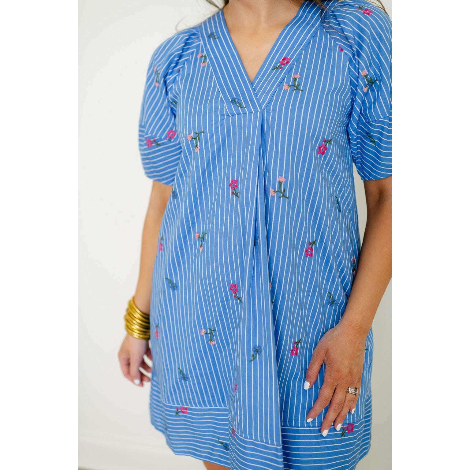 The Entro Blue Stripe Floral Embroidered Dress combines classic blue stripes with delicate floral embroidery for a charming, versatile look that works for any occasion. This adorable piece features intricate embroidered detailing that adds texture and visual interest, making it a standout addition to your wardrobe.