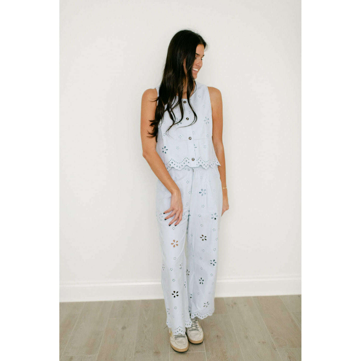 The Entro Light Blue Eyelet Top is an adorable piece that brings effortless charm to any wardrobe with its playful eyelet detailing and soft light blue hue. Style it with coordinating pants for a polished, put-together look that's perfect for casual outings or weekend adventures.