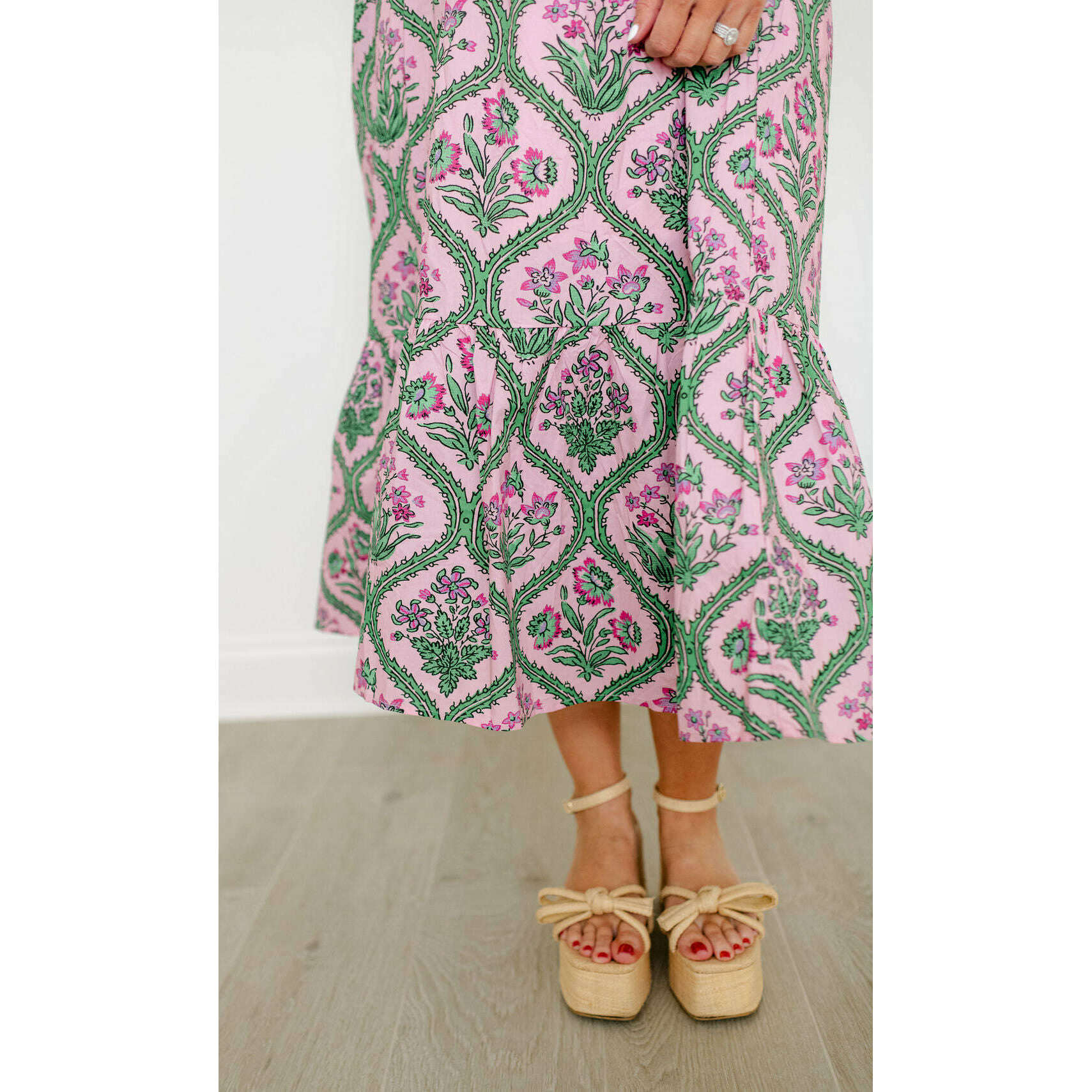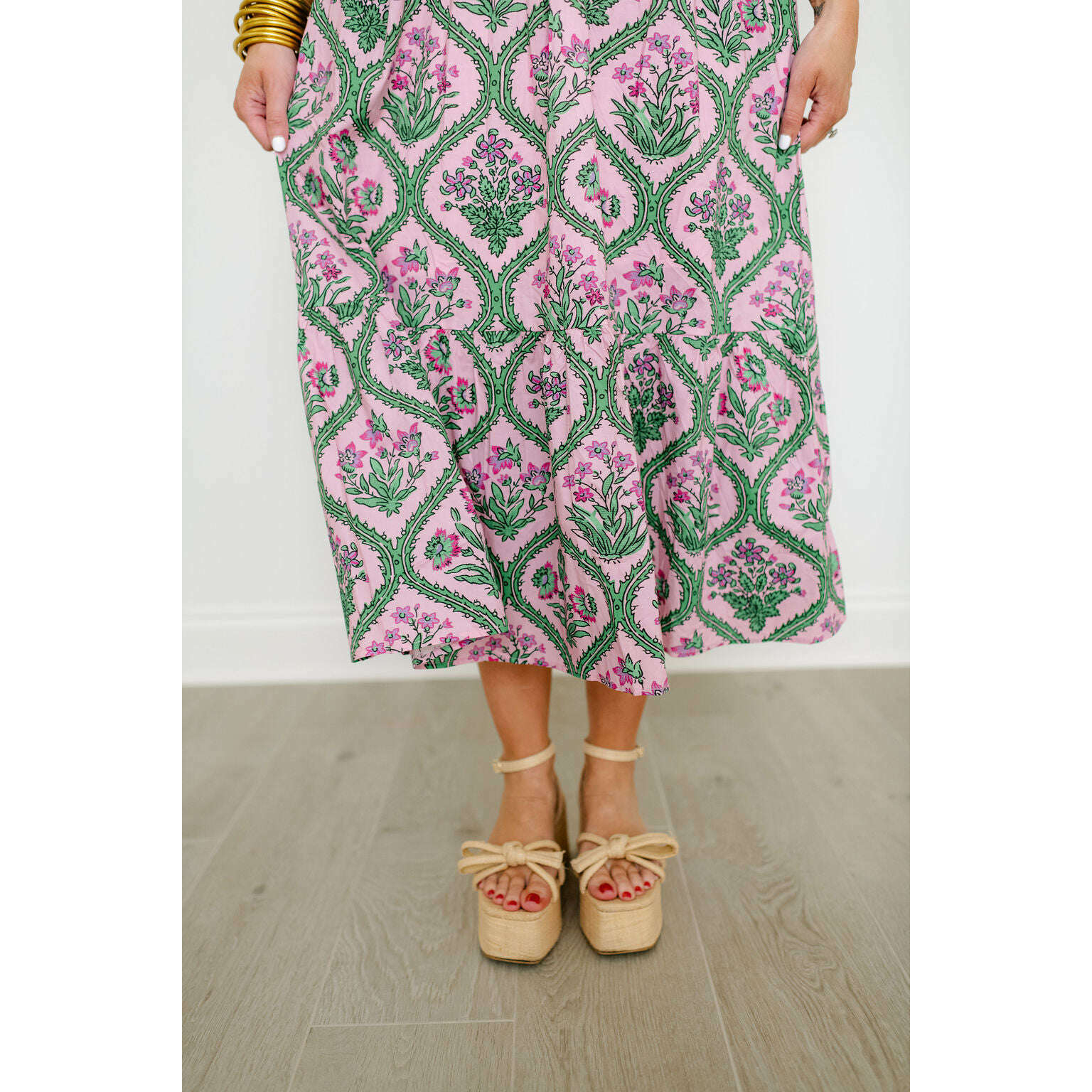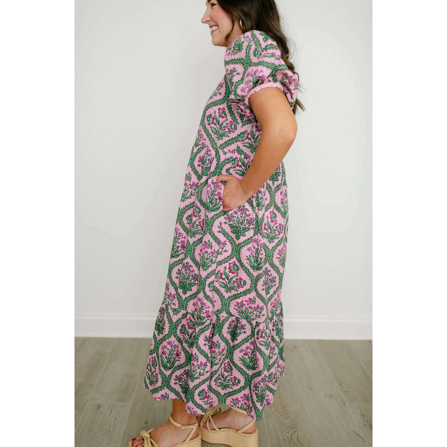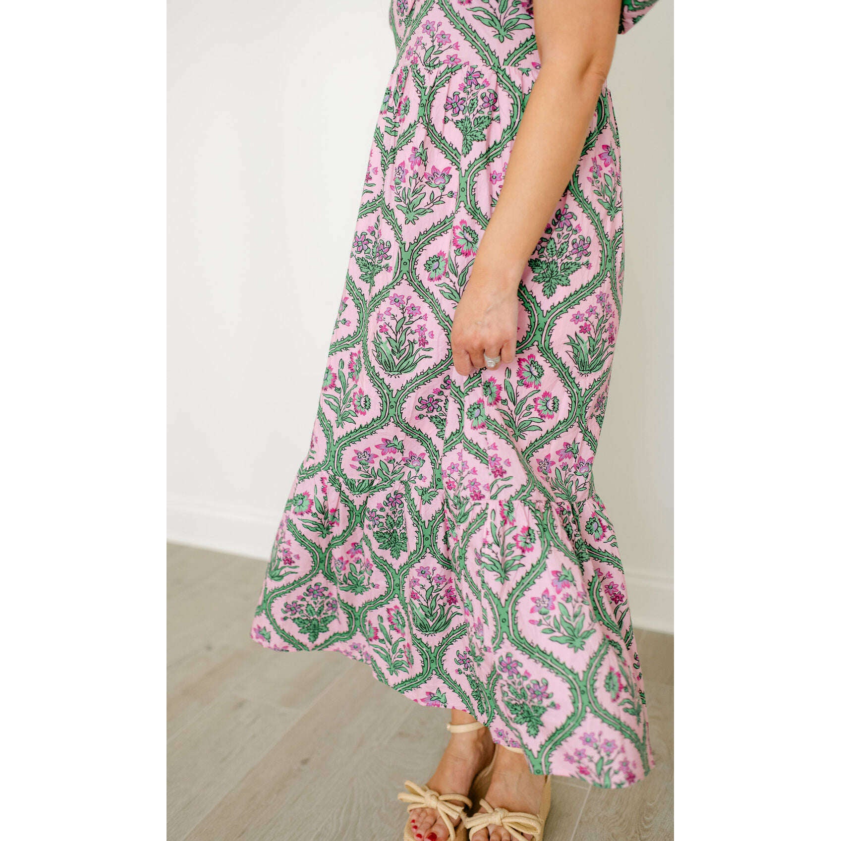 Entro Pink and Green Floral Block Print Midi Dress