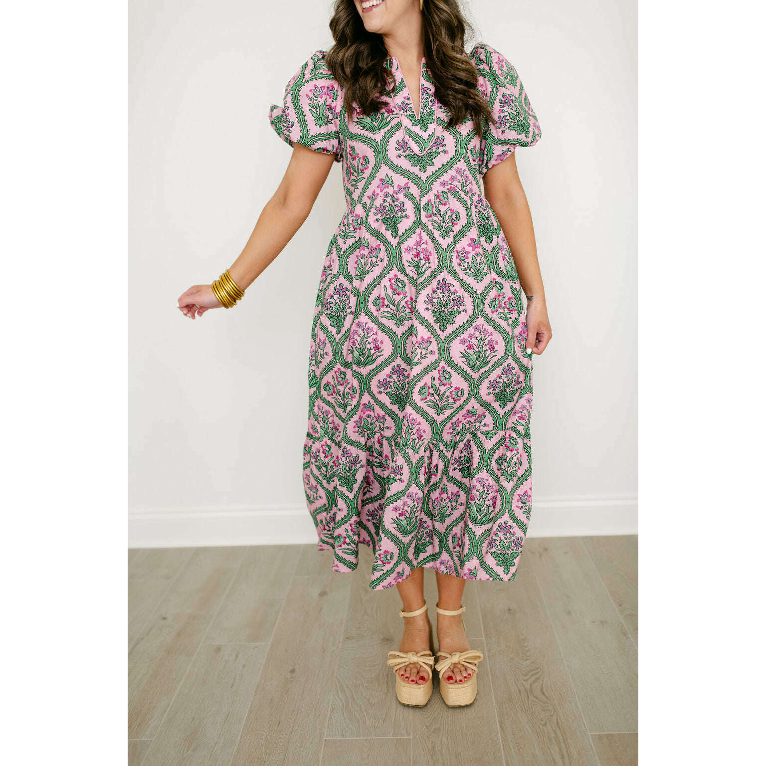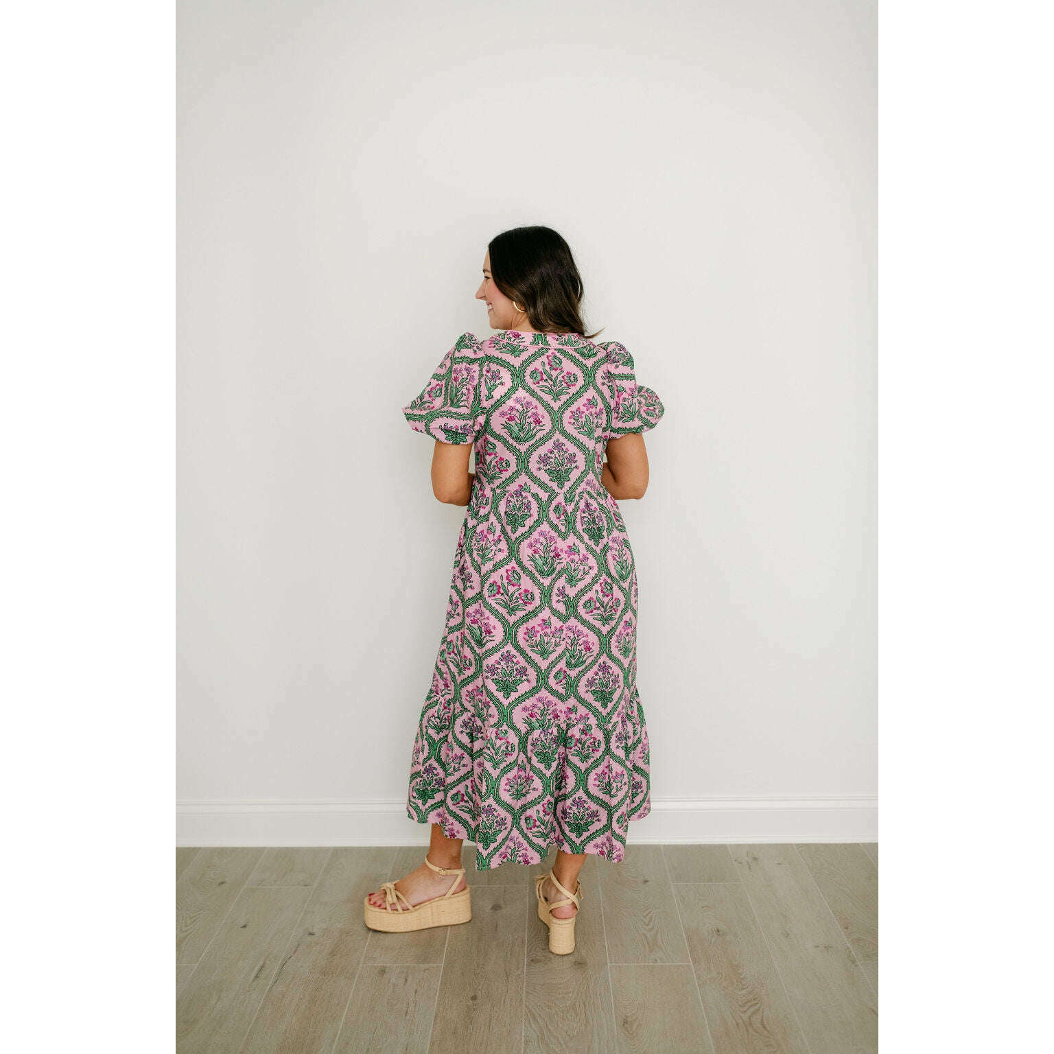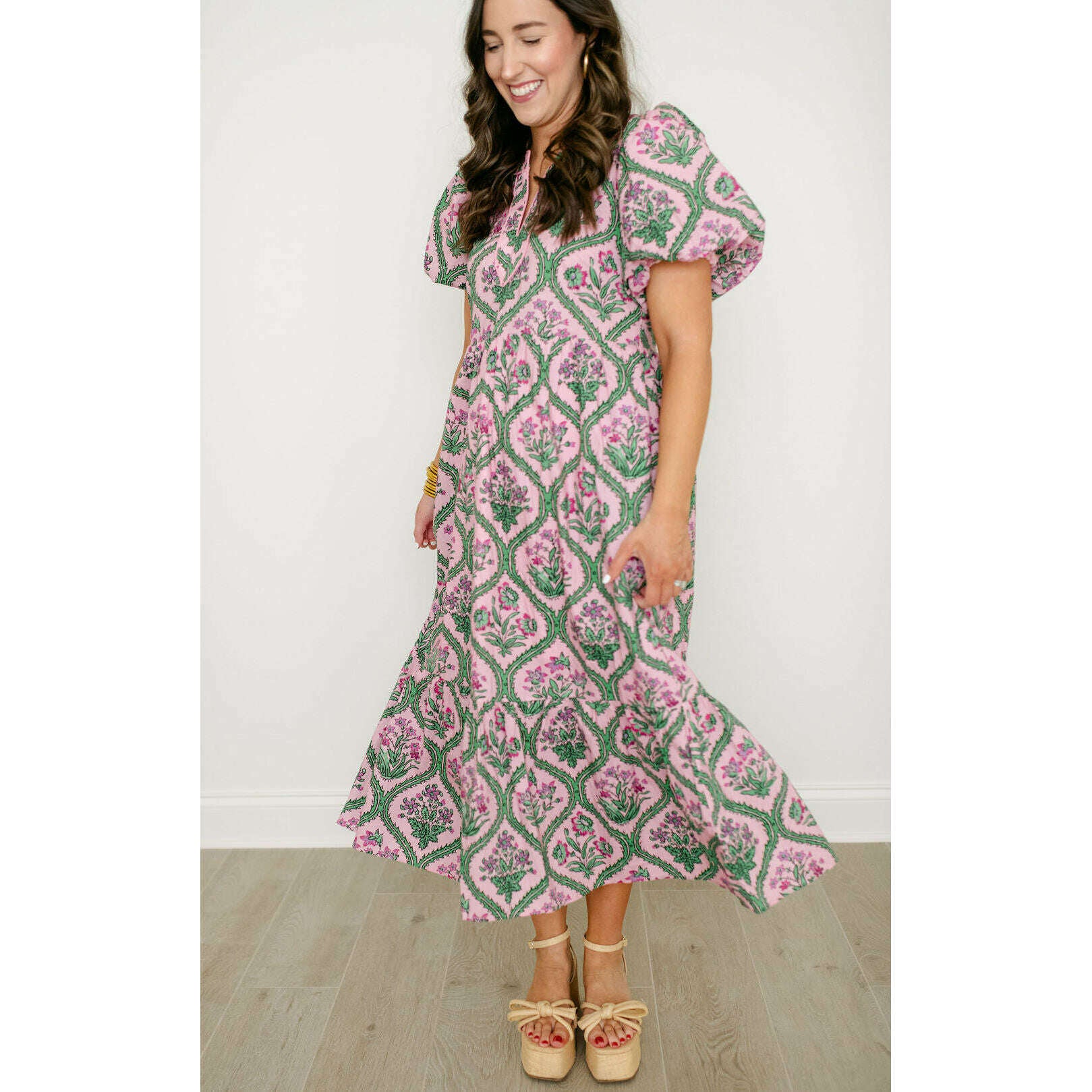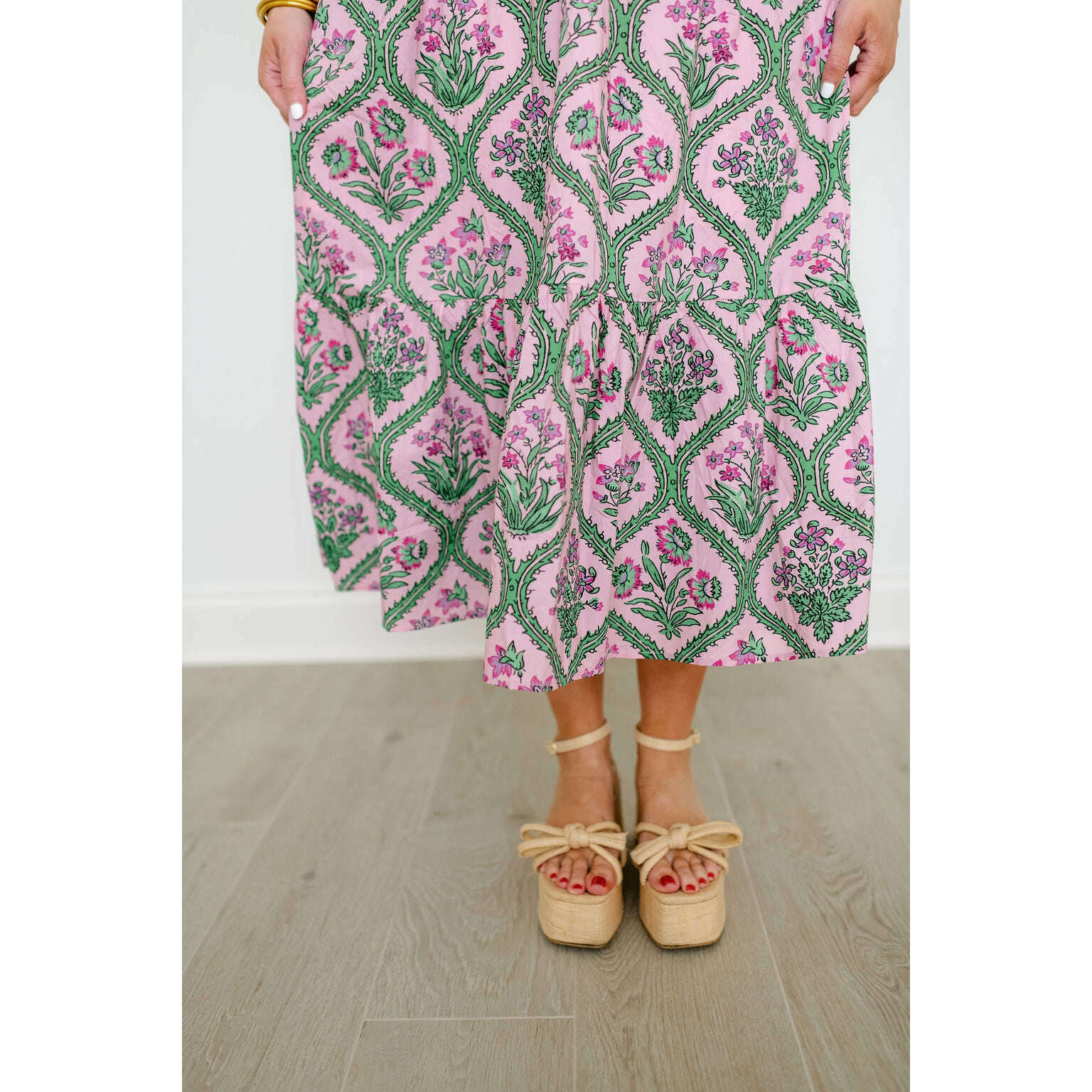 Entro Pink and Green Floral Block Print Midi Dress