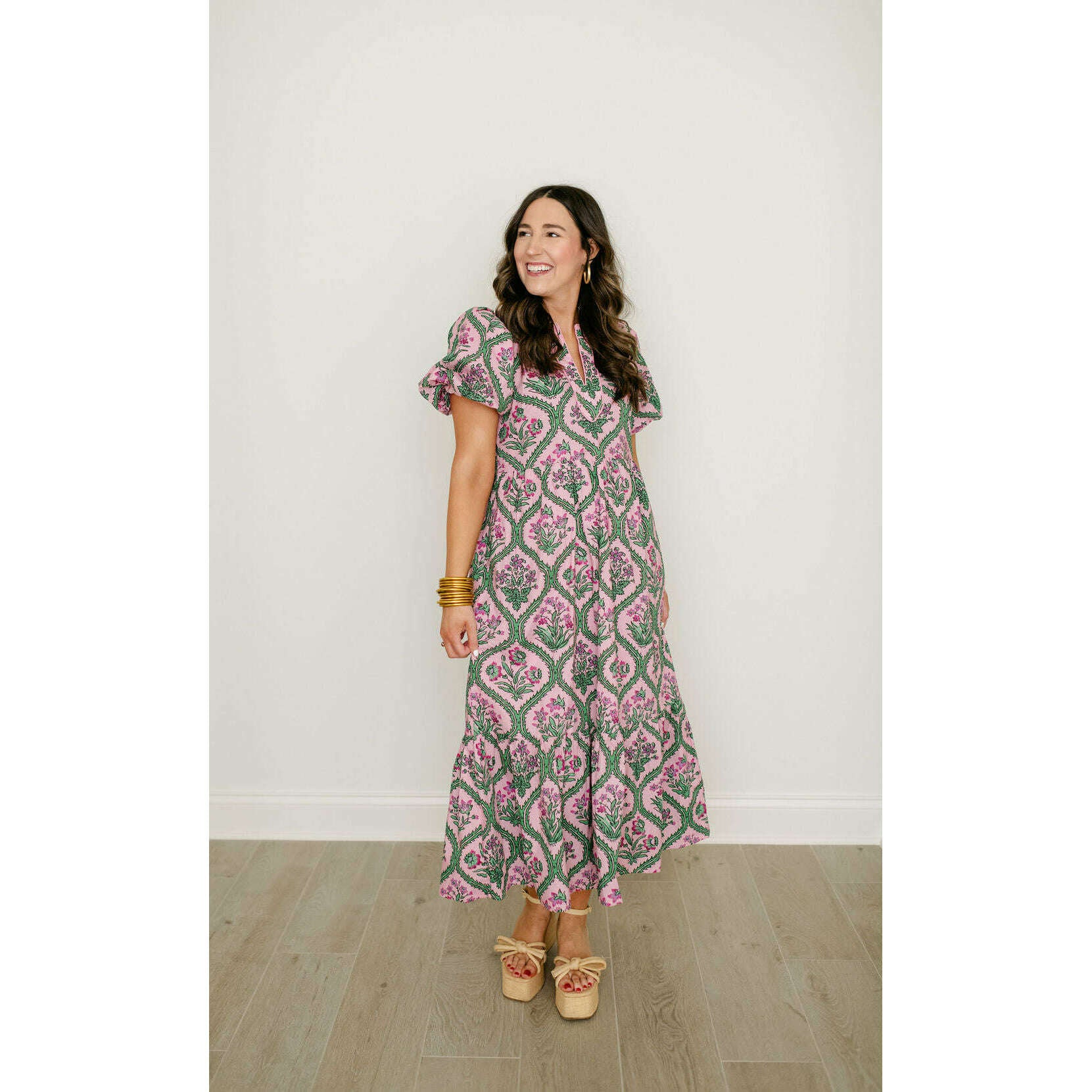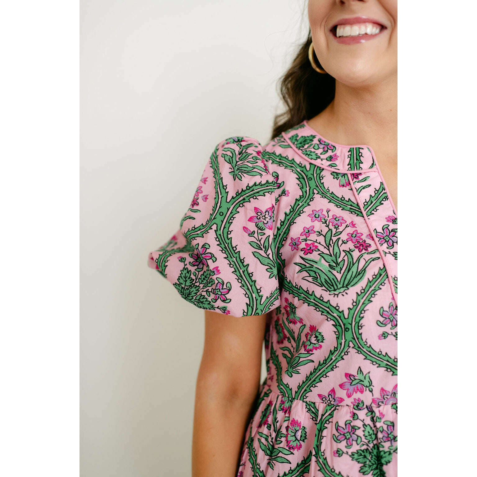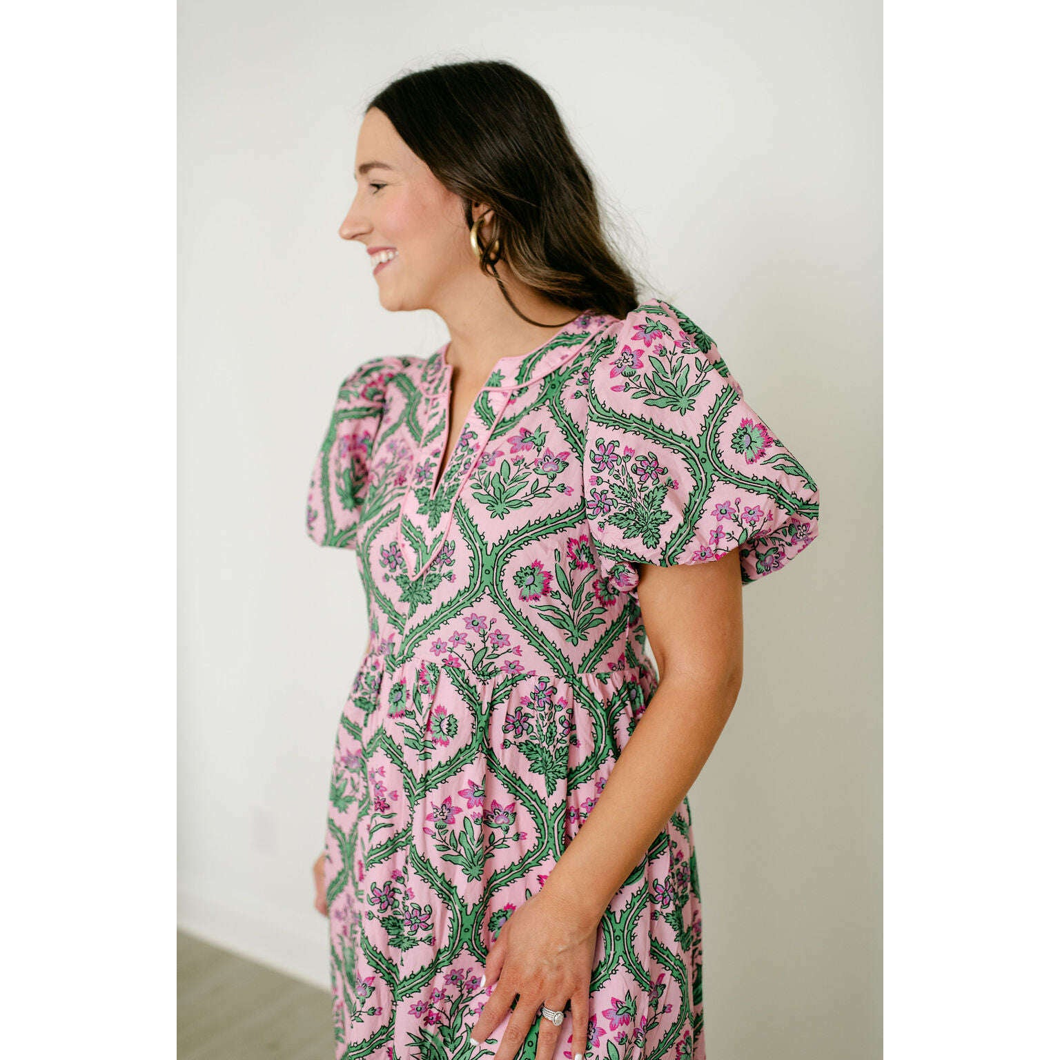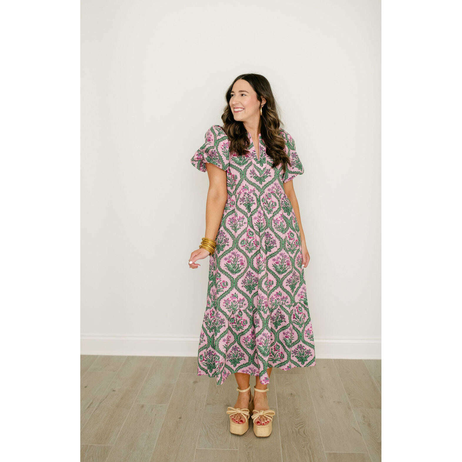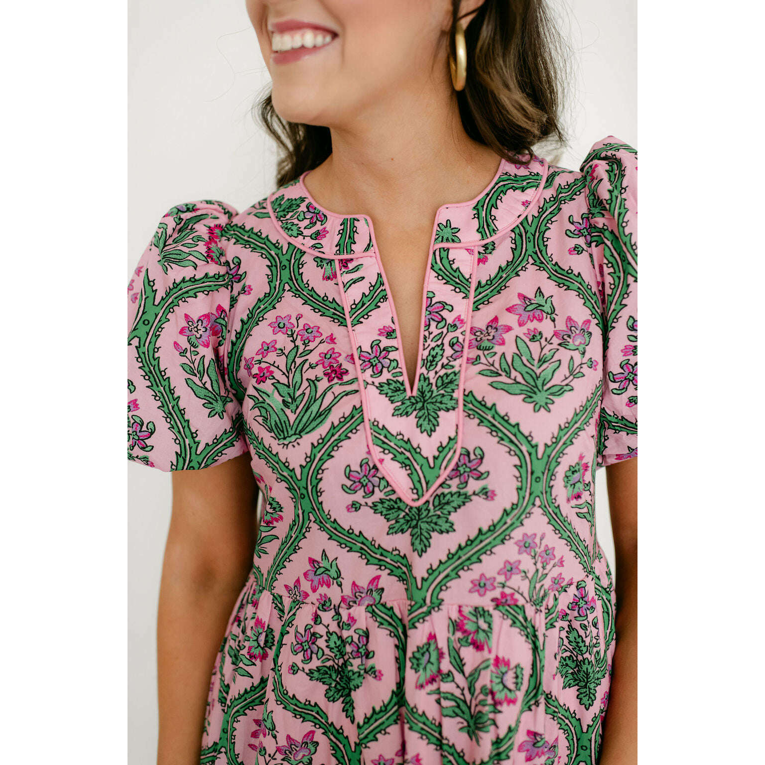 Entro Pink and Green Floral Block Print Midi Dress
