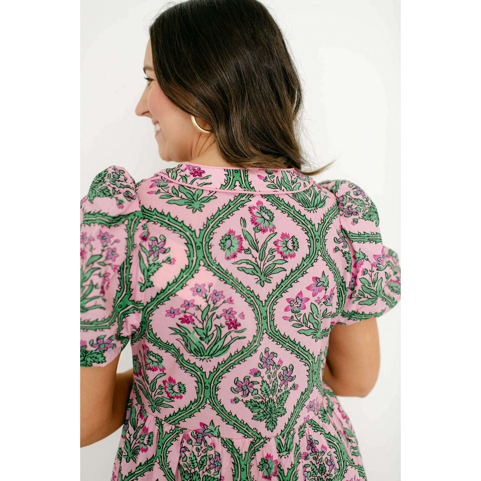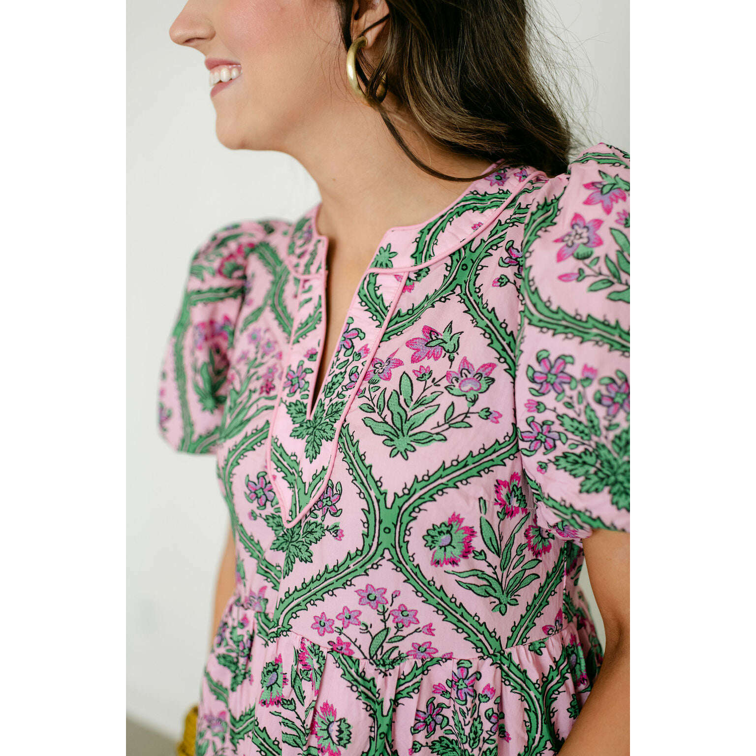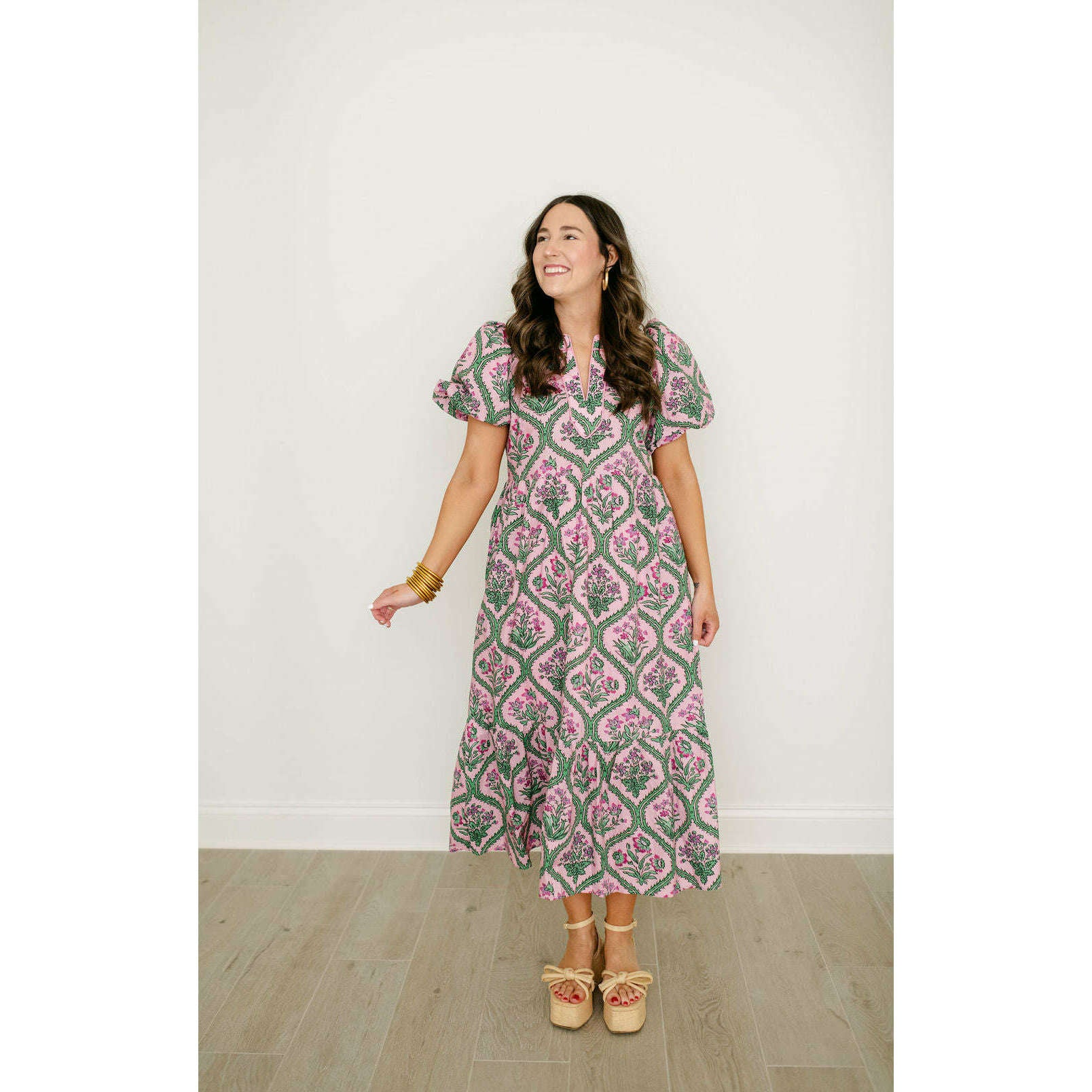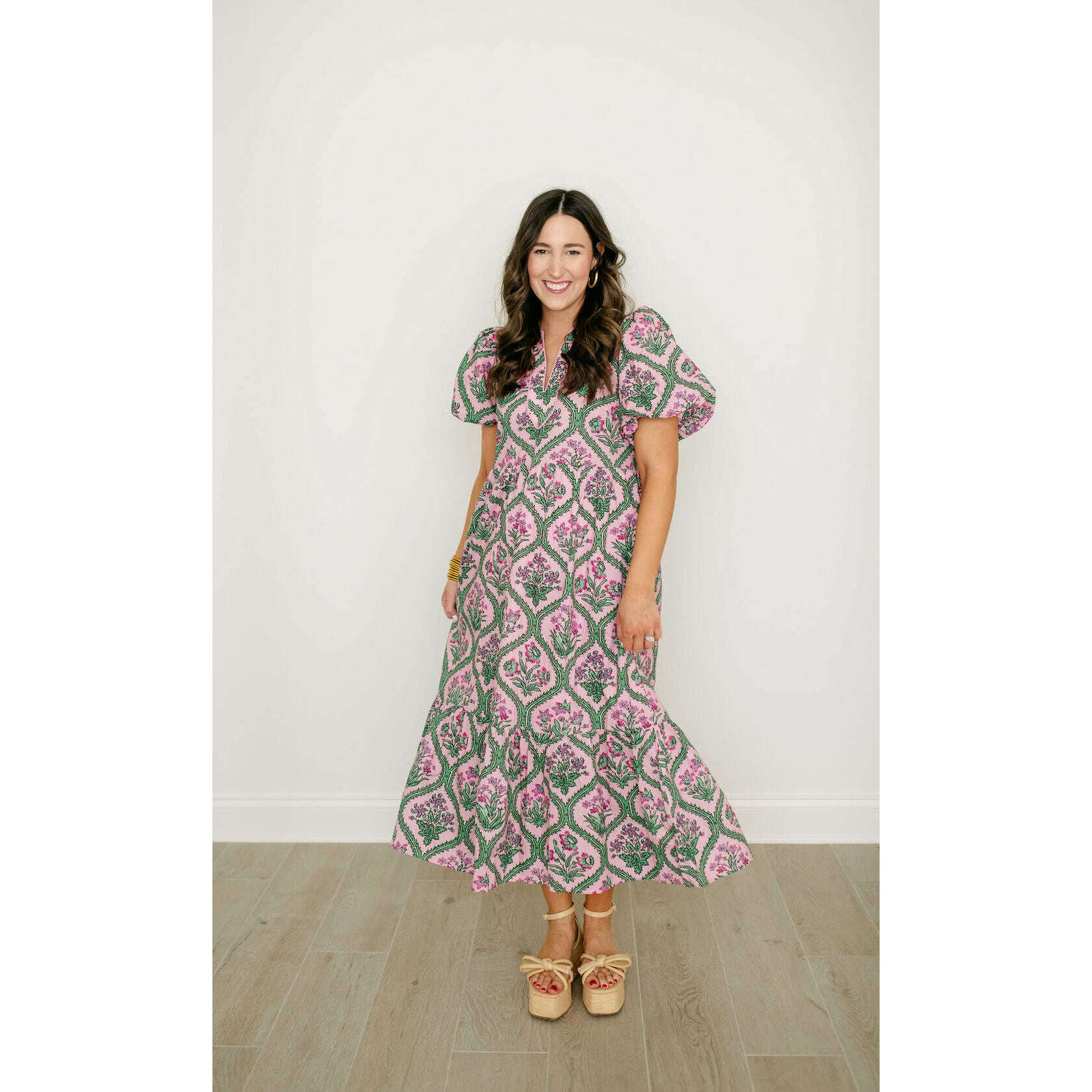 Entro Pink and Green Floral Block Print Midi Dress