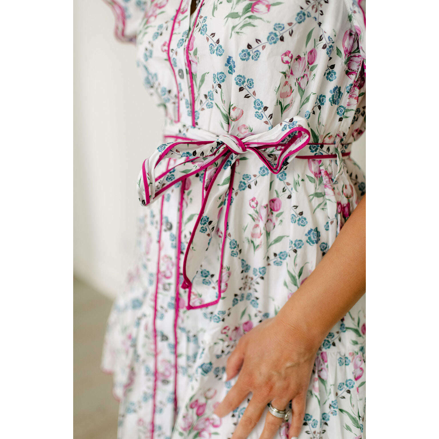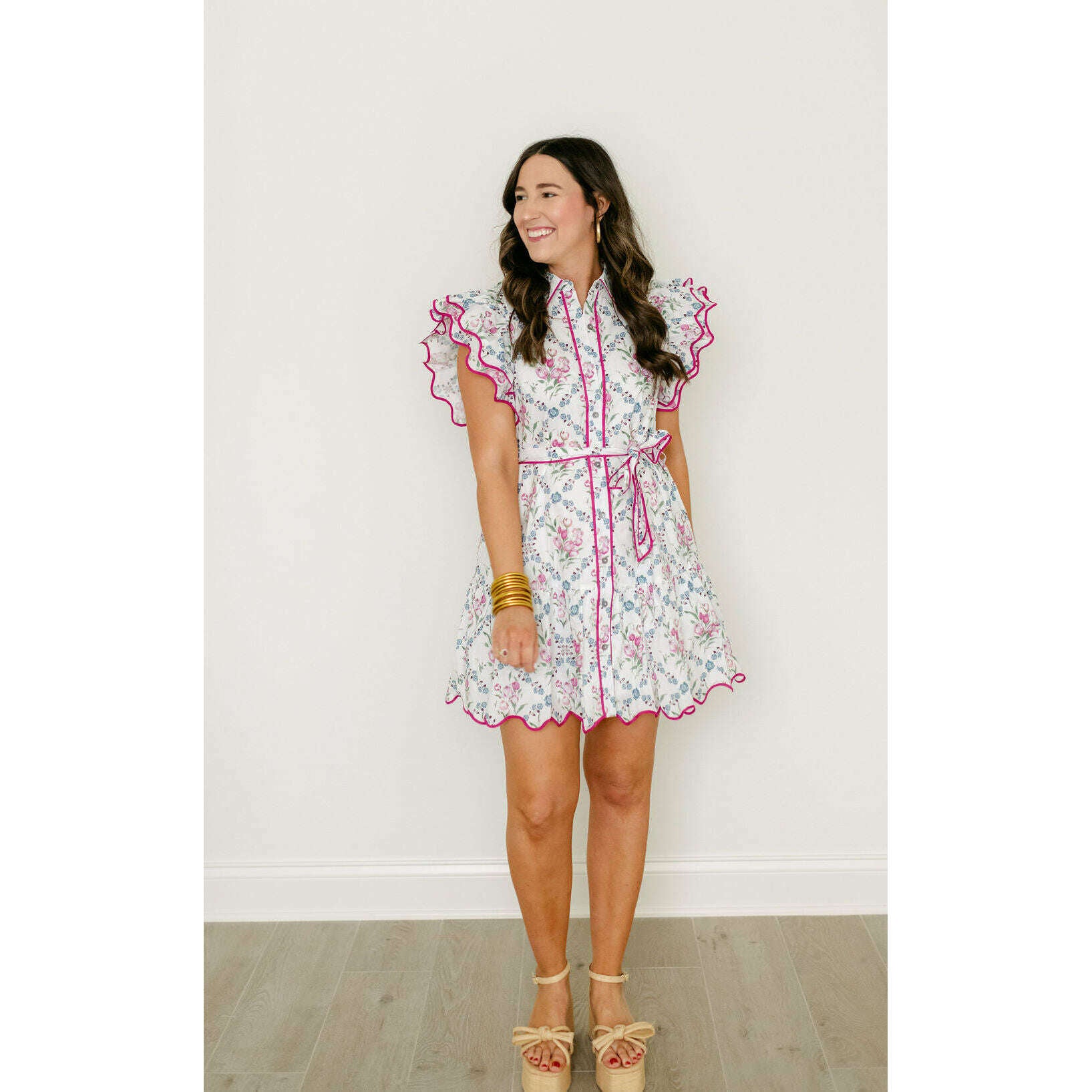 Entro White Floral Dress with Pink Scalloped Hem