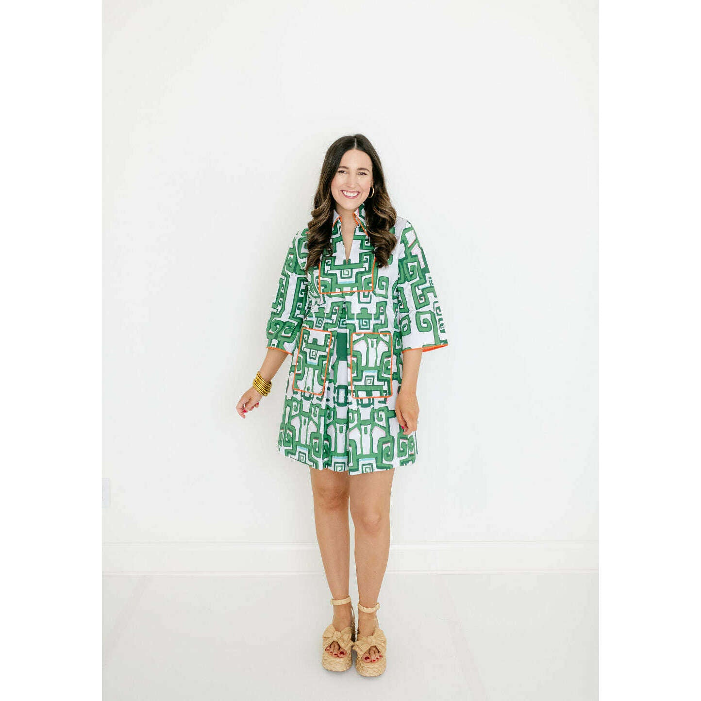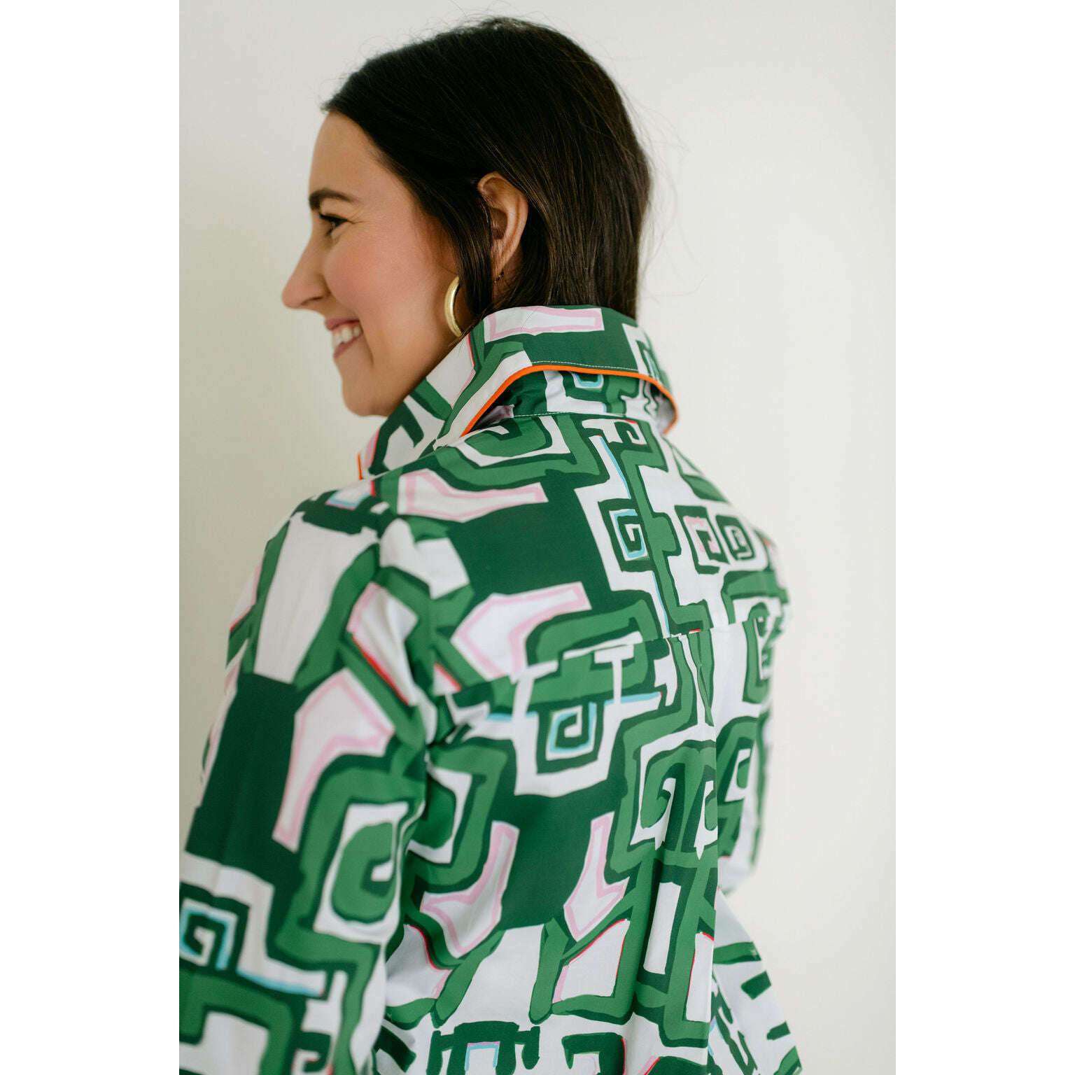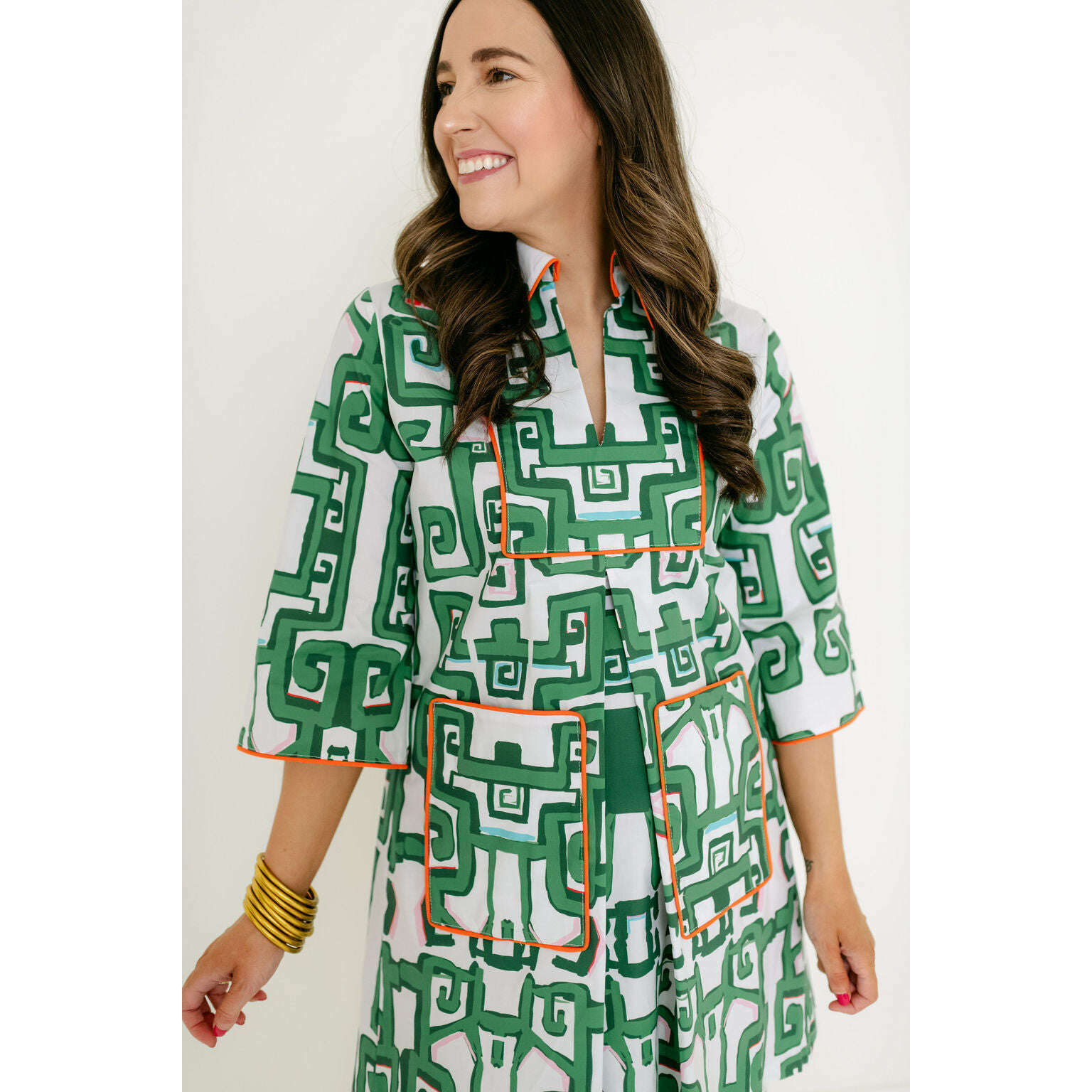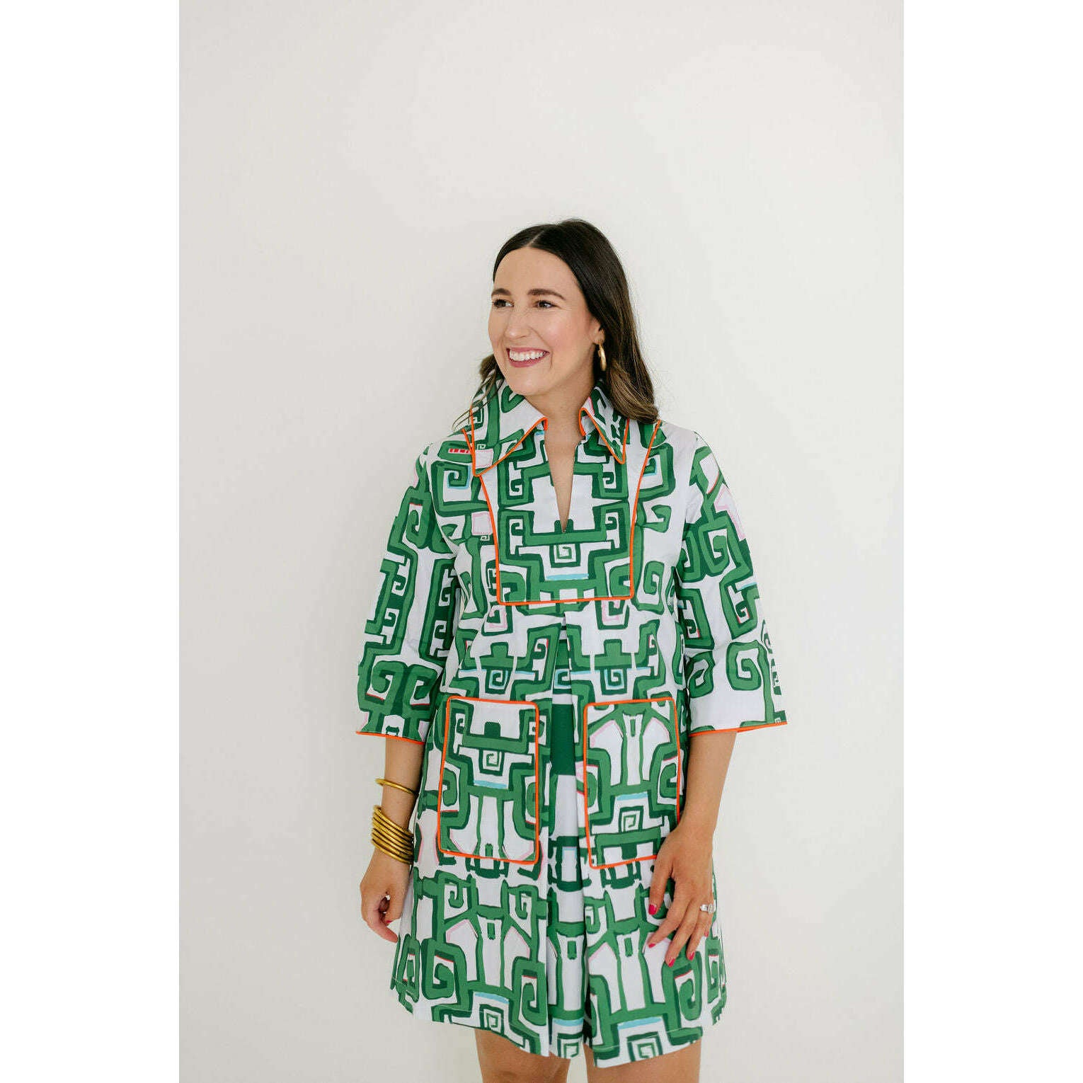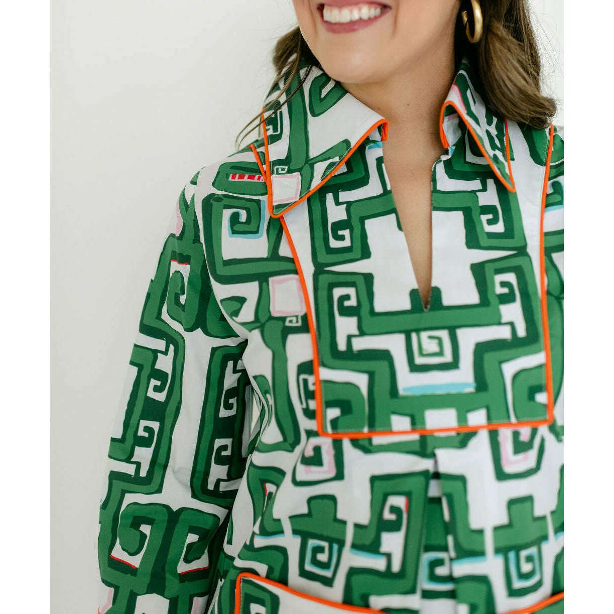 The silhouette is a true A-line that skims the body with effortless ease. An oversized butterfly collar and front patch pockets add character, while contrast orange piping and lined detailing elevate the whole look with a sense of polish and intention.
