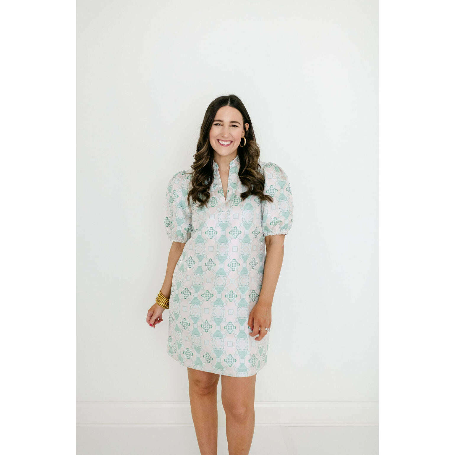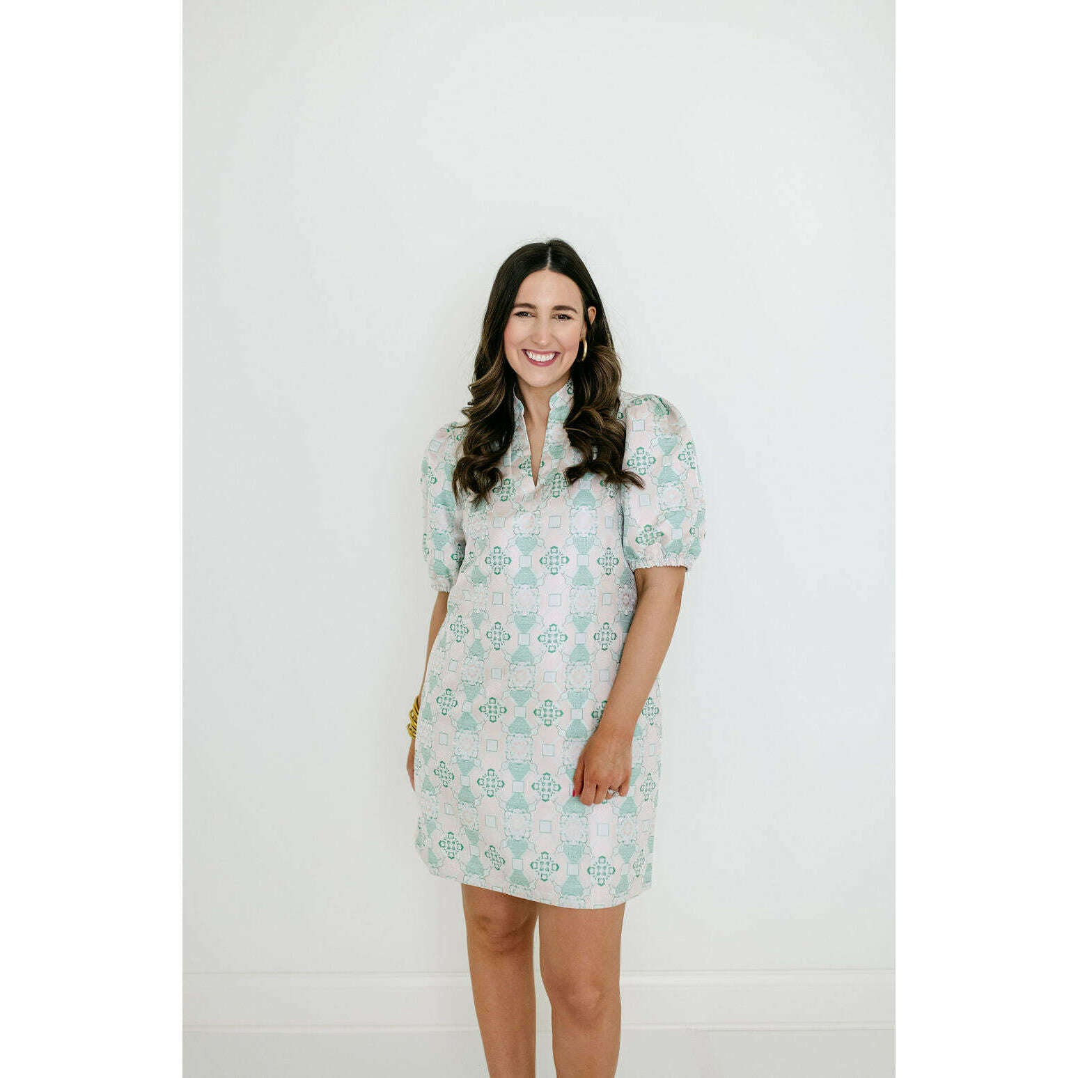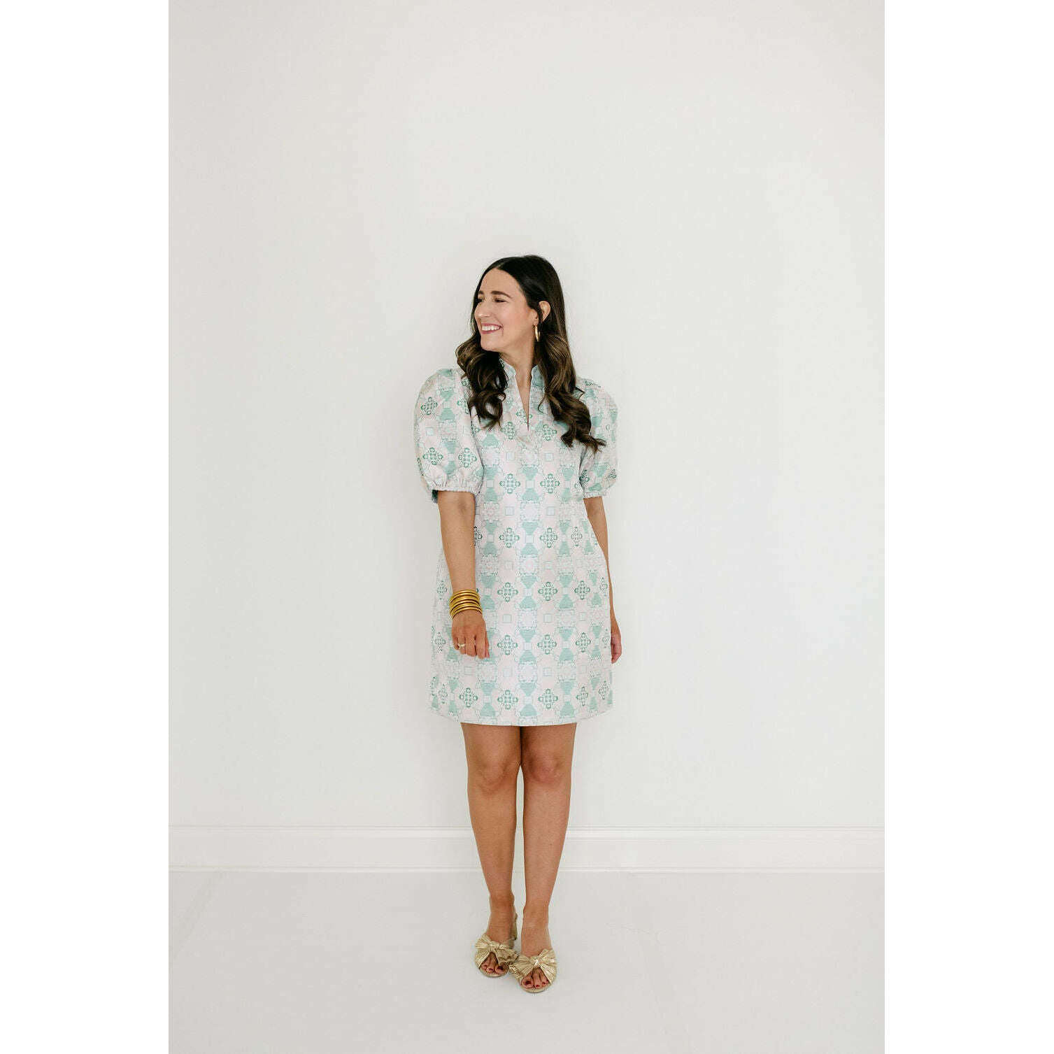 Fits true to size, this dress fits like a shift. Caroline is wearing a size small. She is 5'7, a size 4 and a 32B