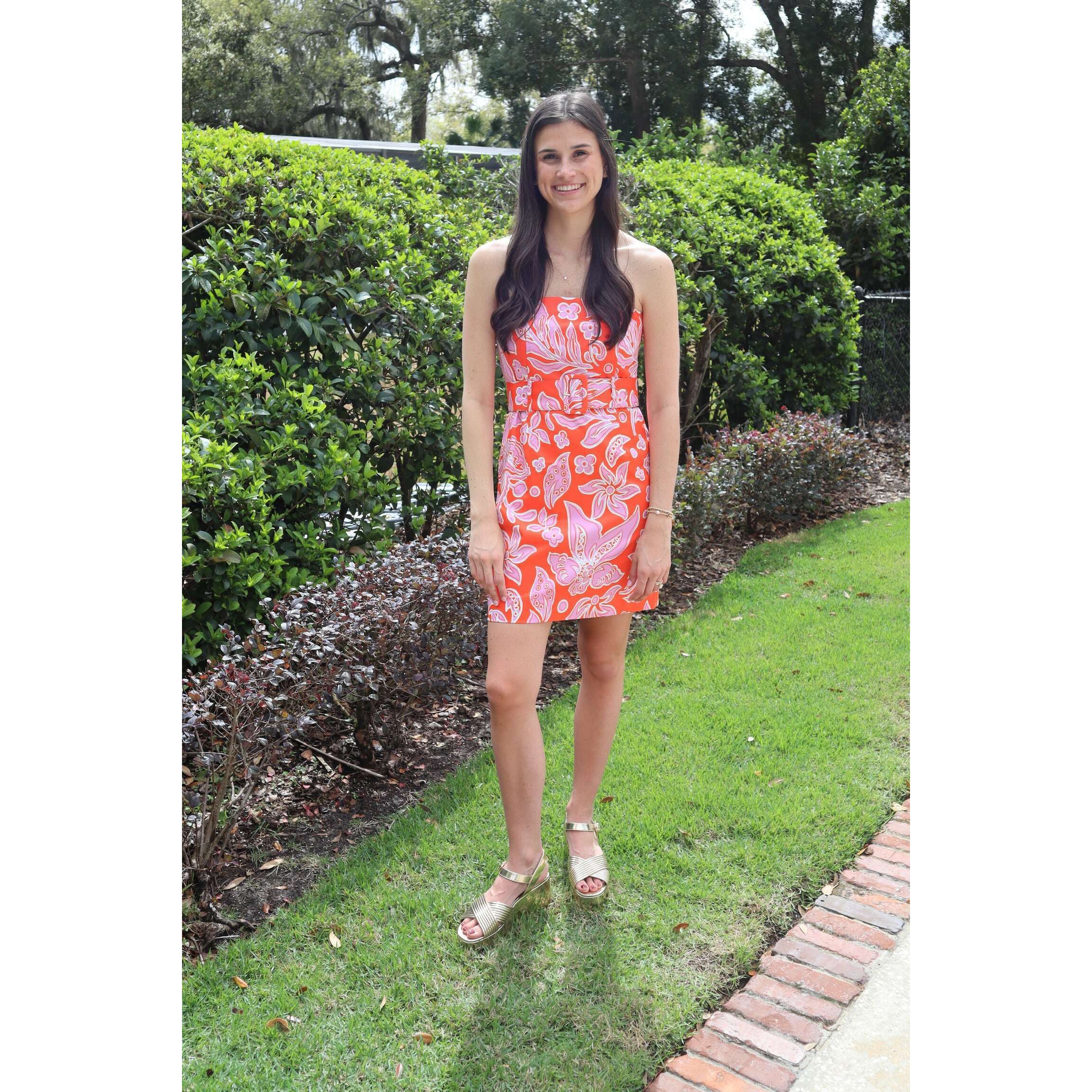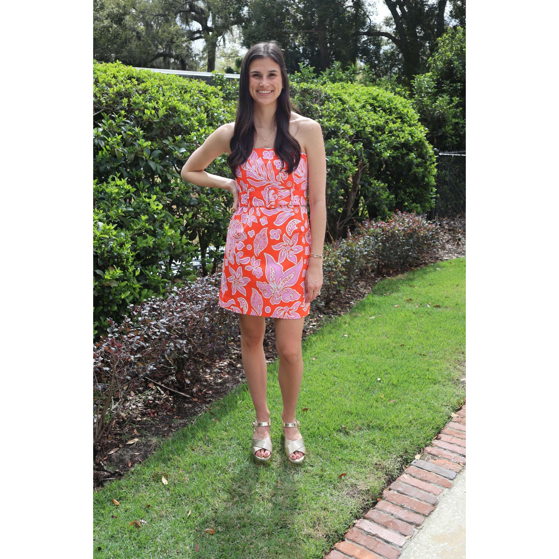 The Jade Melody Tam Belted Strapless Dress in Orange Petal features a gorgeous orange petal print and cinched waist that flatters every figure. This cute strapless style is ideal for spring events, weddings, and special occasions where you want to stand out with effortless sophistication.
