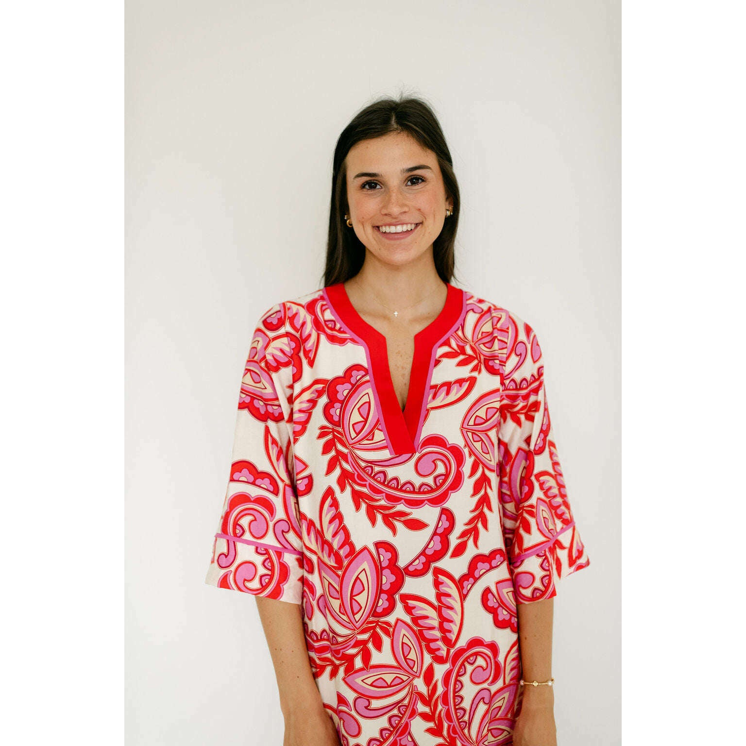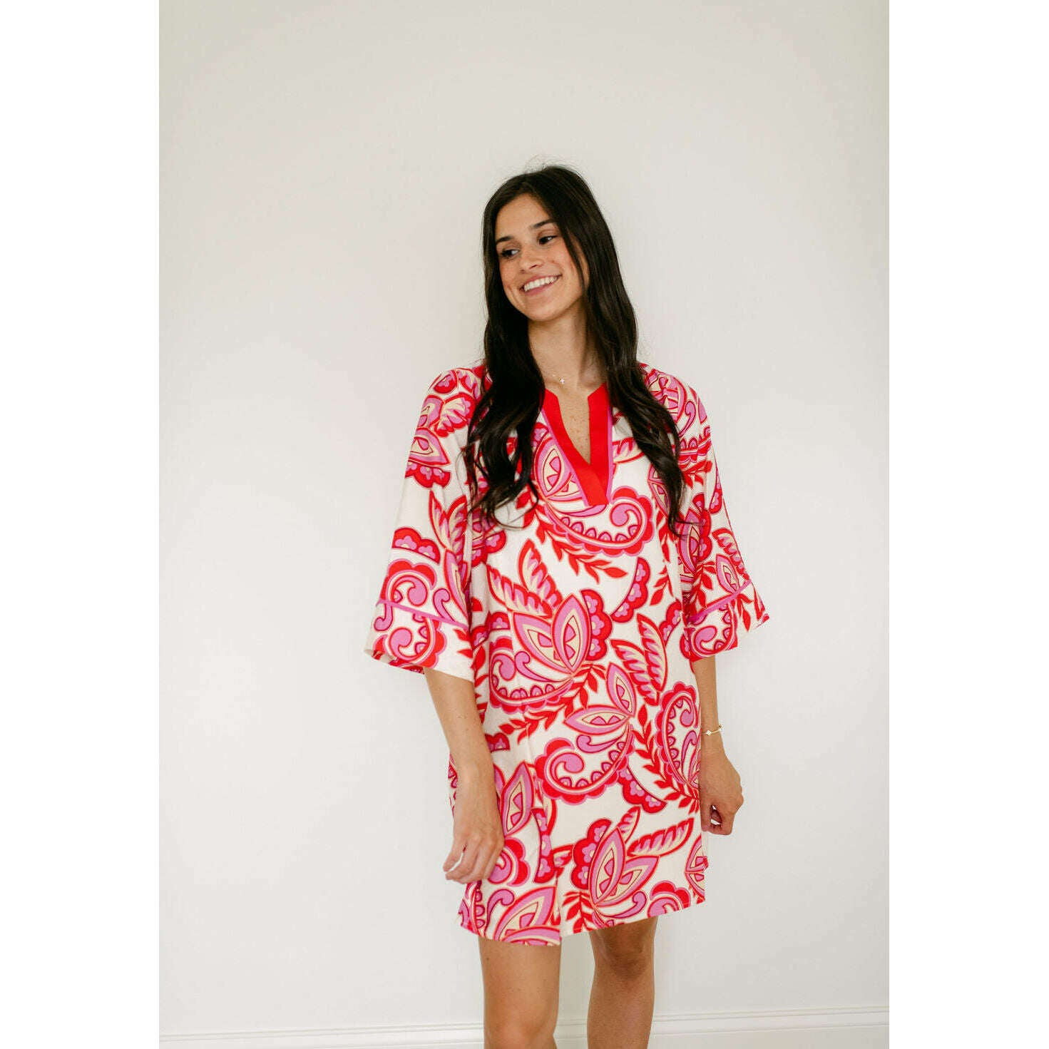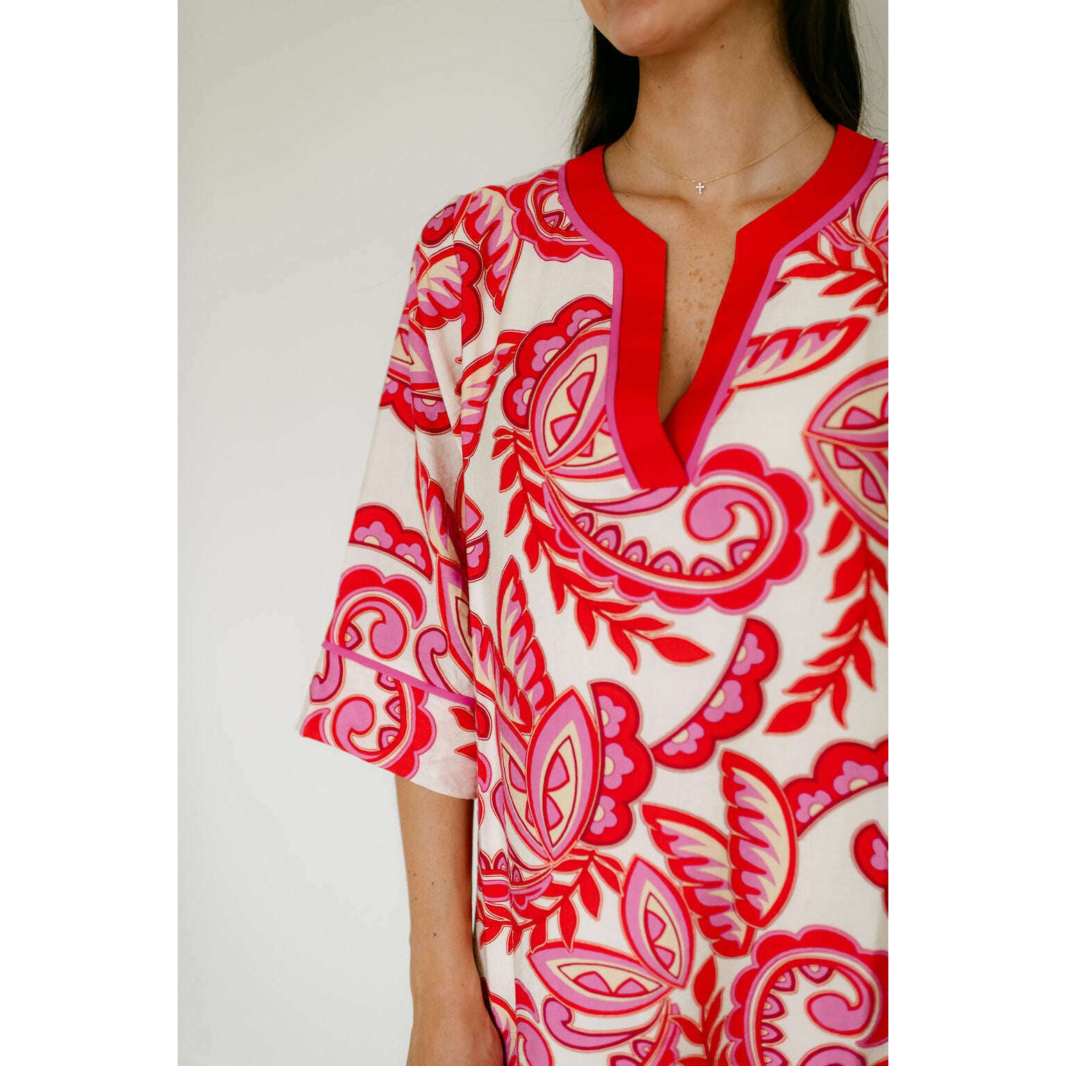 The Jade Melody Tam Red Paisley Trimmed Tunic Dress brings vibrant style to your warm-weather wardrobe with its eye-catching red paisley trim and comfortable tunic silhouette. Perfect for spring and summer adventures, this fun piece effortlessly transitions from casual outings to relaxed gatherings.