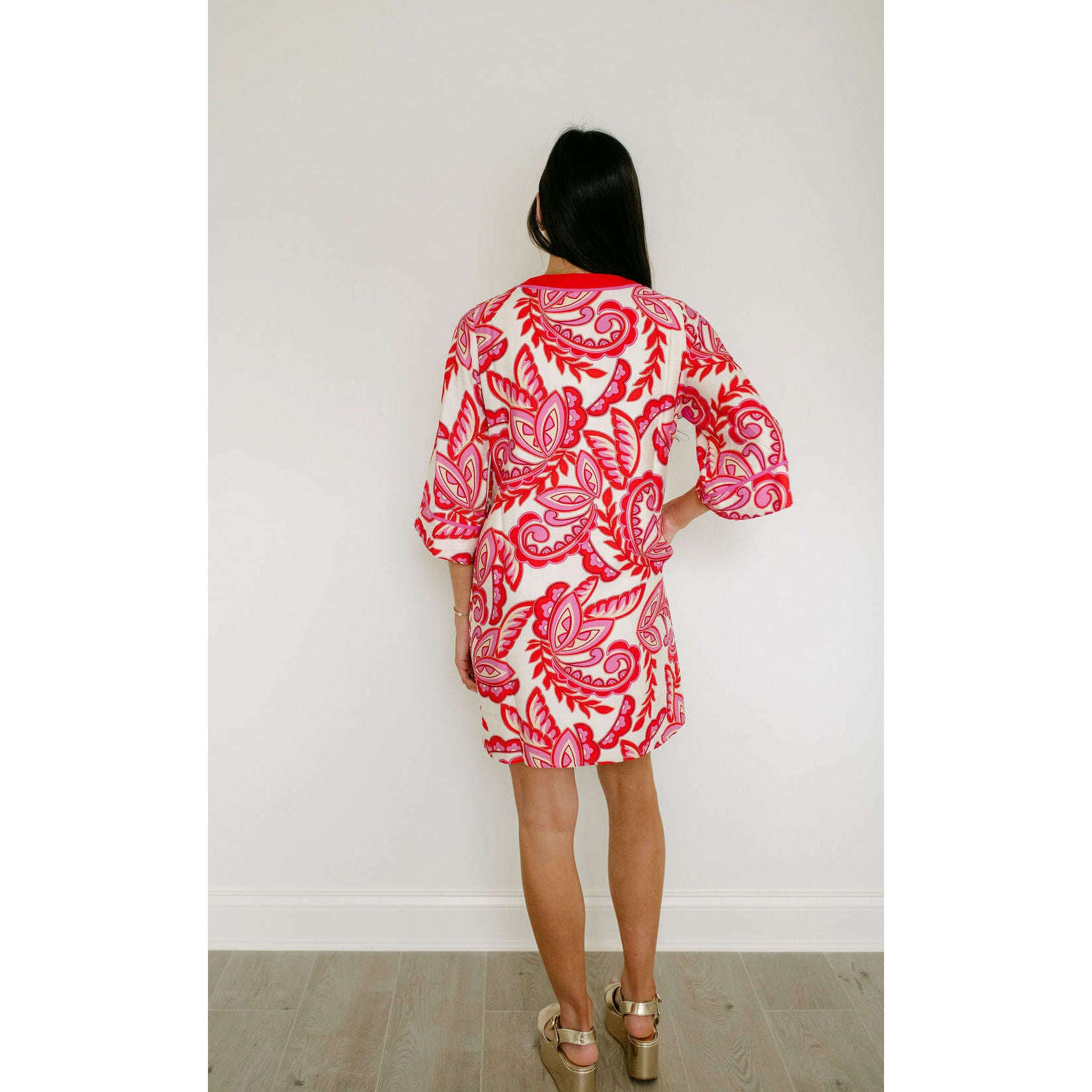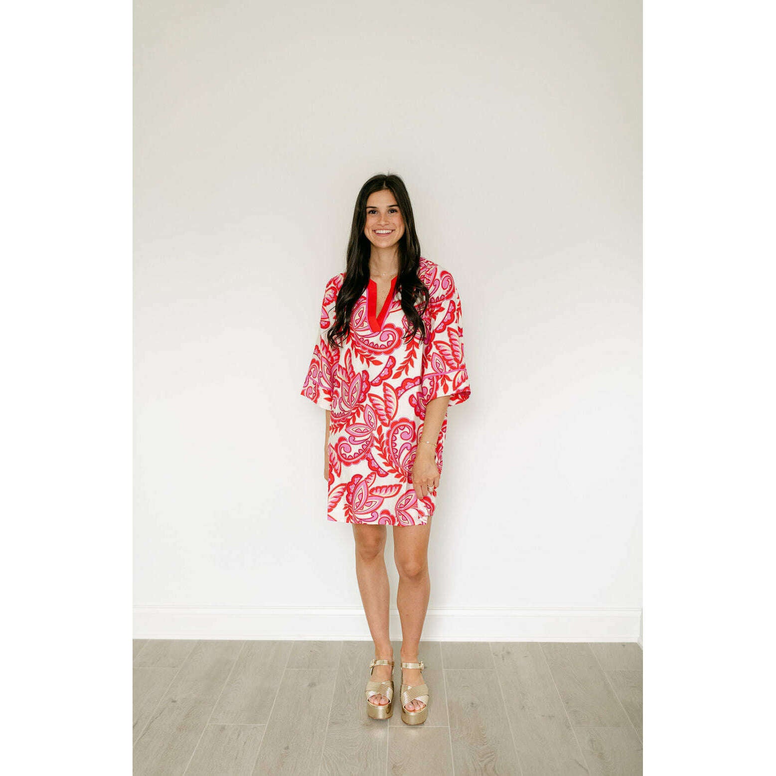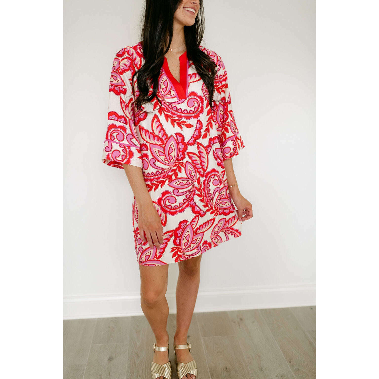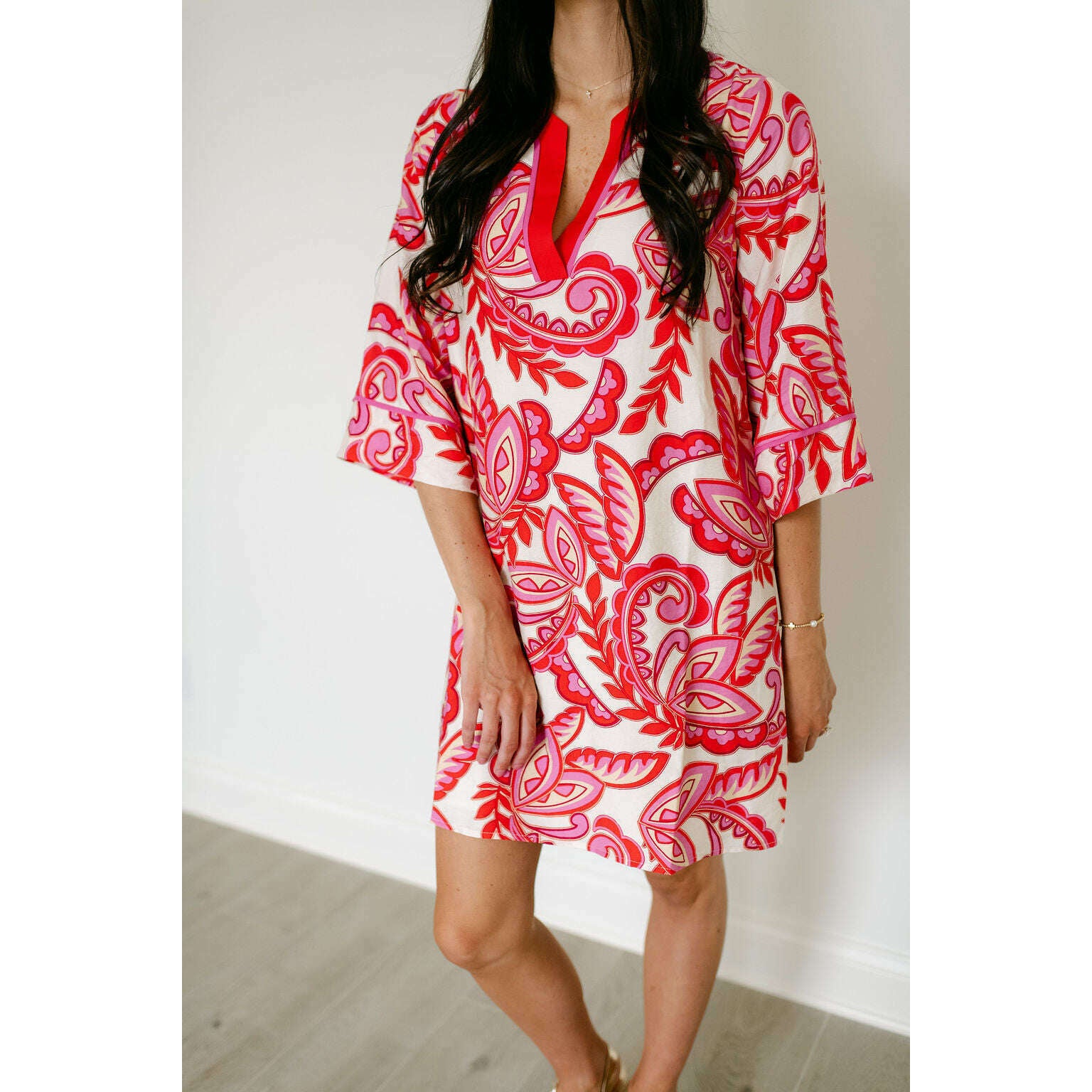 The Jade Melody Tam Red Paisley Trimmed Tunic Dress brings vibrant style to your warm-weather wardrobe with its eye-catching red paisley trim and comfortable tunic silhouette. Perfect for spring and summer adventures, this fun piece effortlessly transitions from casual outings to relaxed gatherings.