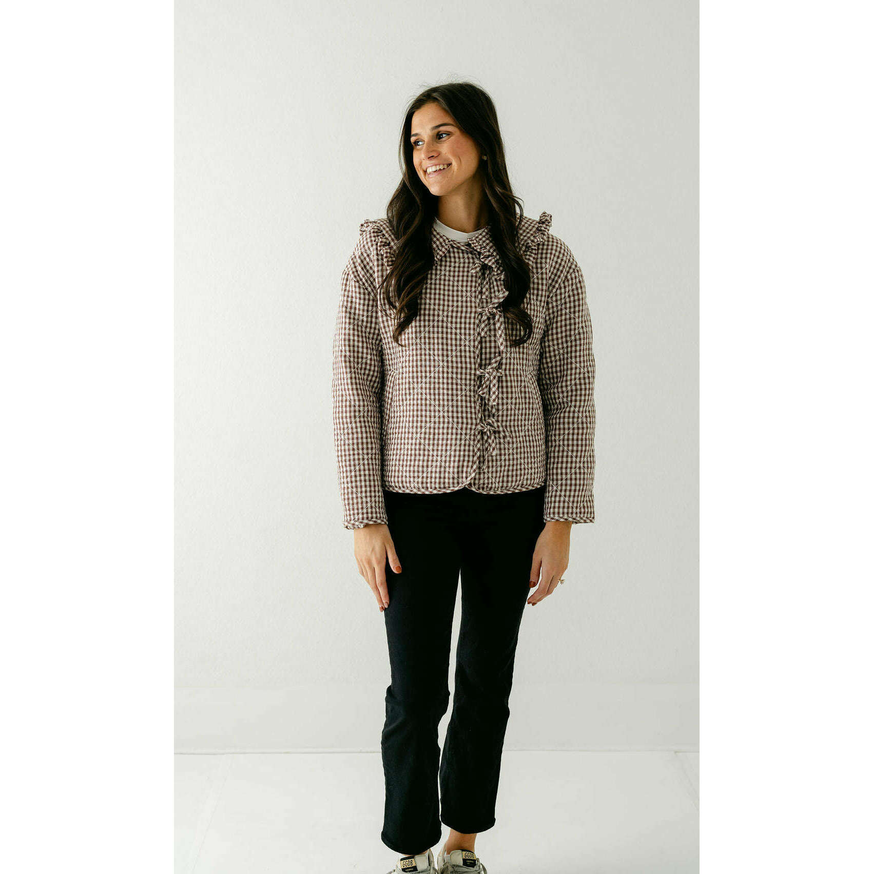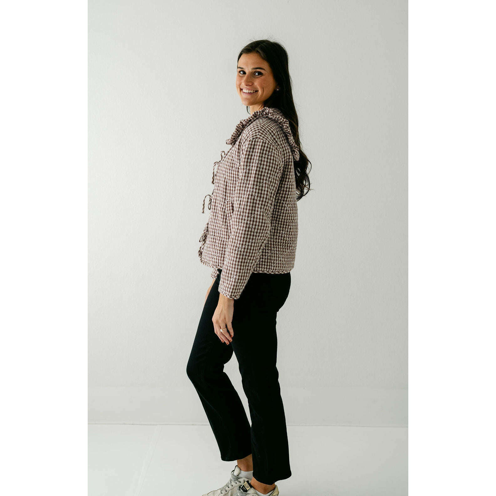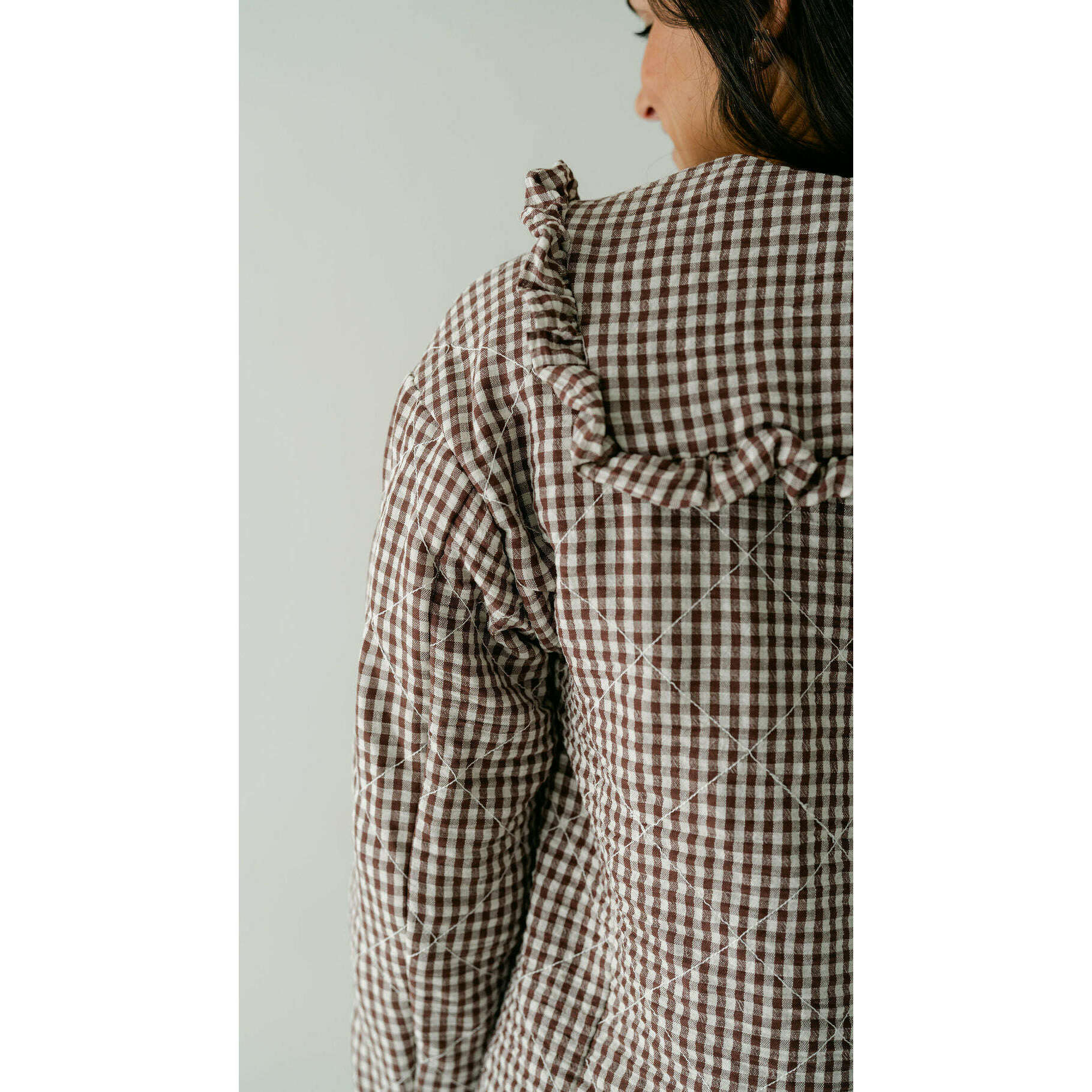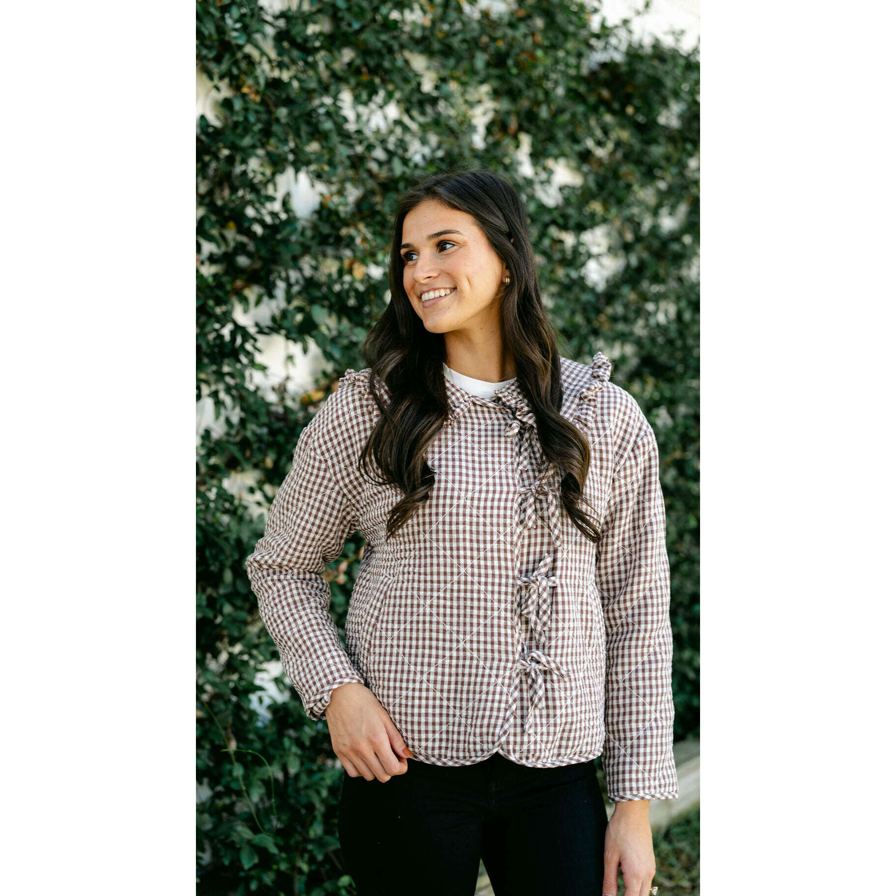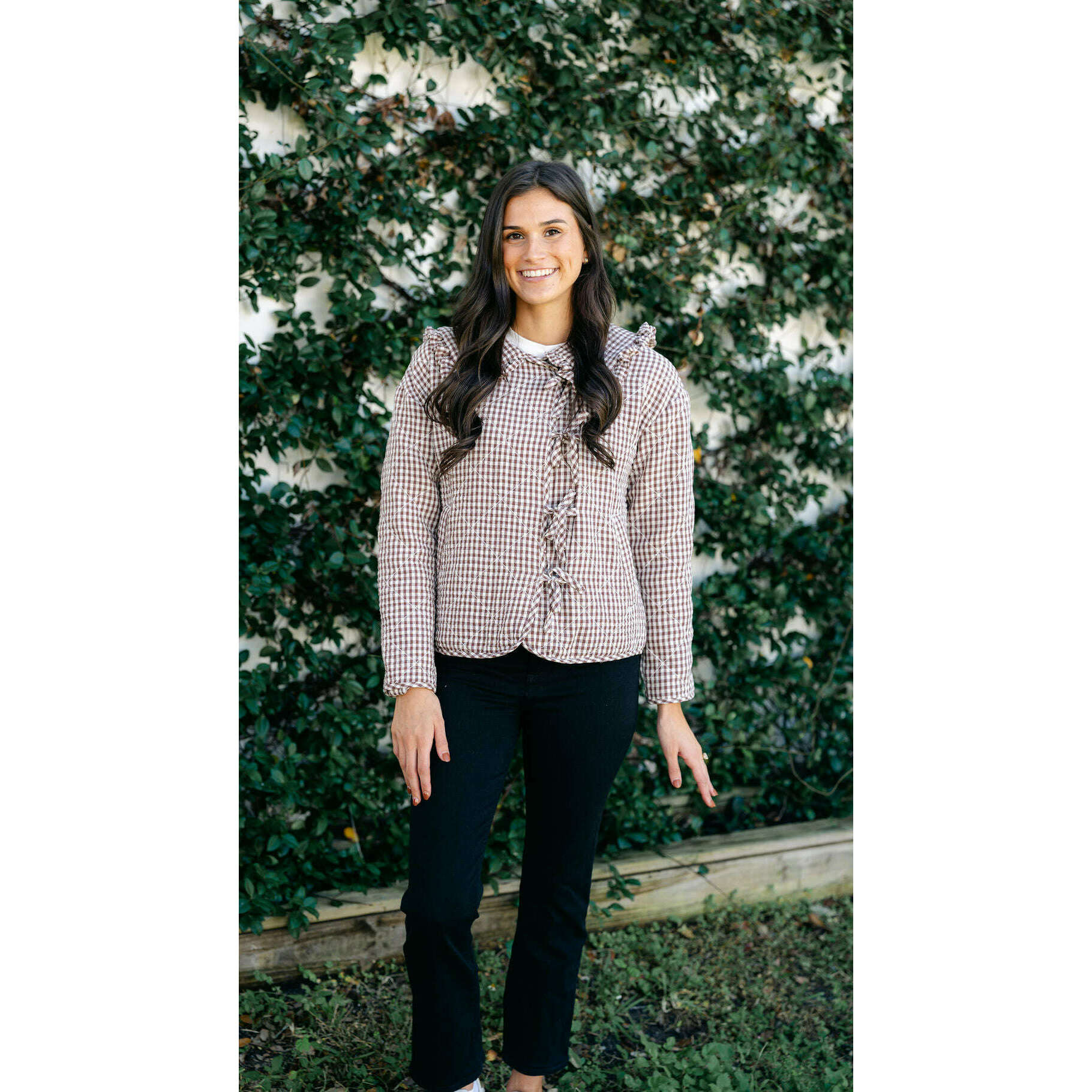 The Karlie Brown Gingham Collar Novelty Jacket combines charming gingham detailing with a flattering silhouette that effortlessly elevates any wardrobe. This adorable piece features a rich brown tone and distinctive collar design that makes it the perfect statement layer for anyone seeking style with personality.