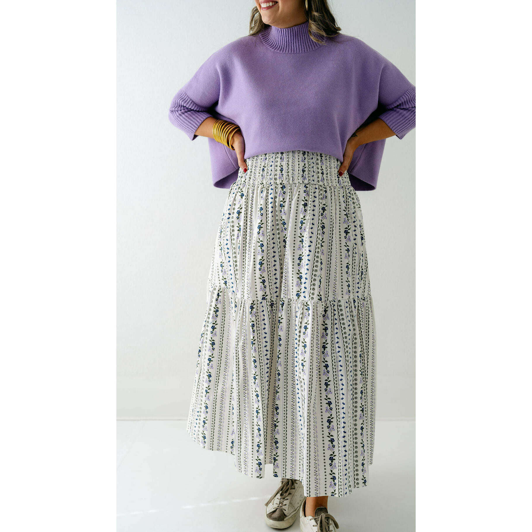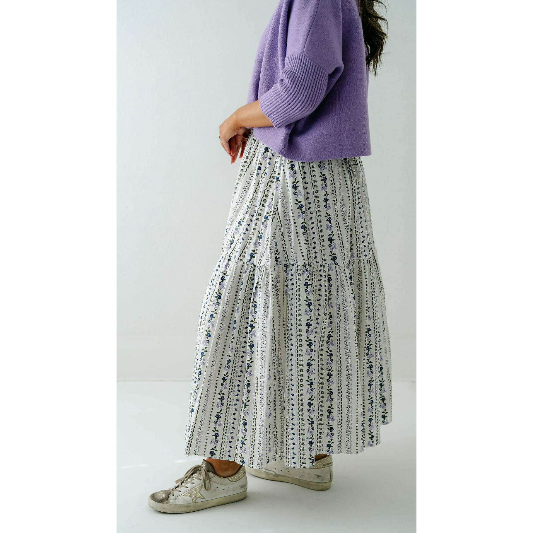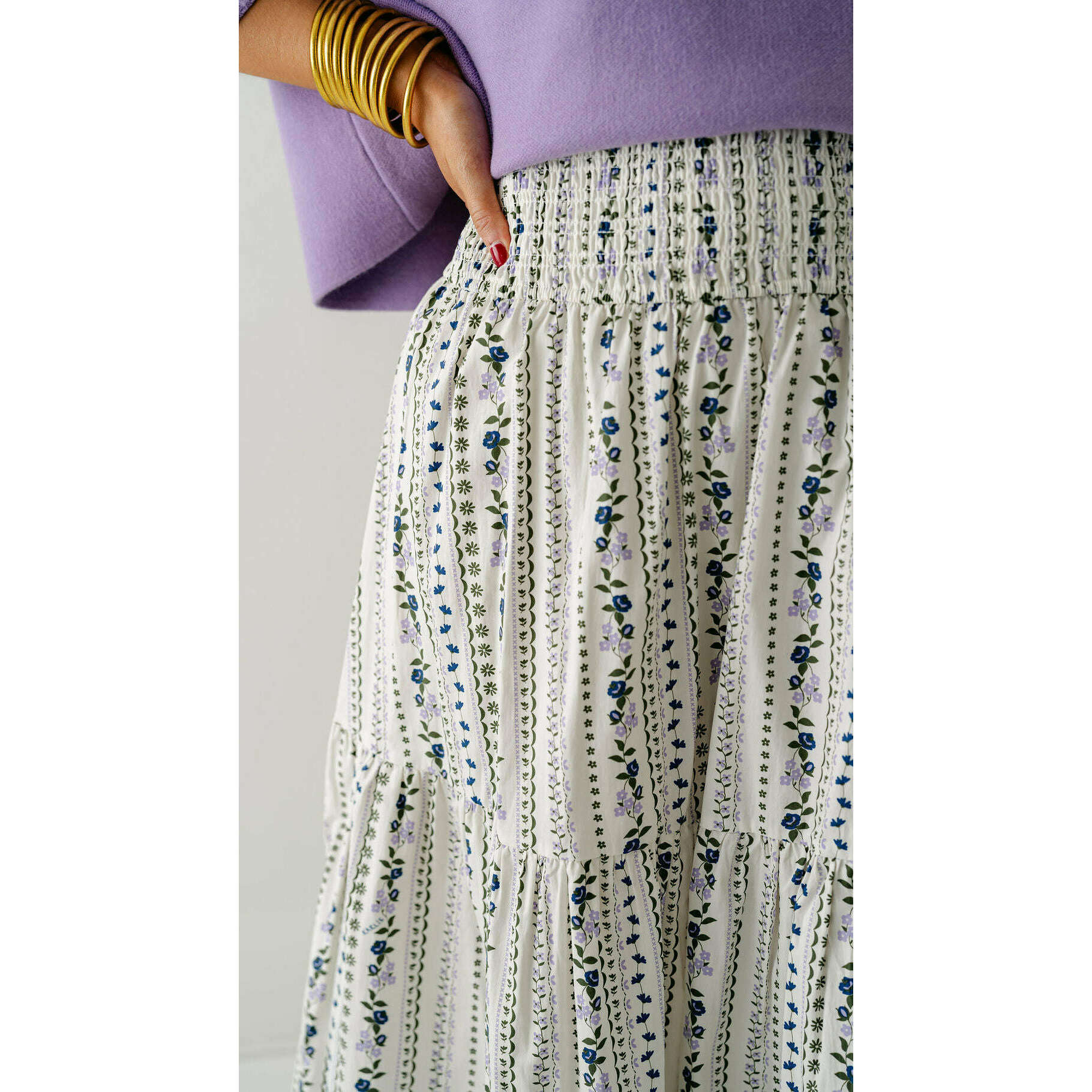 Fall in love with this Karlie French floral tiered maxi skirt, where delicate florals meet impeccable tailoring for a look that's both romantic and refined. The cascading tiers create stunning movement and dimension while hugging your curves in all the right ways, making it impossible to resist.