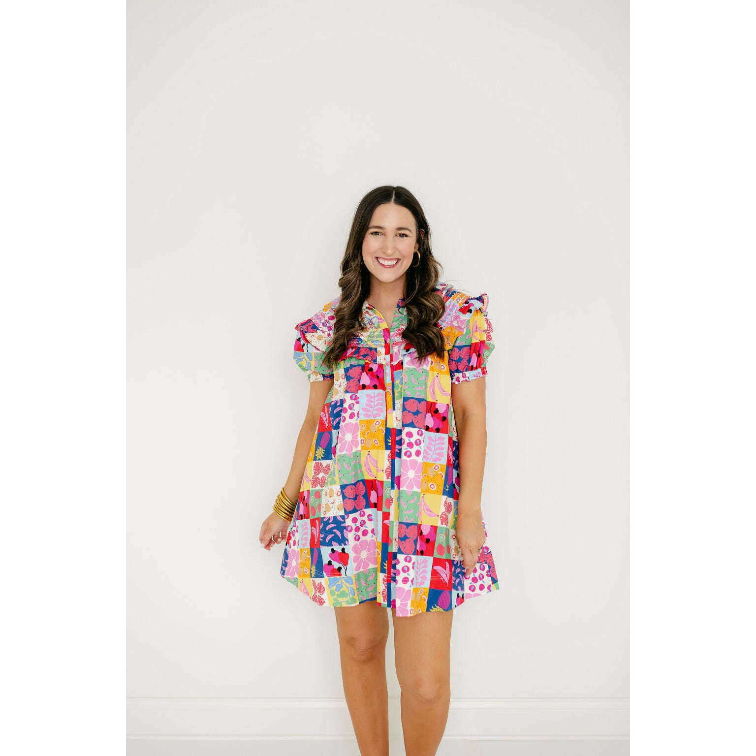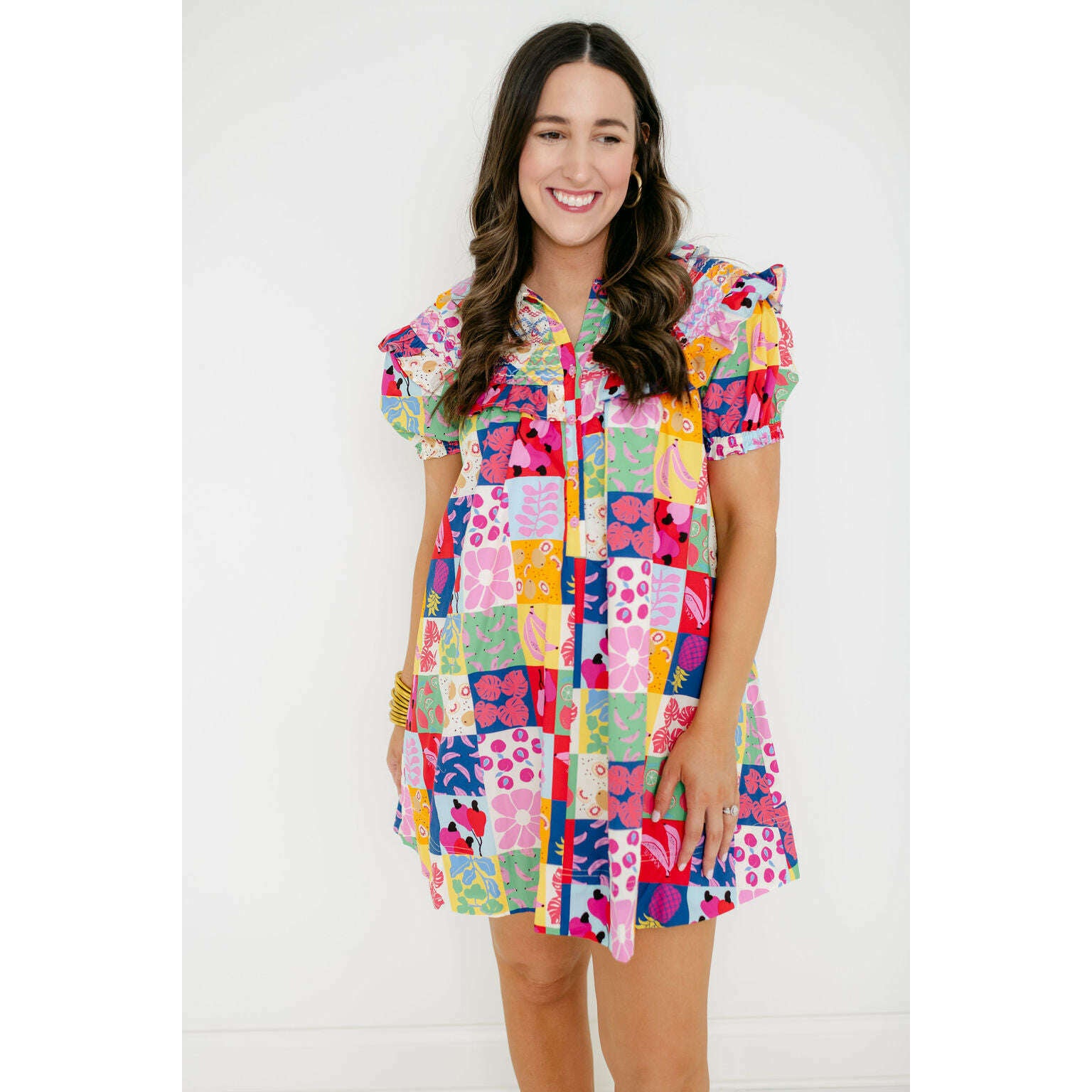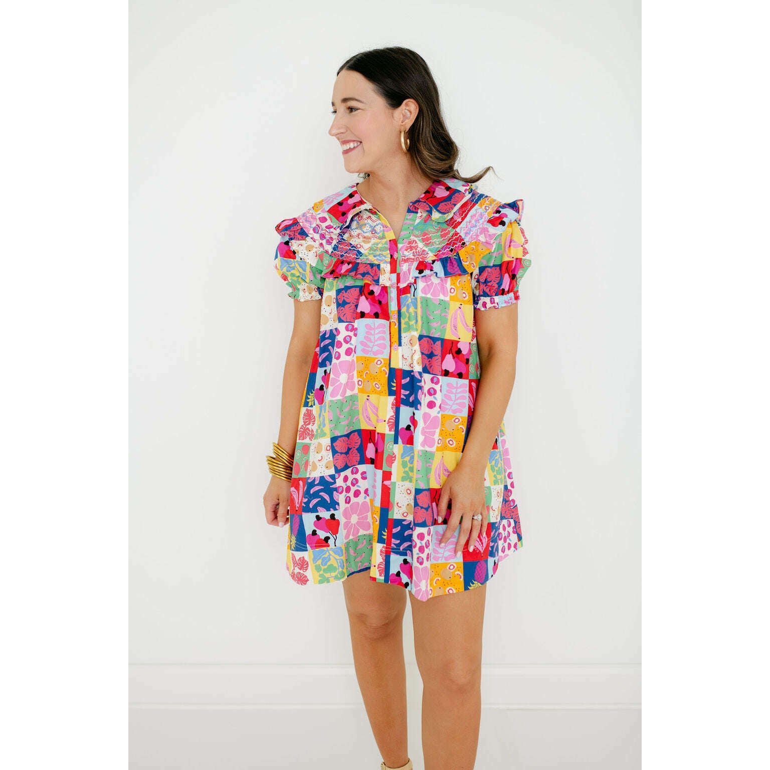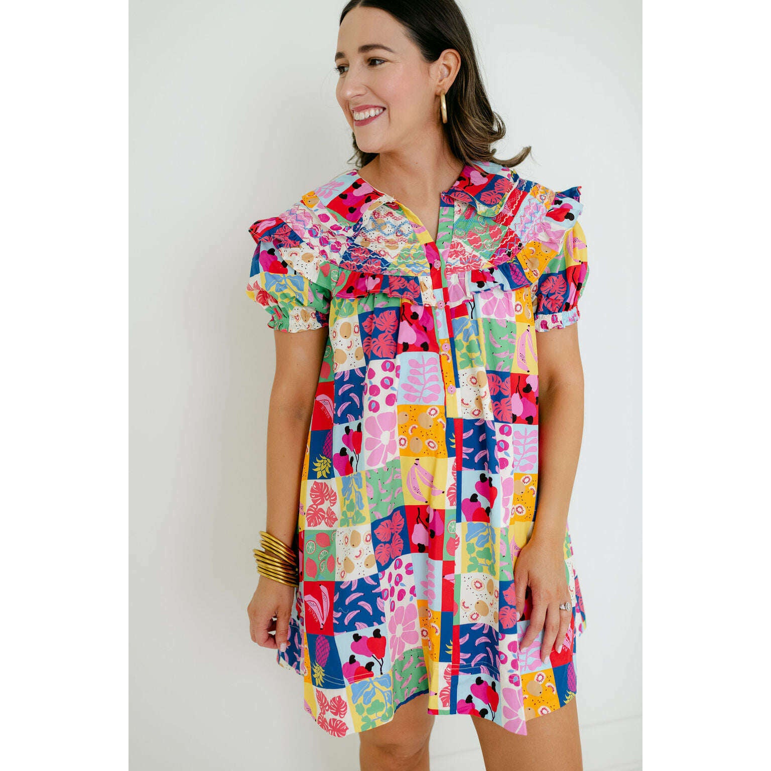 The Karlie Fruit Peter Pan Multi Stitch Dress is a fun wardrobe staple with a colorful fruit print and classic Peter Pan collar. It's perfect for spring and summer, giving you an easy way to add some personality to your everyday look.