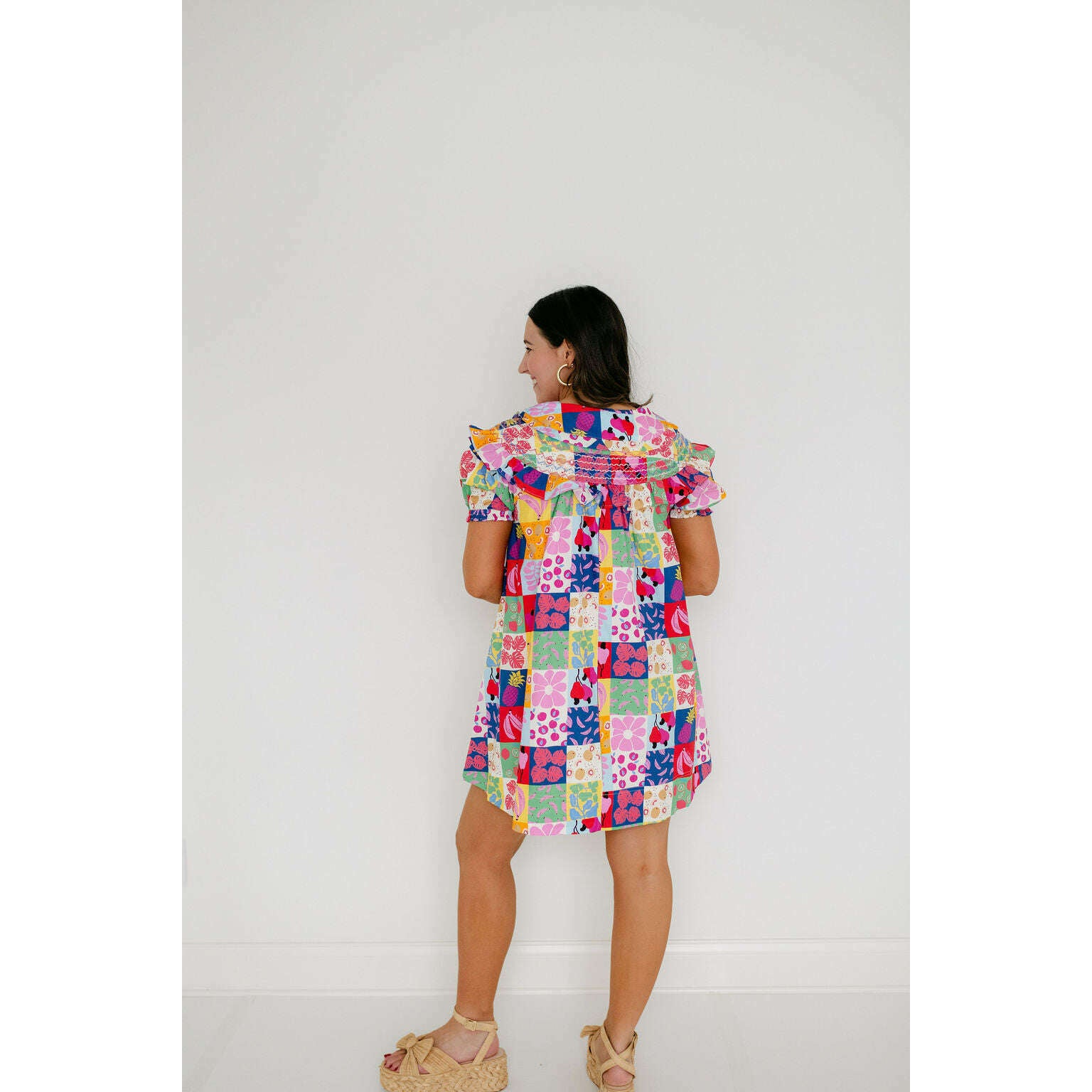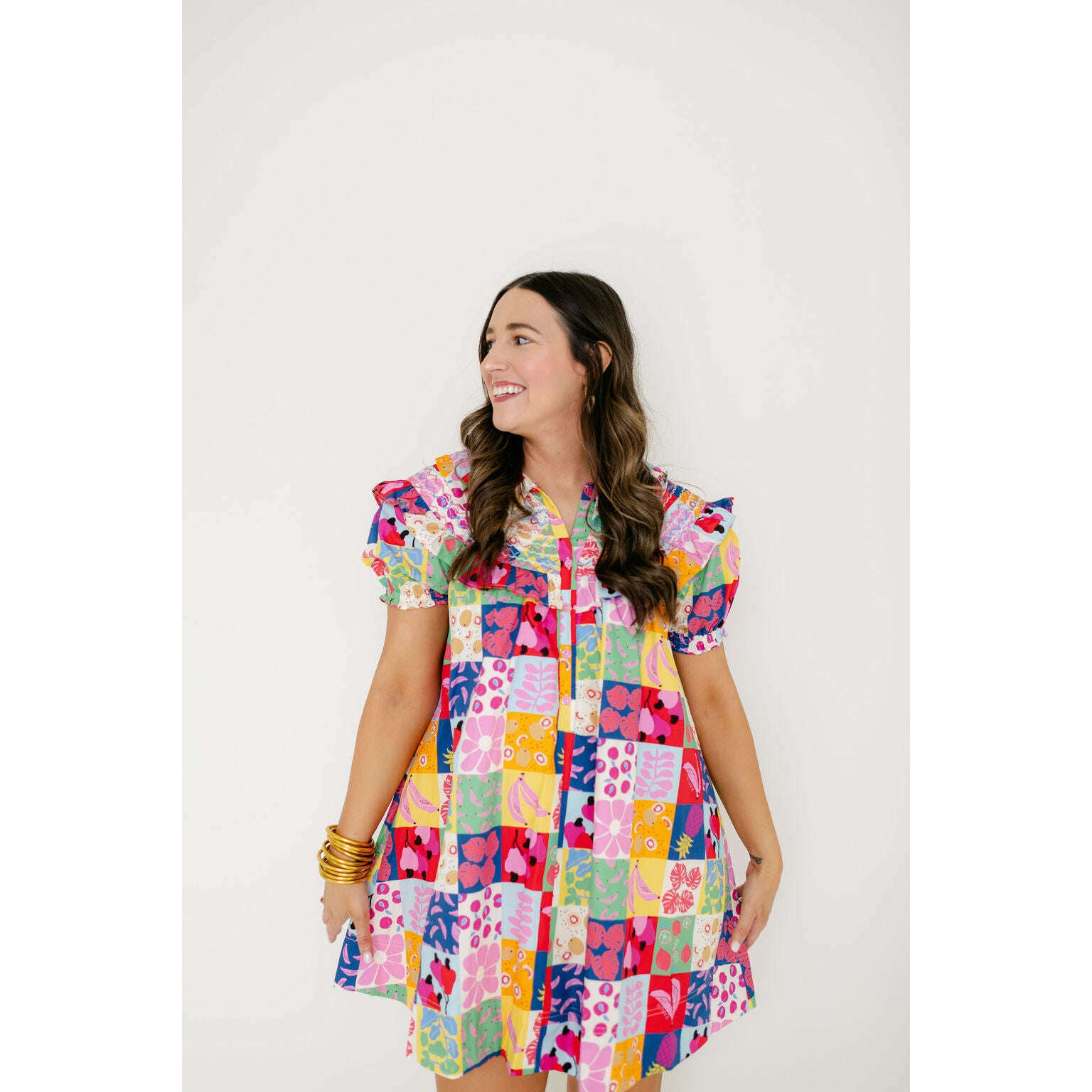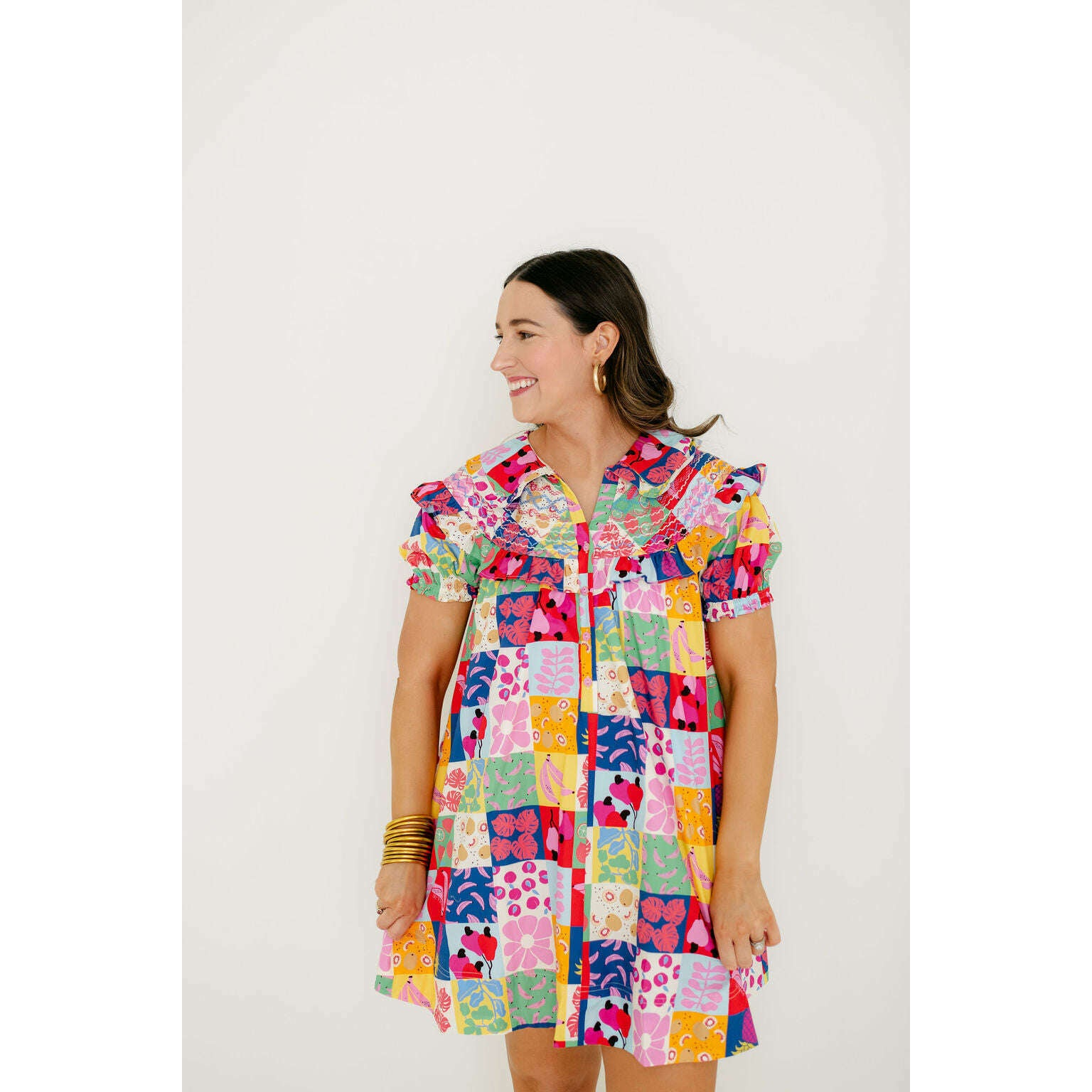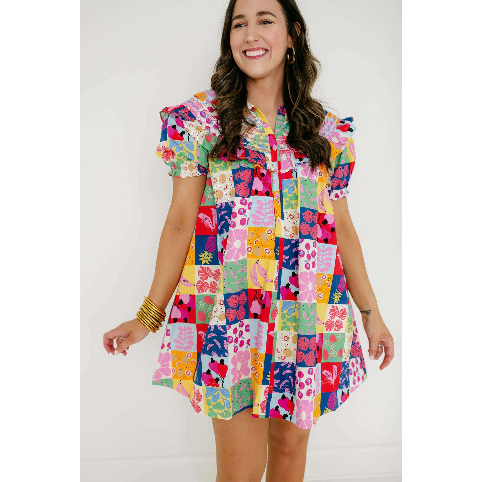 The Karlie Fruit Peter Pan Multi Stitch Dress is a fun wardrobe staple with a colorful fruit print and classic Peter Pan collar. It's perfect for spring and summer, giving you an easy way to add some personality to your everyday look.