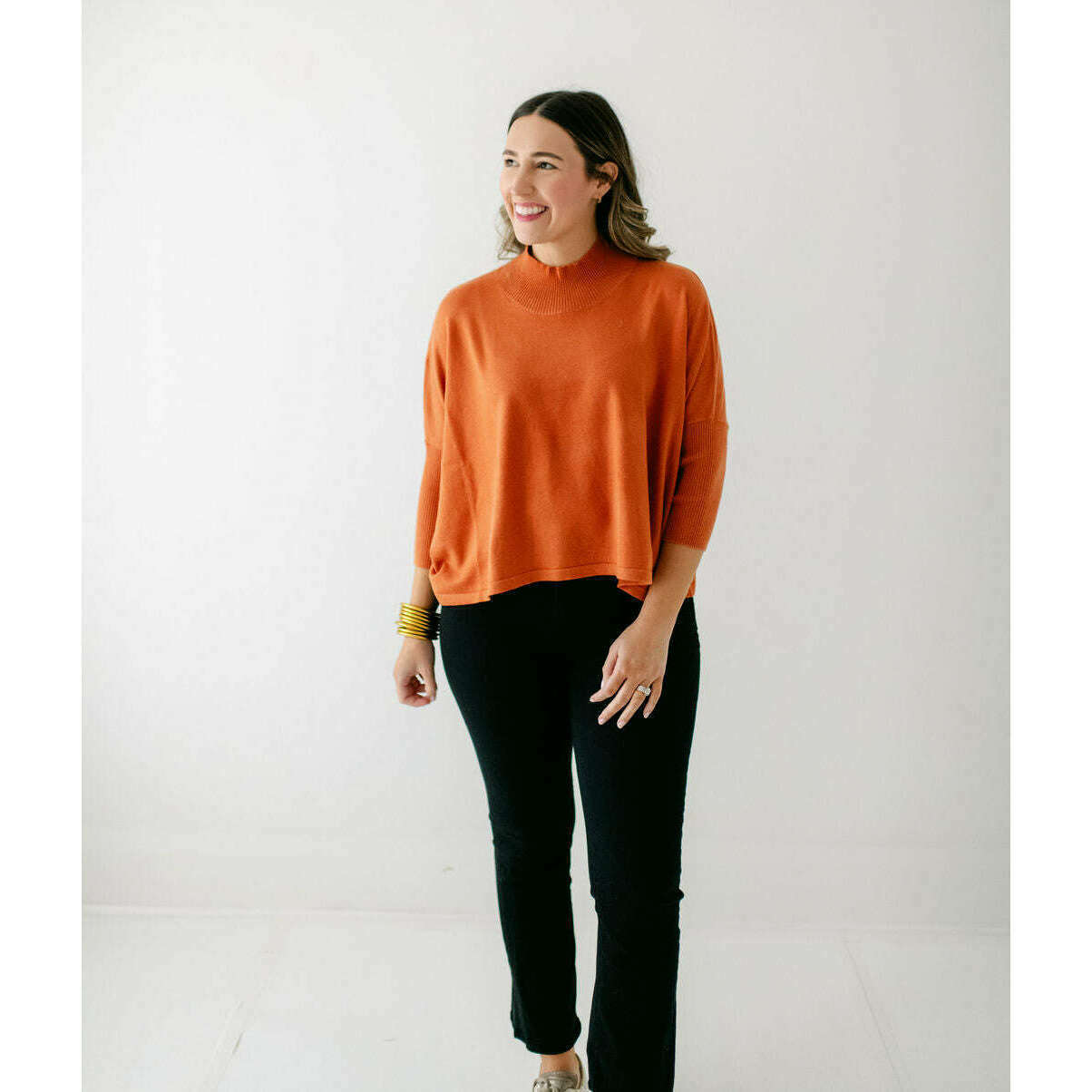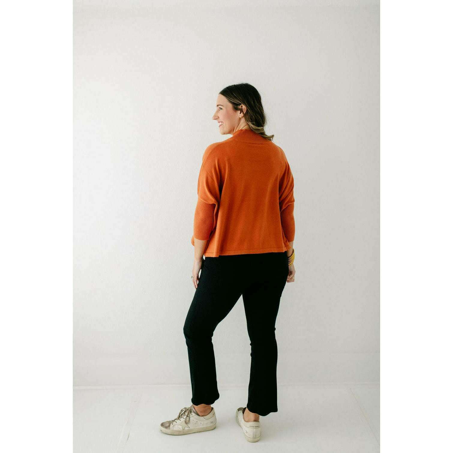 The Kerisma Knits Aja Ortho Solid Top in Rust is back and better than ever. This new version is a thinner, lighter take on our most popular sweater, offering the perfect balance of comfort and style. You'll love how effortlessly it layers or stands alone, making it a must-have for the season.
