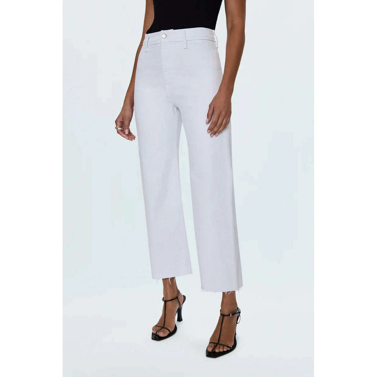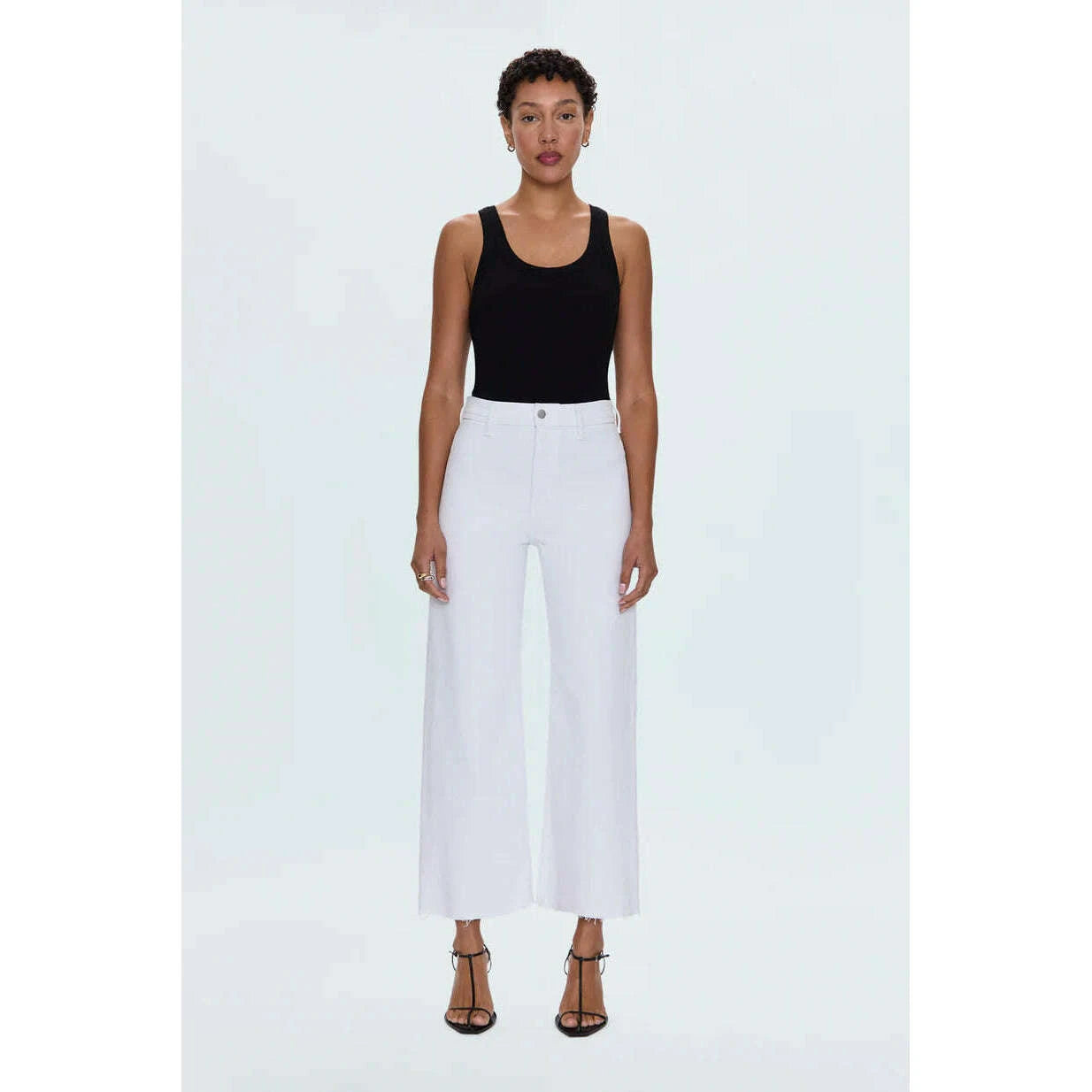 The white jean that changes everything. Penny Crop commands attention with a high-rise waist and wide leg silhouette that flows to a perfectly cropped ankle length, finished with a 27" inseam. Designed with no front pockets and no outer seams for a seamless, clean silhouette. The double-stitched waistline adds structural detail while the scissor-cut hems bring raw edge appeal. Crafted from our signature comfort stretch denim in Blizzard, a crisp white wash.