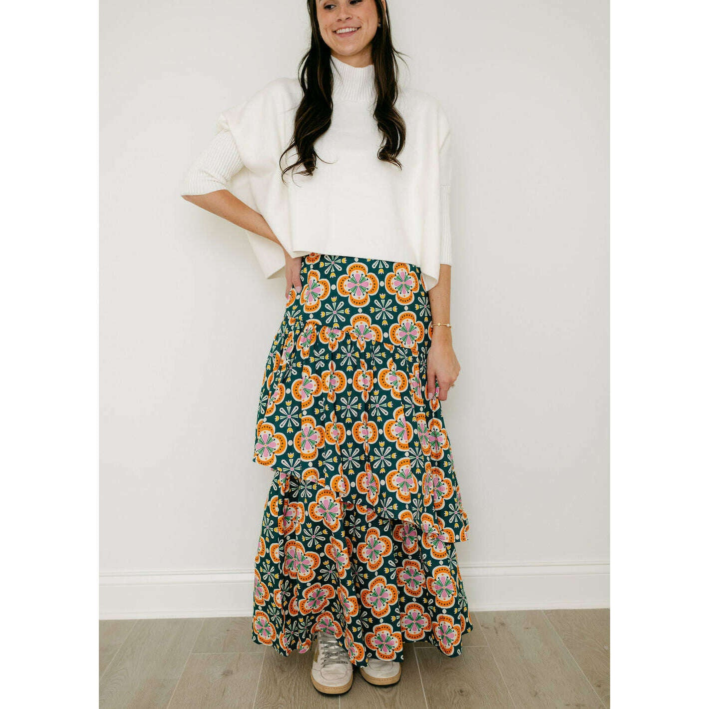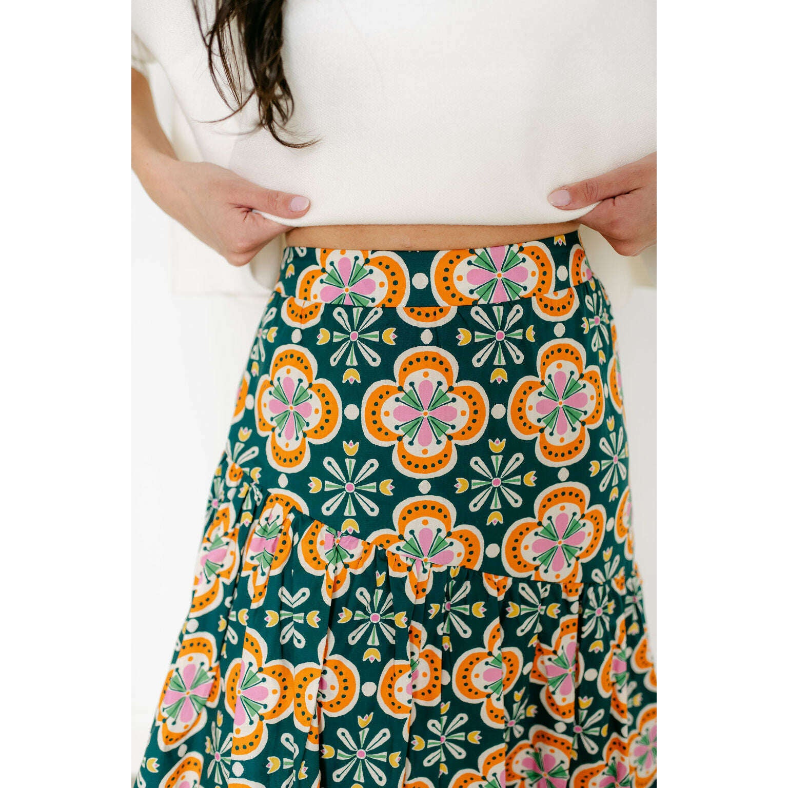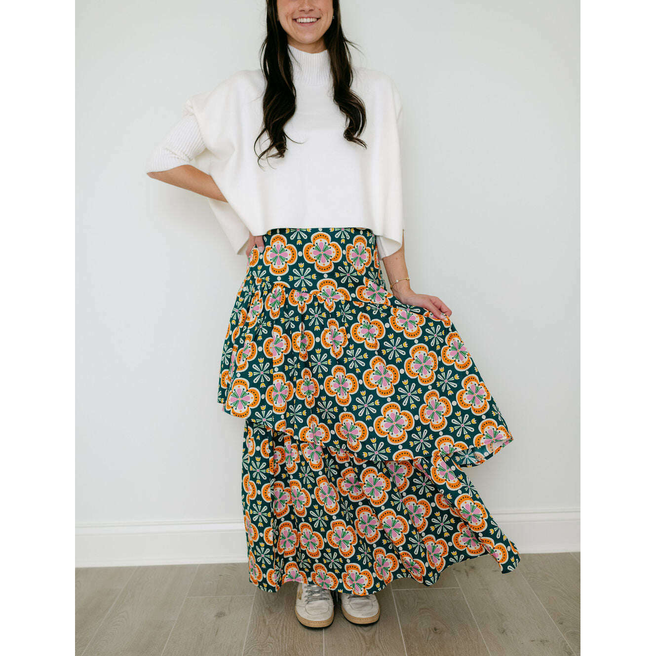 The Sincerely Ours Celeste Maxi Skirt in Clementine Tile brings effortless style with its vibrant print and charming tiered layers that create beautiful movement with every step. Pair it with our Kerisma white aja for a fresh, put-together look that's perfect for any occasion.