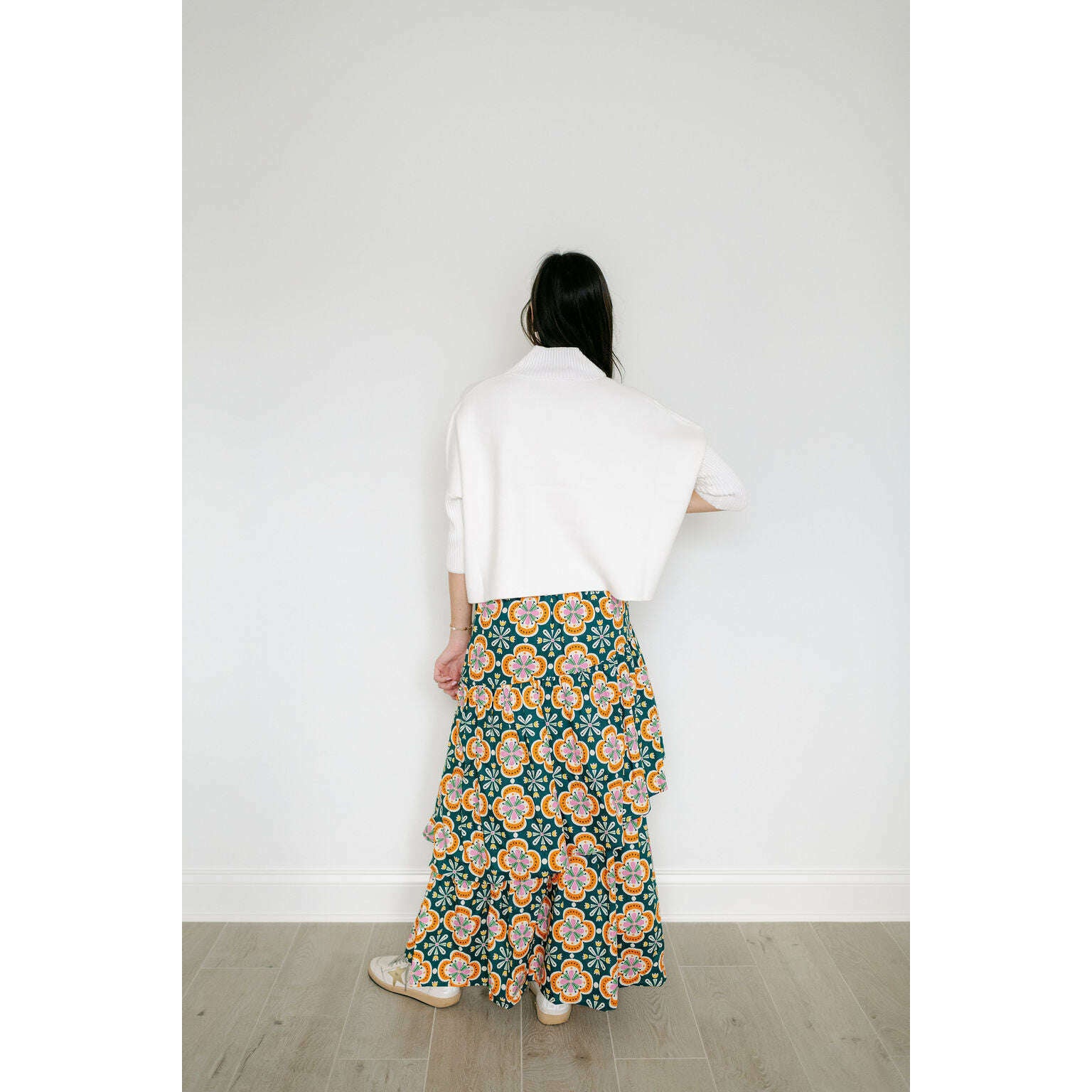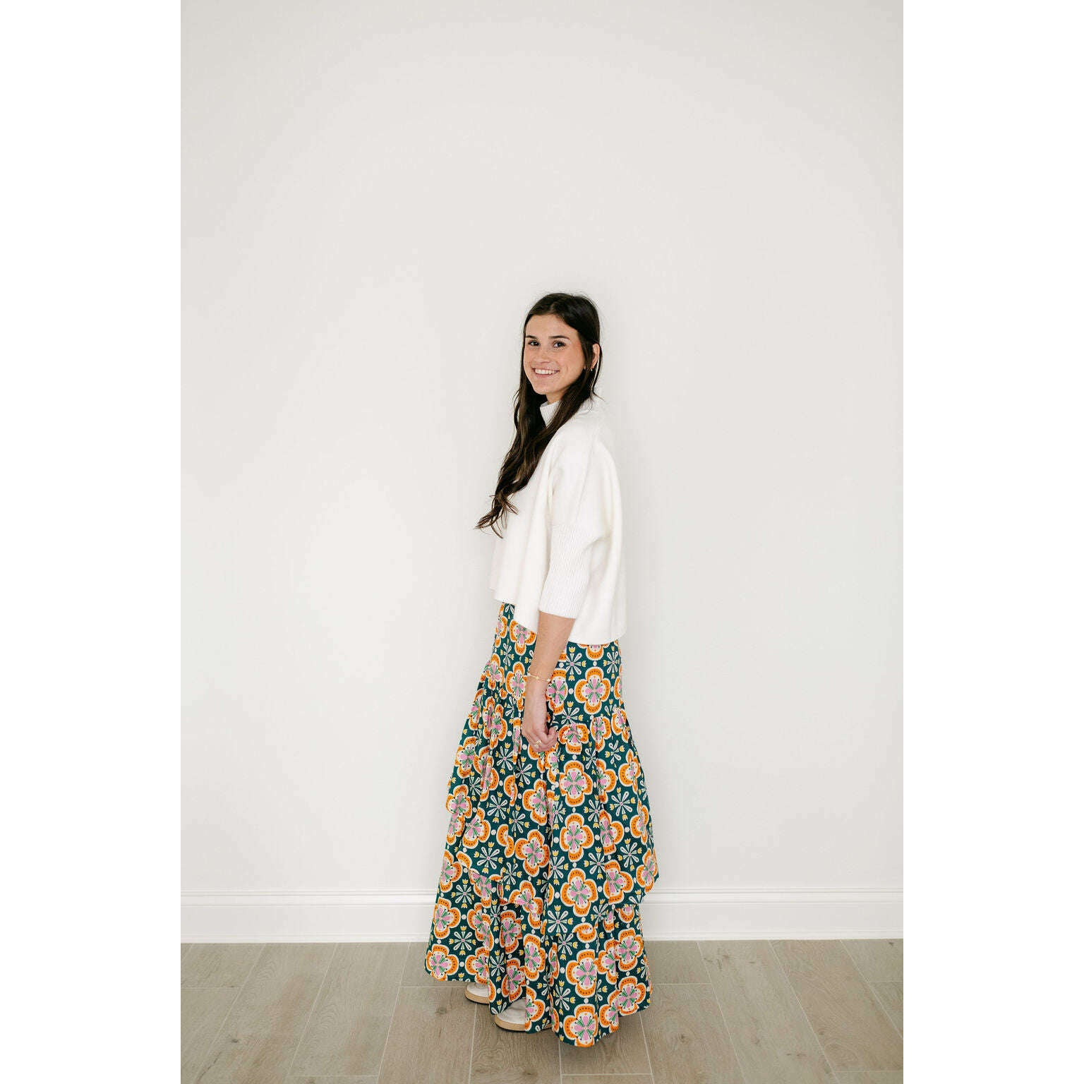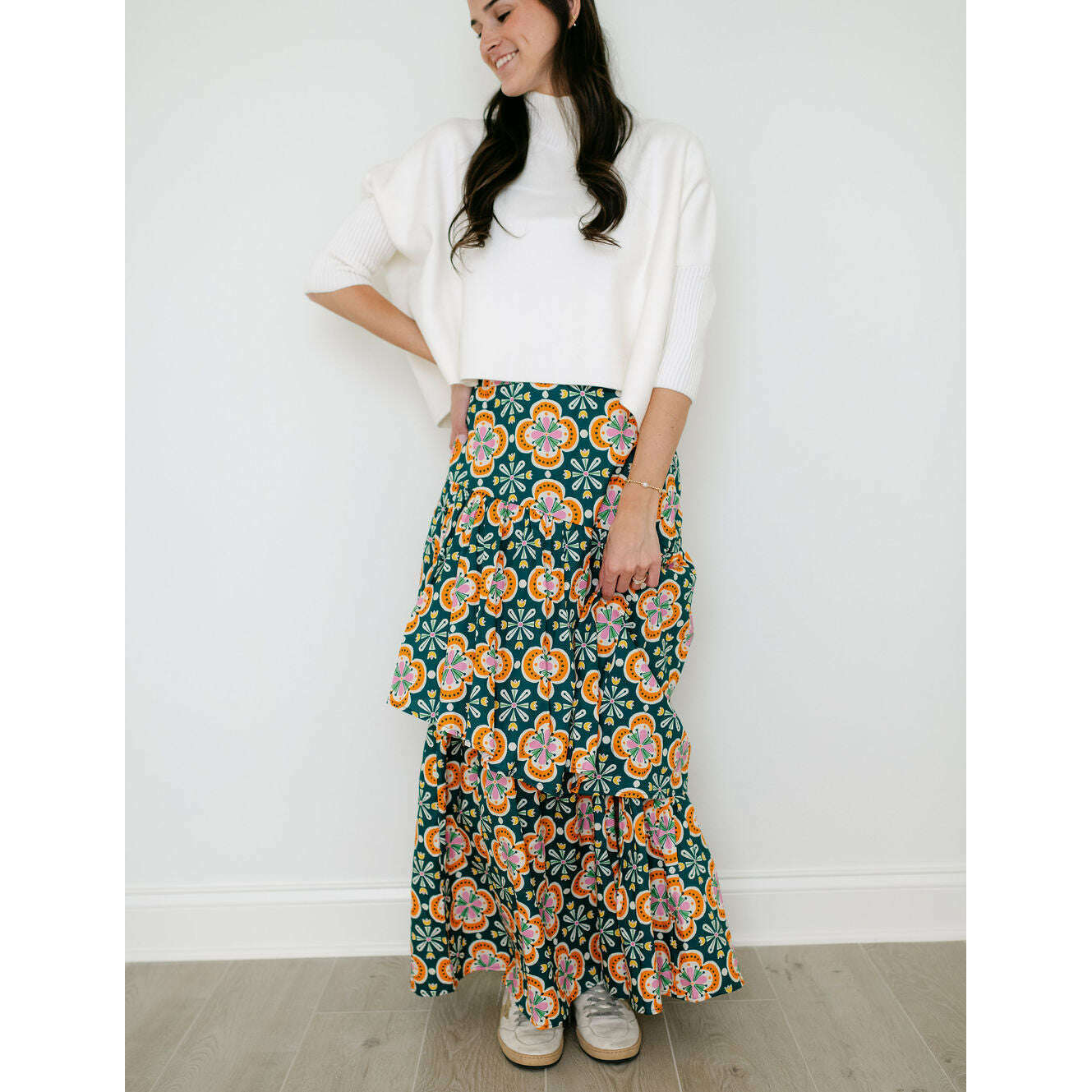 The Sincerely Ours Celeste Maxi Skirt in Clementine Tile brings effortless style with its vibrant print and charming tiered layers that create beautiful movement with every step. Pair it with our Kerisma white aja for a fresh, put-together look that's perfect for any occasion.