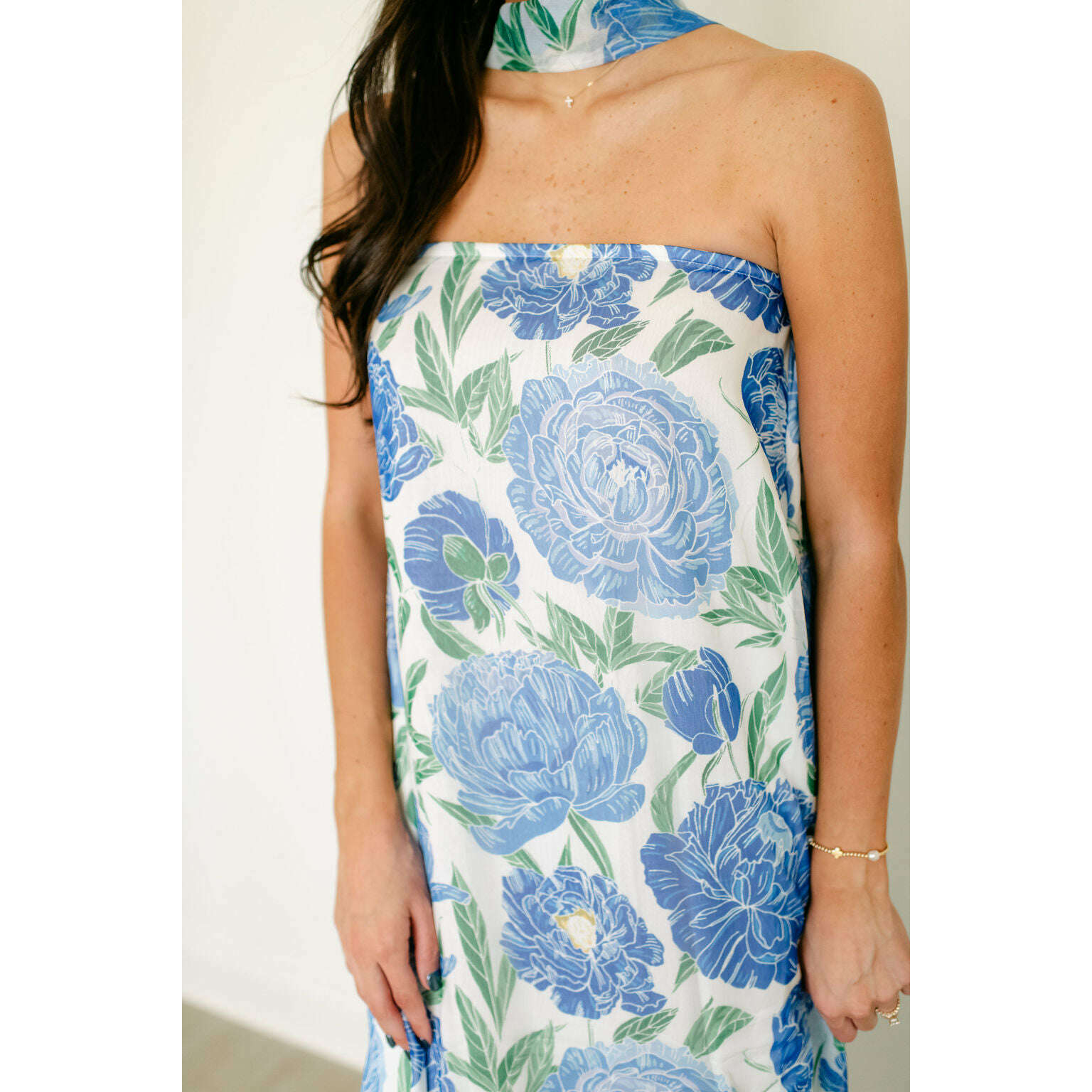 The Audrey Strapless Blue Floral Maxi Scarf Dress