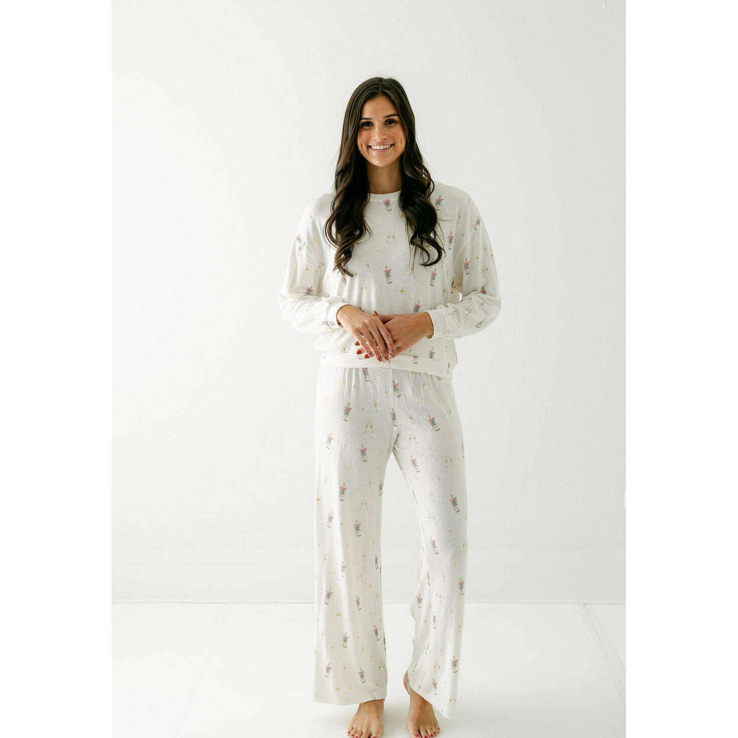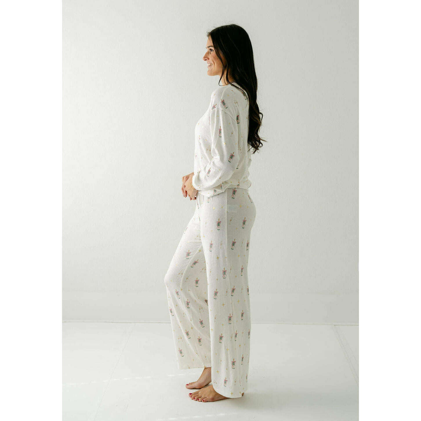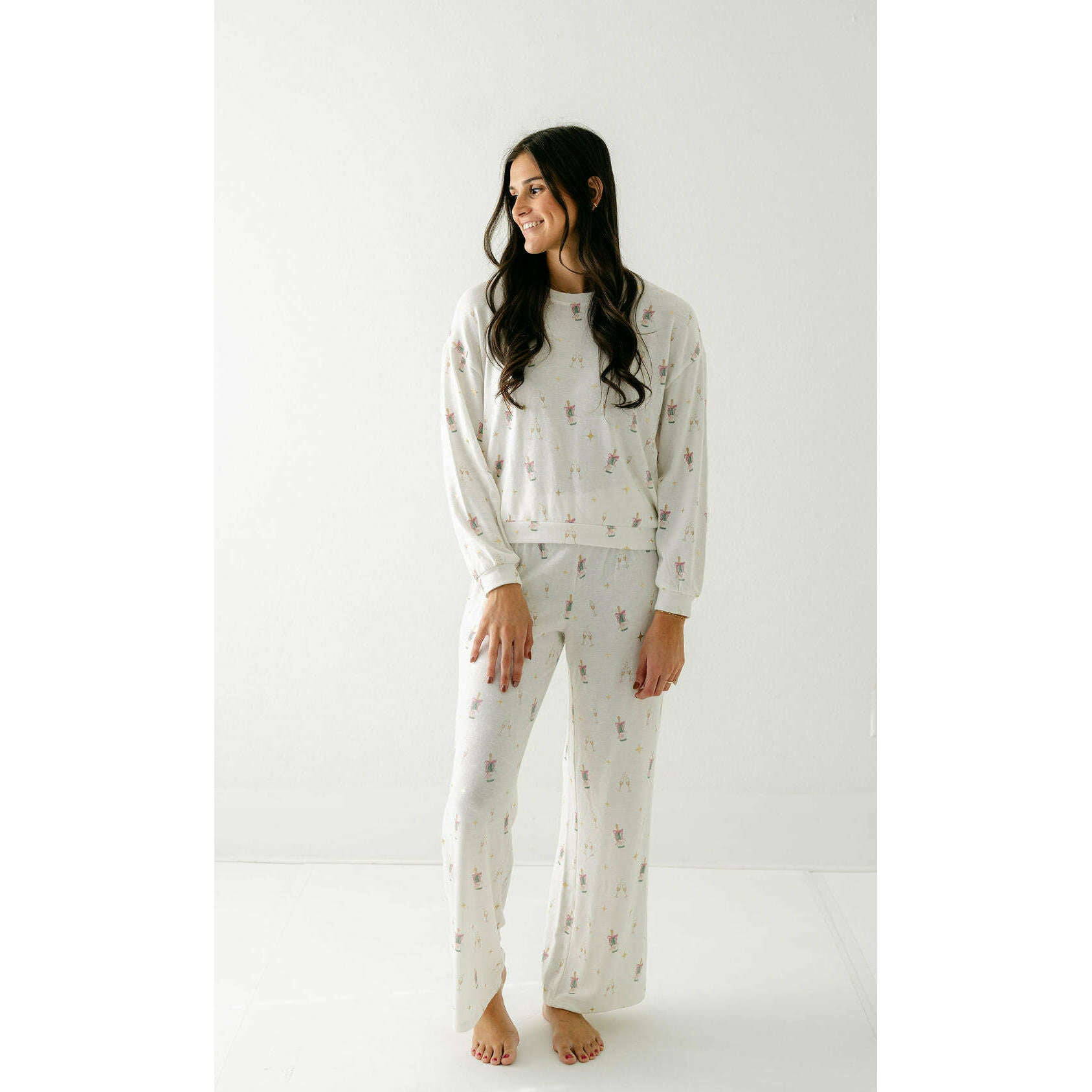 Printed with an allover champagne toast motif, this soft slub knit top blends fun and function. Relaxed and comfy, it’s made for sleep-ins, couch hangs, and slow holiday mornings.
