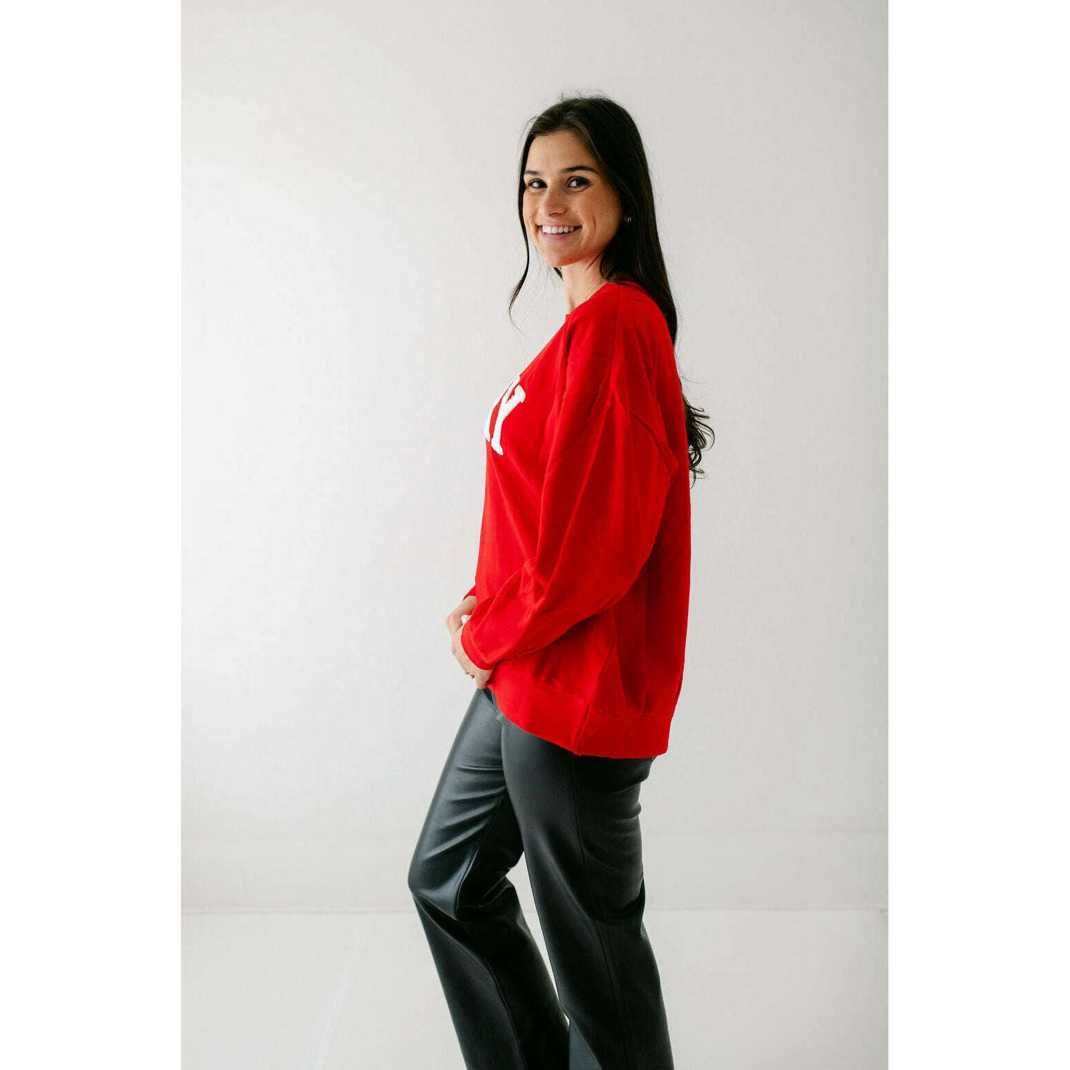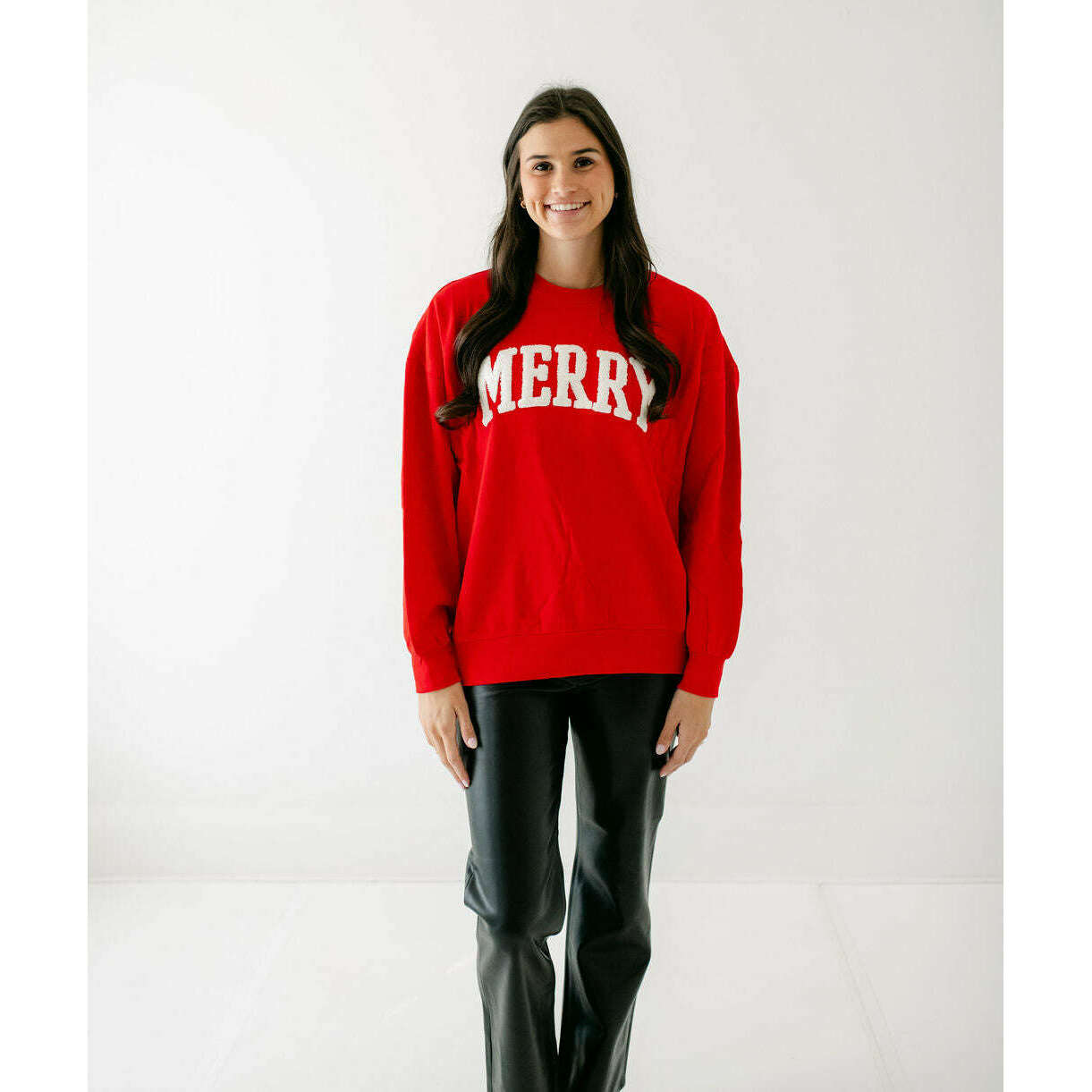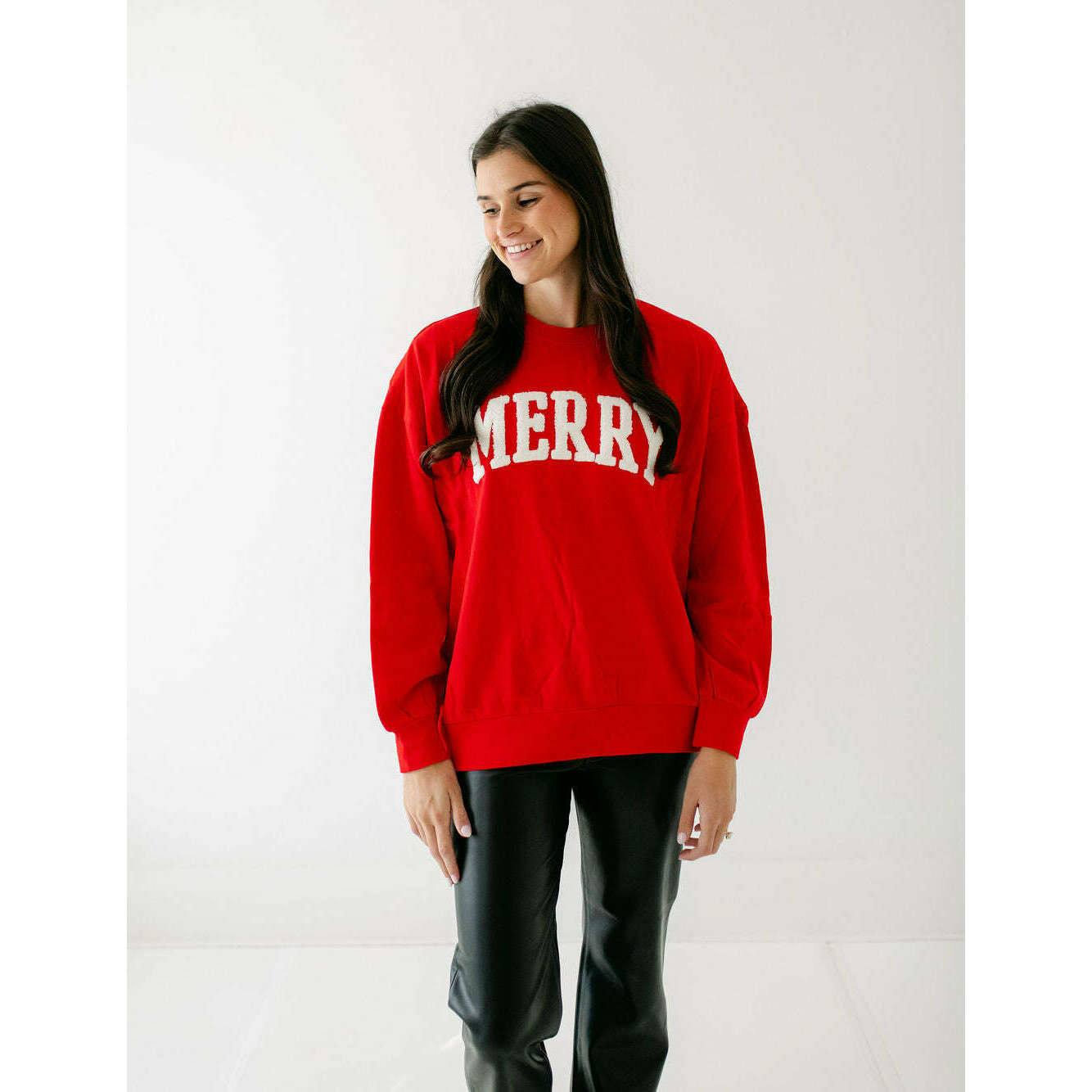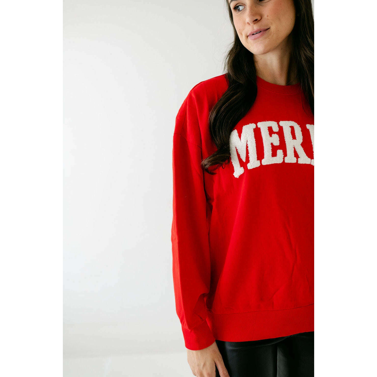 Made from mid-weight cotton fleece, this oversized sweatshirt delivers warmth and softness from the first wear. A statement “Merry” graphic in boucle appliqué gives it a festive finish, designed to stand out in her seasonal rotation.