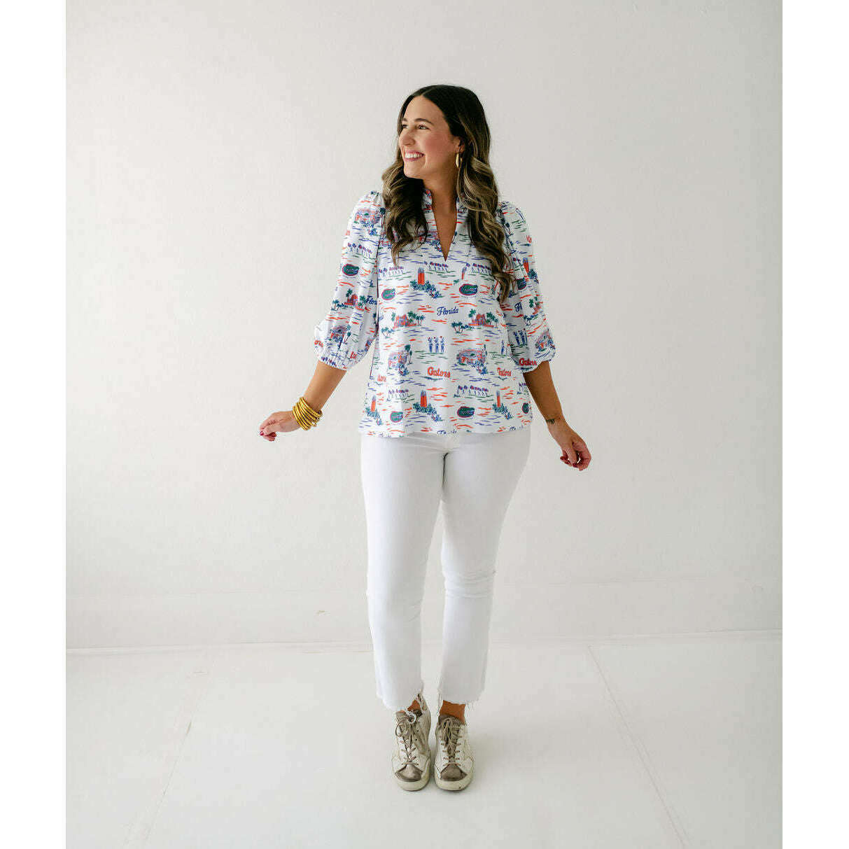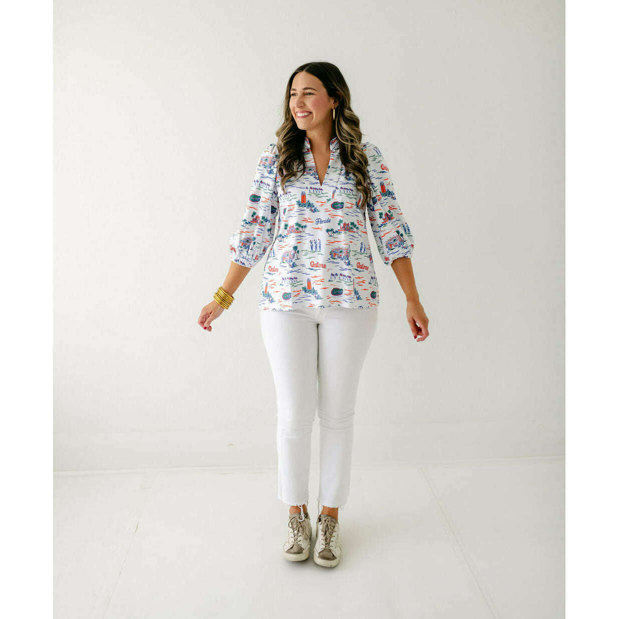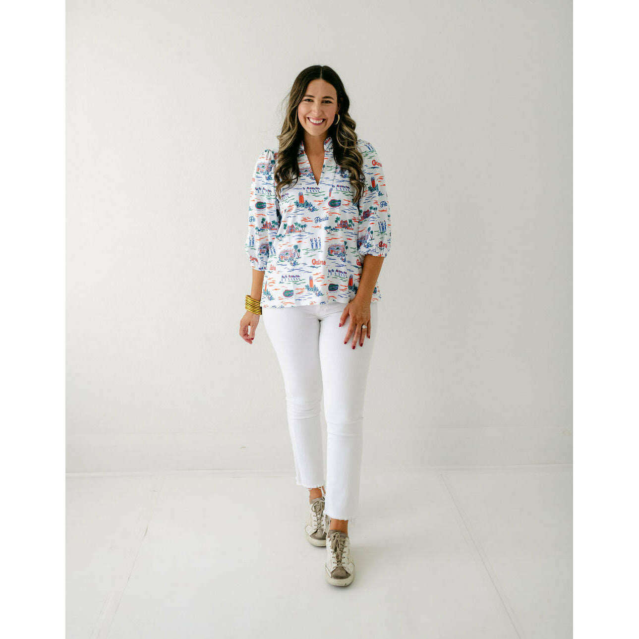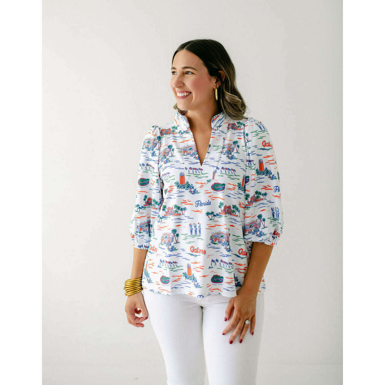 The Smith & Quinn Eliza Top in Florida Toile is perfect for game day style. Its charming print and flattering fit make it an effortless way to show off your team spirit while staying comfortable and chic throughout the event. Elevate your fan look with this irresistibly cute top.