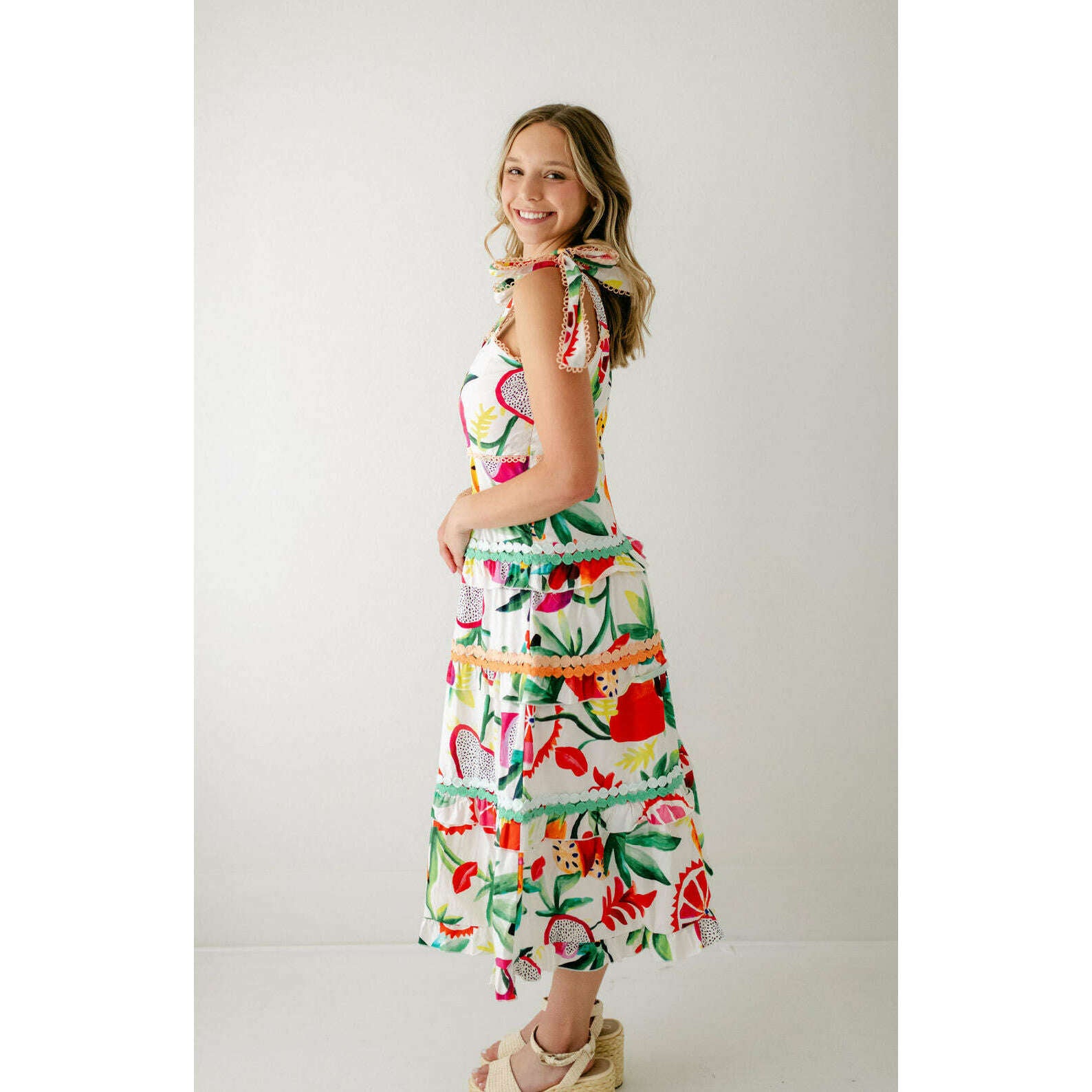 The Marie by Victoria Dunn Naomi Tropical Breeze Maxi Dress is the perfect addition to your summer wardrobe. With its playful print and charming ric rac detailing, this dress is sure to turn heads. Add a touch of fun to your vacation with this cute and fun dress!