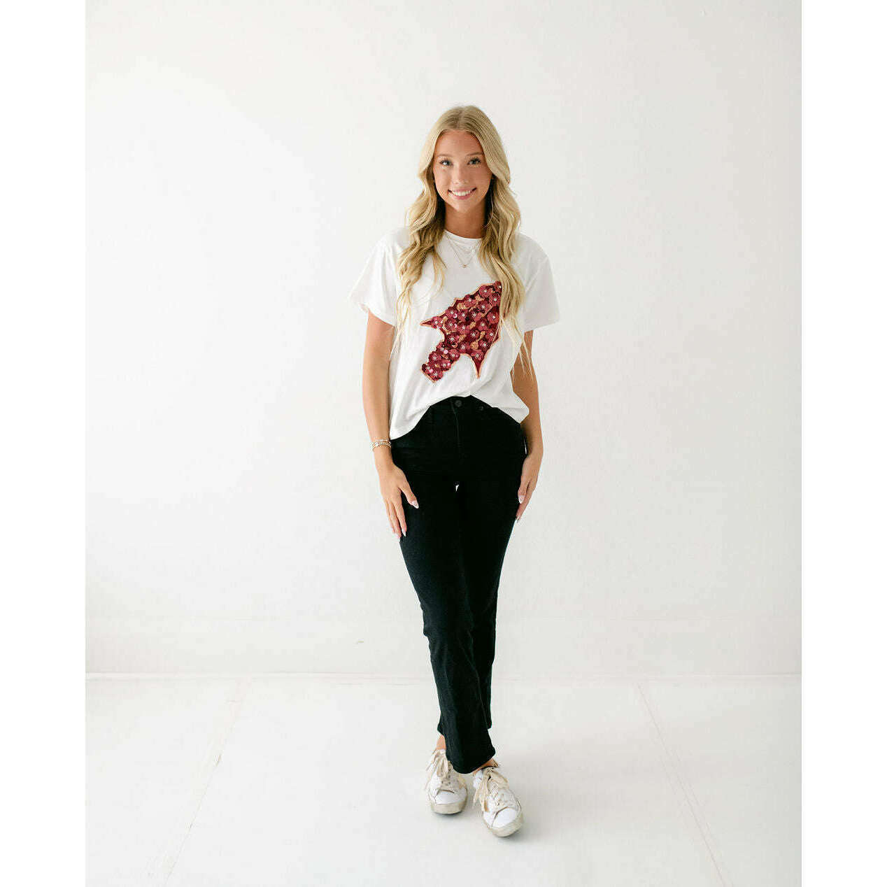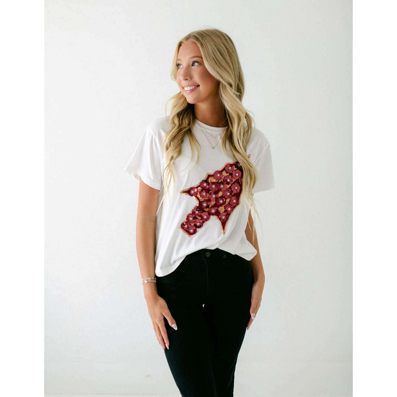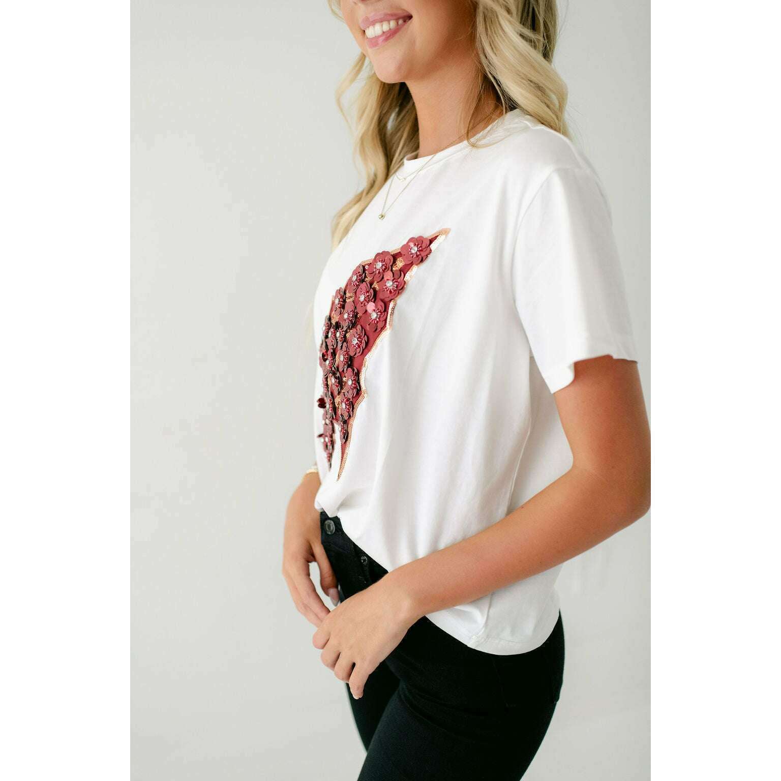 Show your Seminoles pride in style with this Licensed FSU Arrowhead Sequin Flower Tee. Featuring a sparkling jeweled flower design, it effortlessly elevates your game day look. Pair it with a skirt for a chic outfit or dress it down with denim for casual comfort. Perfect for football season, this tee combines team spirit with a touch of glamour.