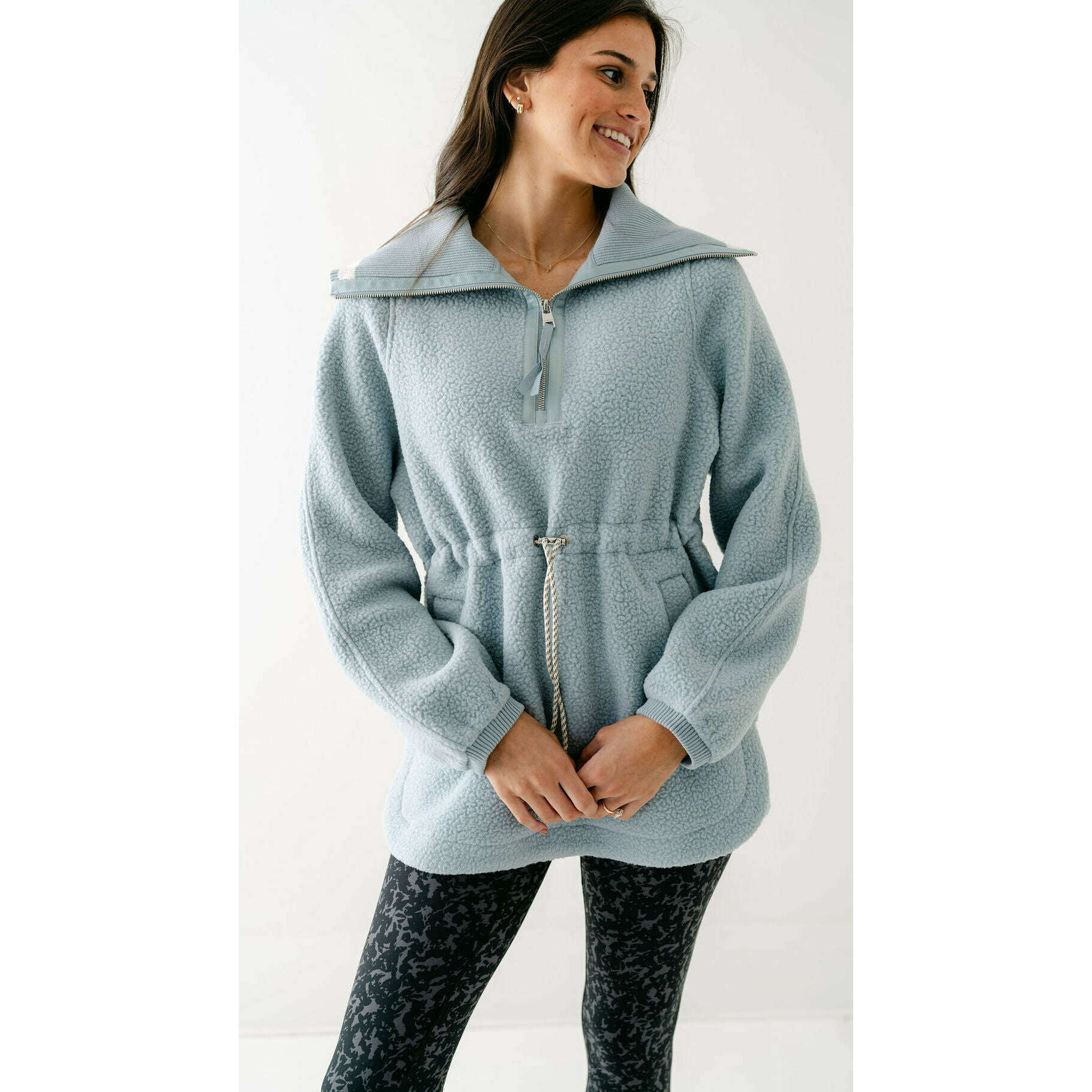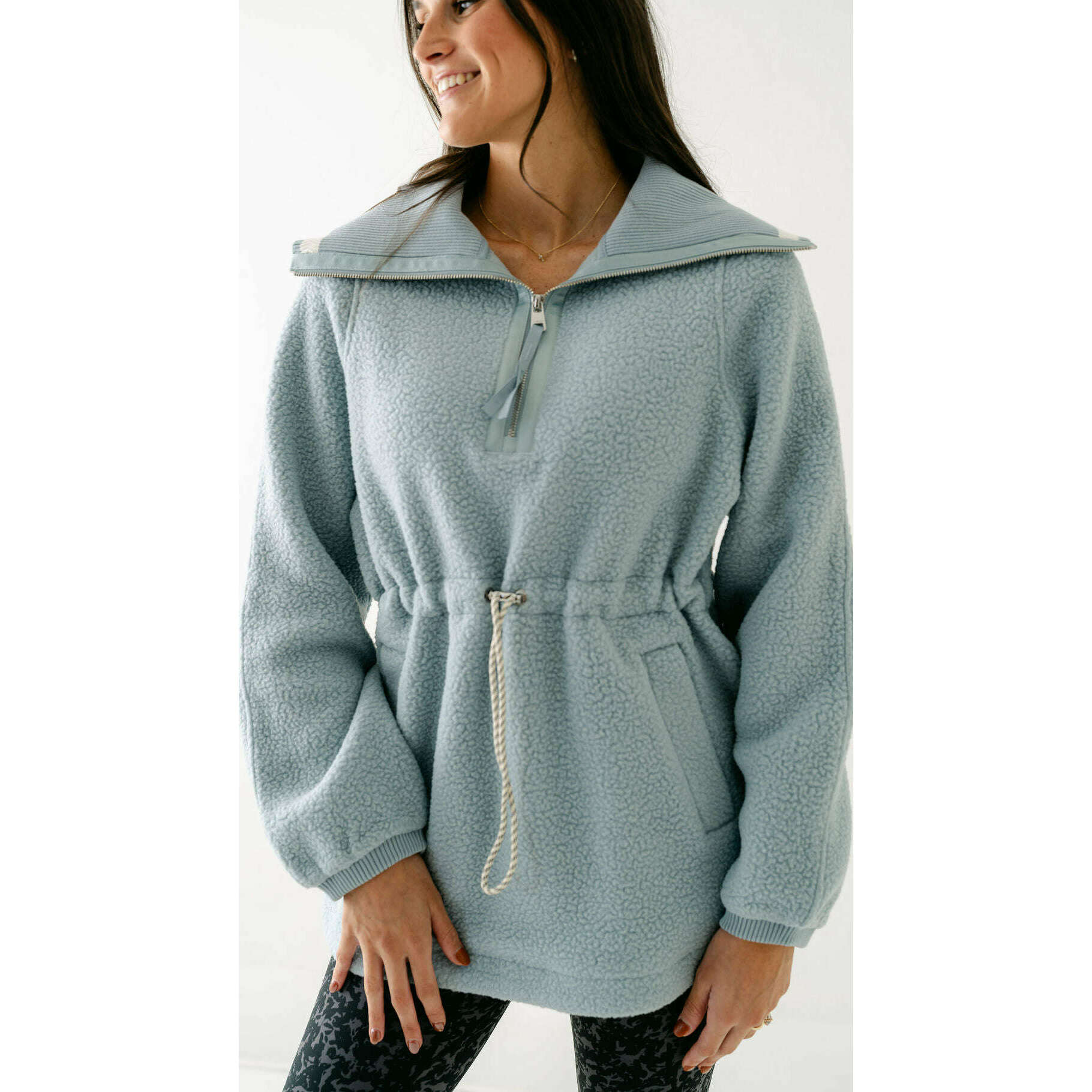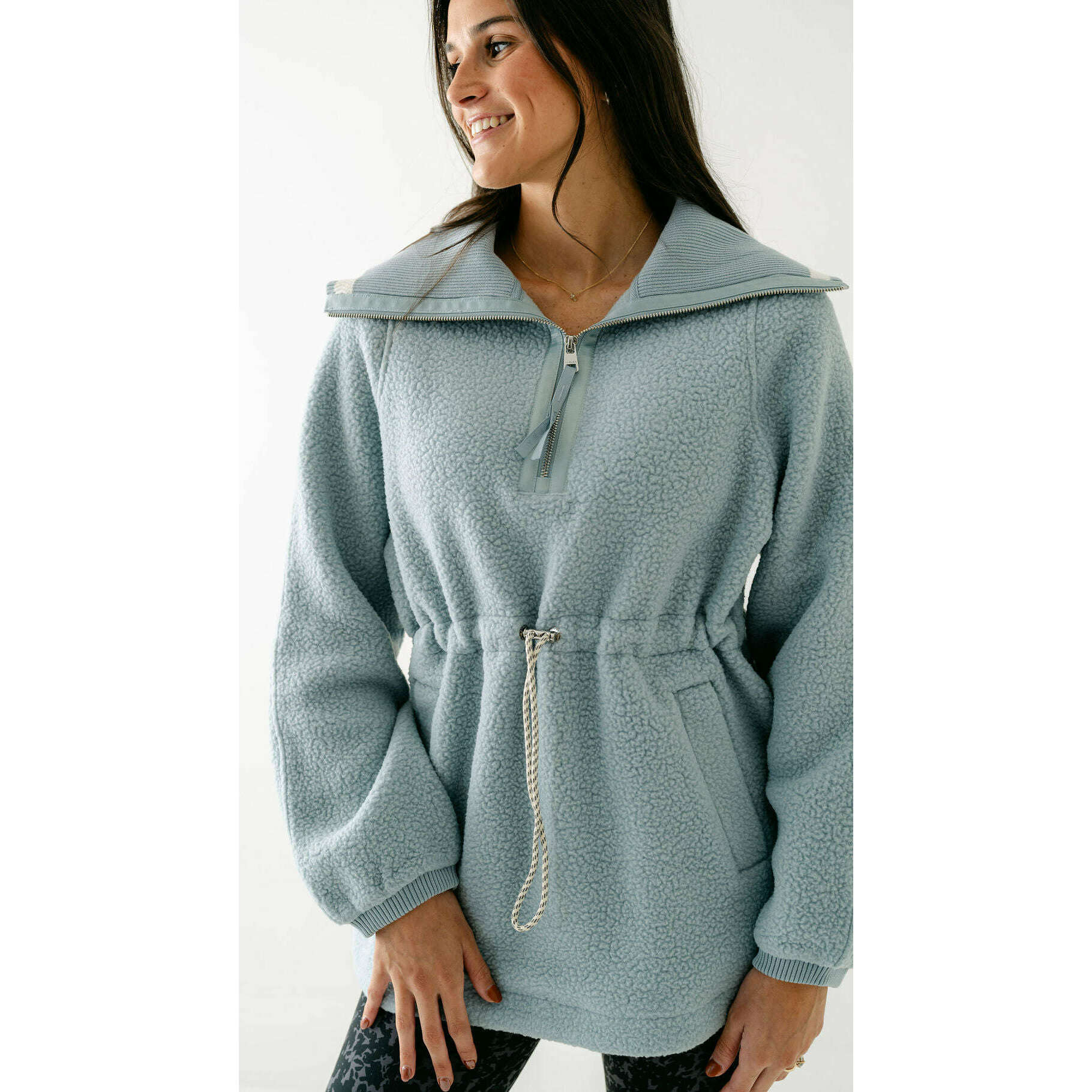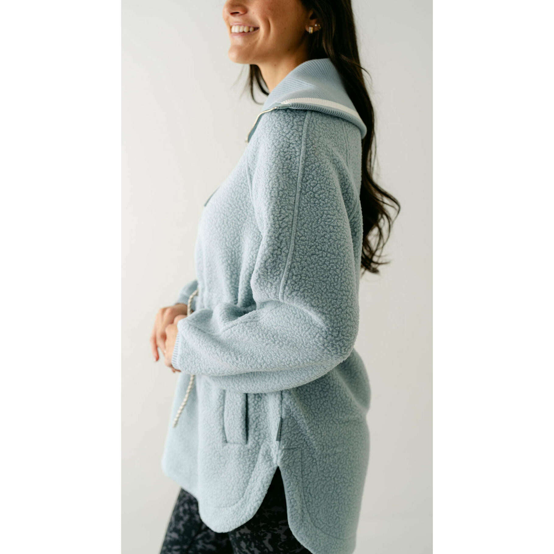 The Varley Ashby is a longline half-zip made from our warm and insulating Plush Borg Fleece and refined with stripe detailing along the collar. It's cut to an oversized fit with an adjustable toggle waist that can be cinched in - perfect for layering over leggings, baselayers, and pants alike.