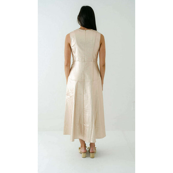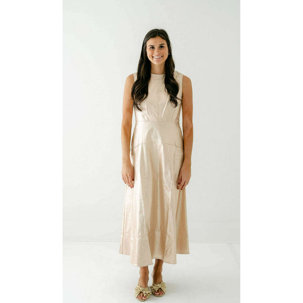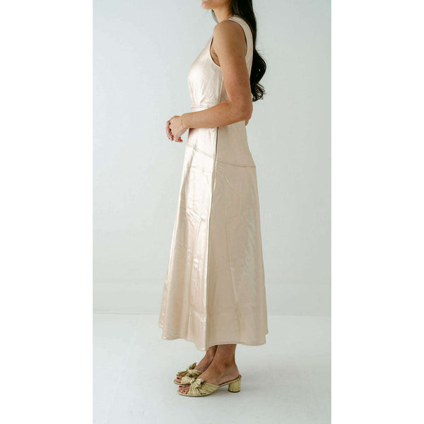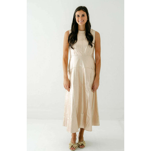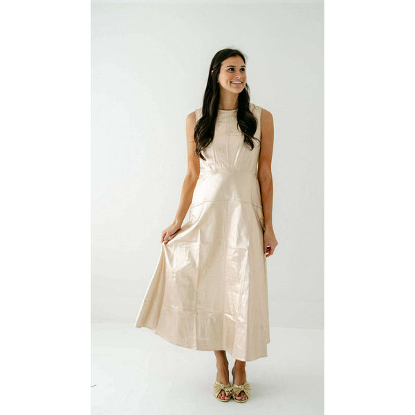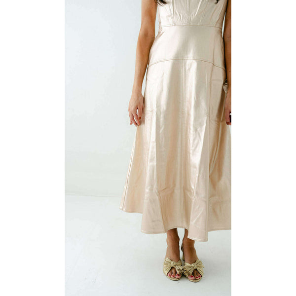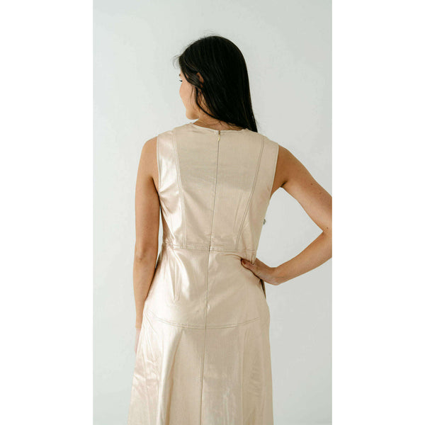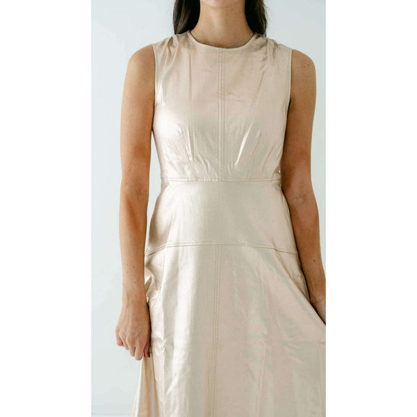 With her jewel neckline, fitted bodice, and A-line midi length skirt, our ladylike Claire dress is the timeless, go-anywhere silhouette. This season, she's feeling the Holiday spirit in this metallic coated denim, perfect for the New Year's festivities. Fits true...