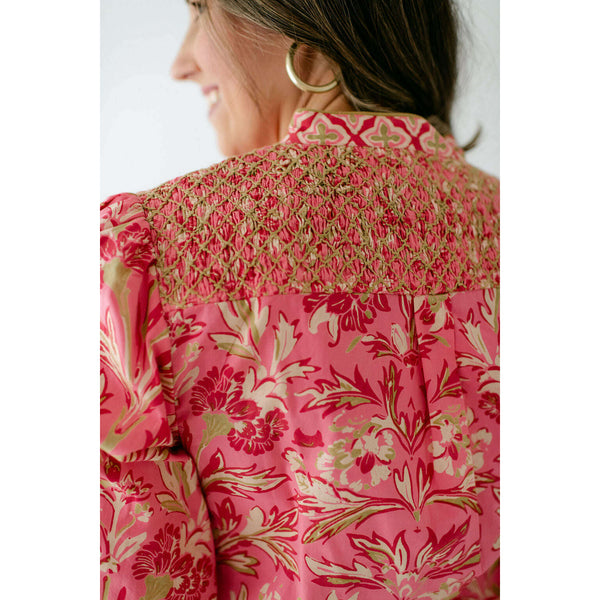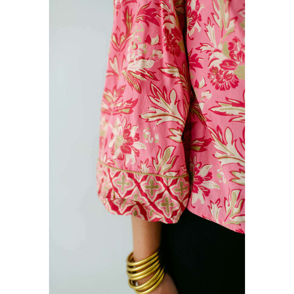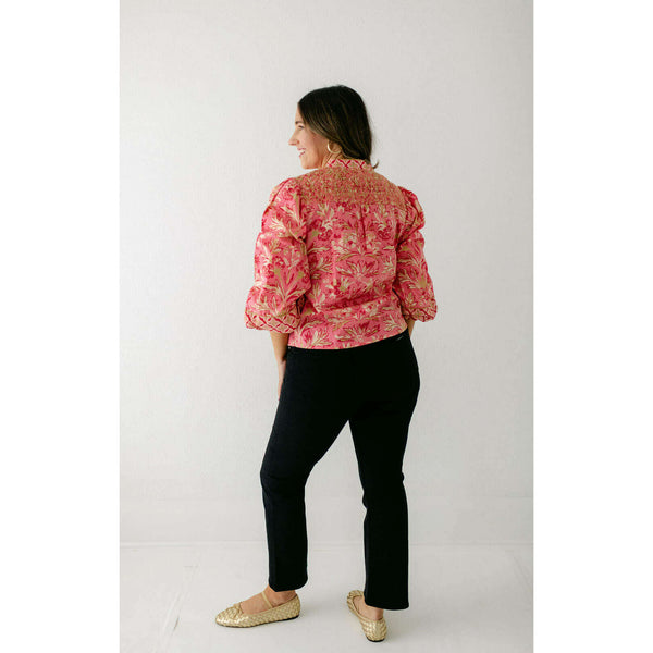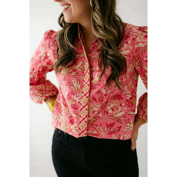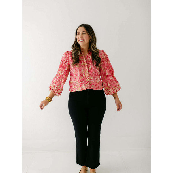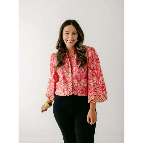 The Elizabeth James Emily Top is the perfect button front blouse, featuring a mandarin collar, covered placket, and balloon sleeves. This season, she is cut from a cotton blend fabric in our Grandeur Cherry print, perfect for dressing up or down...