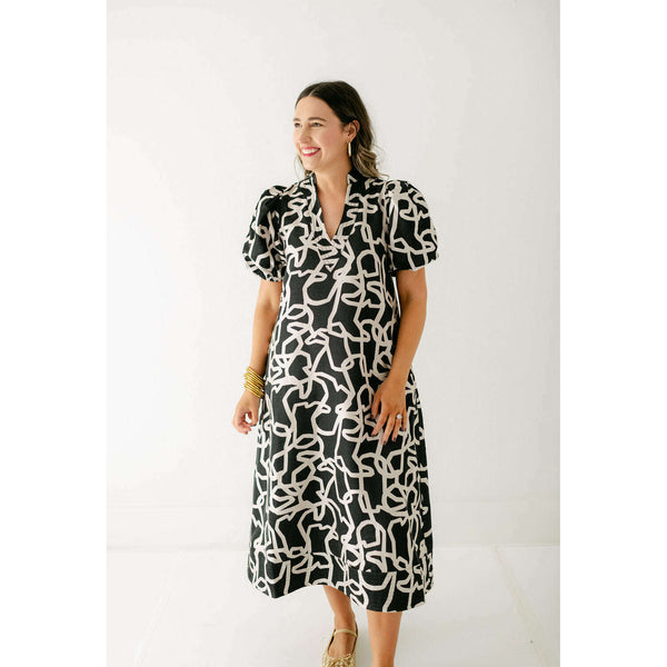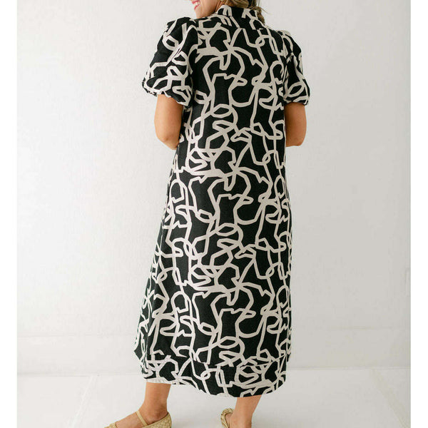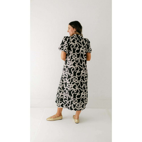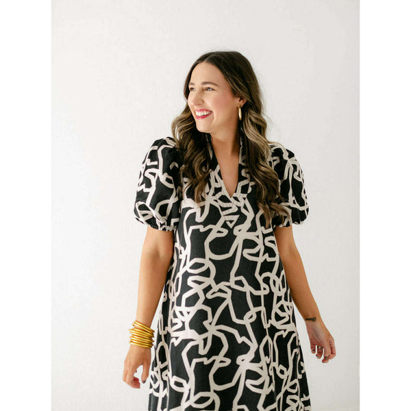 The Emily McCarthy Hampton Dress in Boot Print showcases an abstract pattern created from interlocking boot outlines, a nod to western heritage reimagined with modern flair. The black and ivory woven fabric adds soft texture and visual dimension, giving the design...