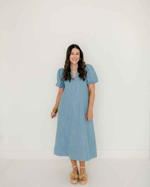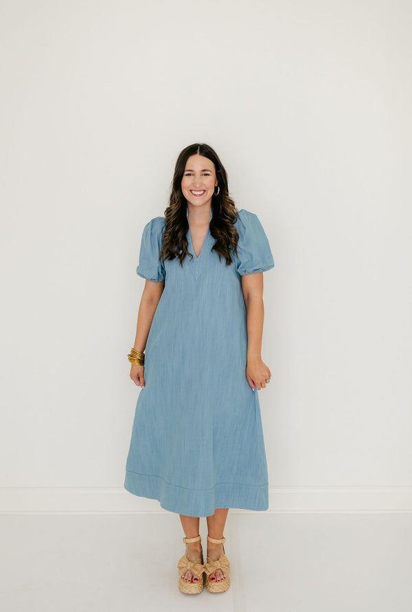 The Emily McCarthy Hampton Dress in Denim Chambray is an effortless, seasonless silhouette designed for everyday wear. It features a mandarin-style collar with a clean v-neckline, elastic puff sleeves, and a loose-fitting shape that offers ease and comfort throughout the...