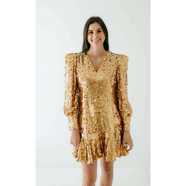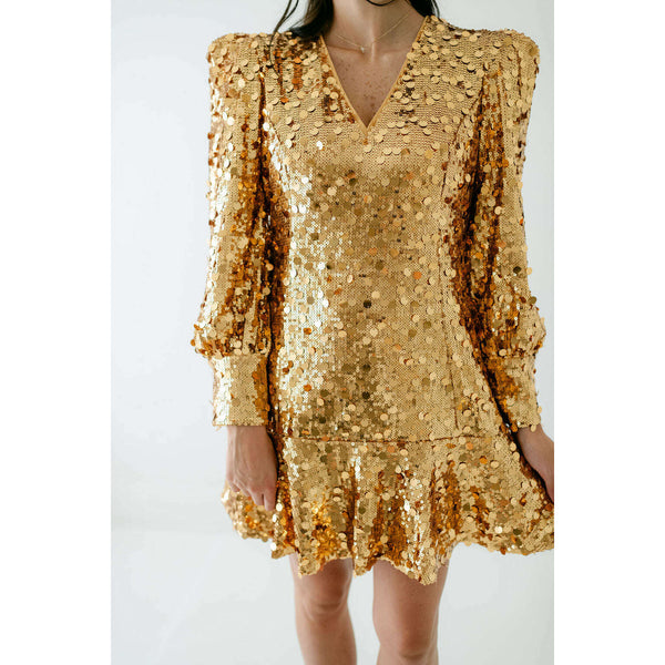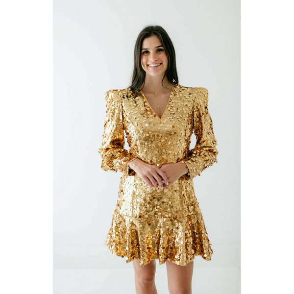 The Emily McCarthy Jenny Dress in Gold Sequin features a structured shoulder detail, flattering V-neckline, and flared tiered hem balanced with an invisible side zipper. Its tailored silhouette offers a romantic yet feminine shape, while the mix of large and...