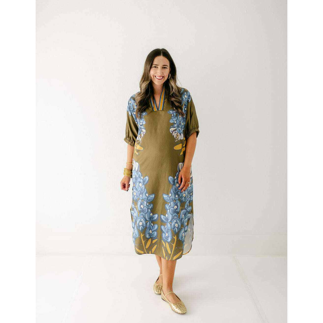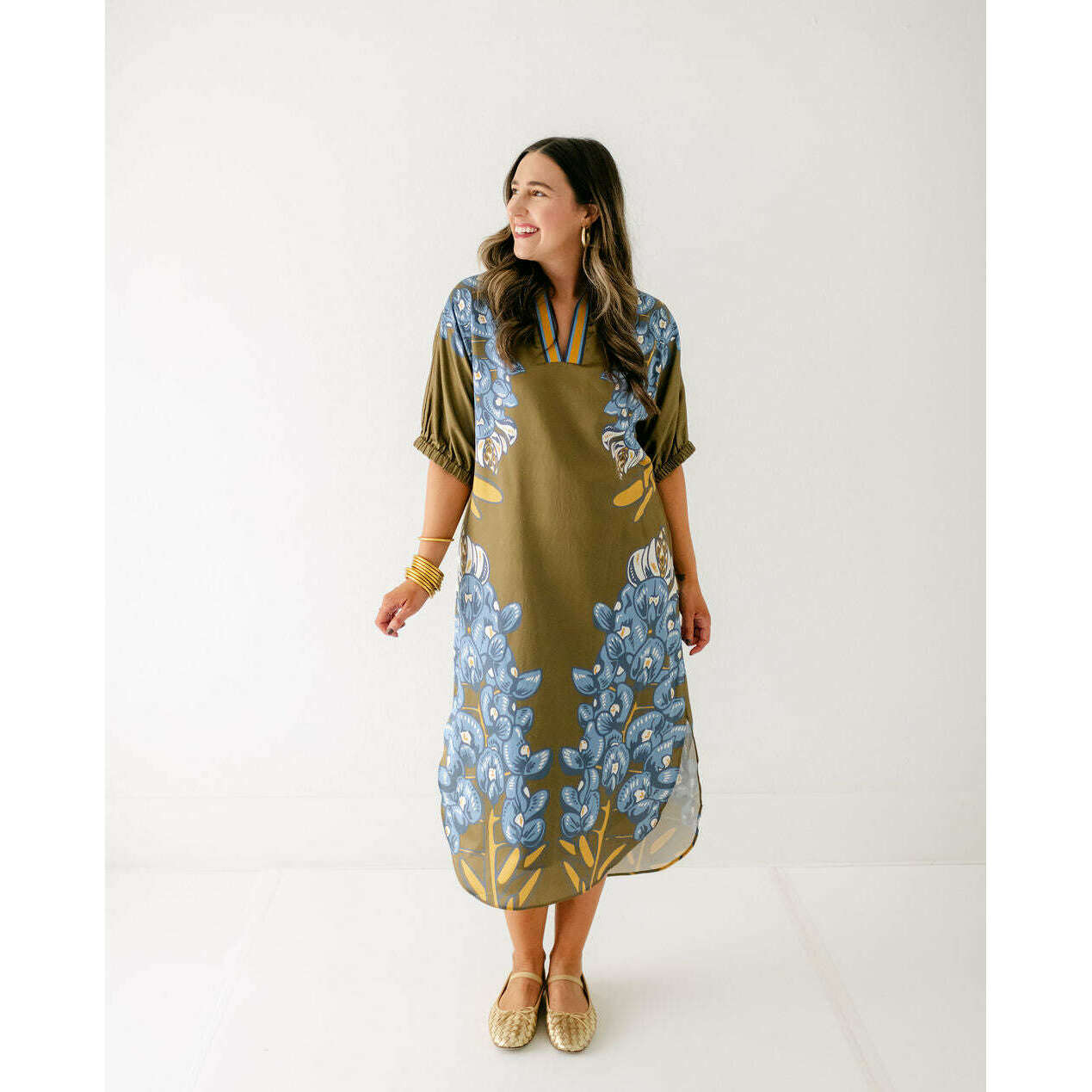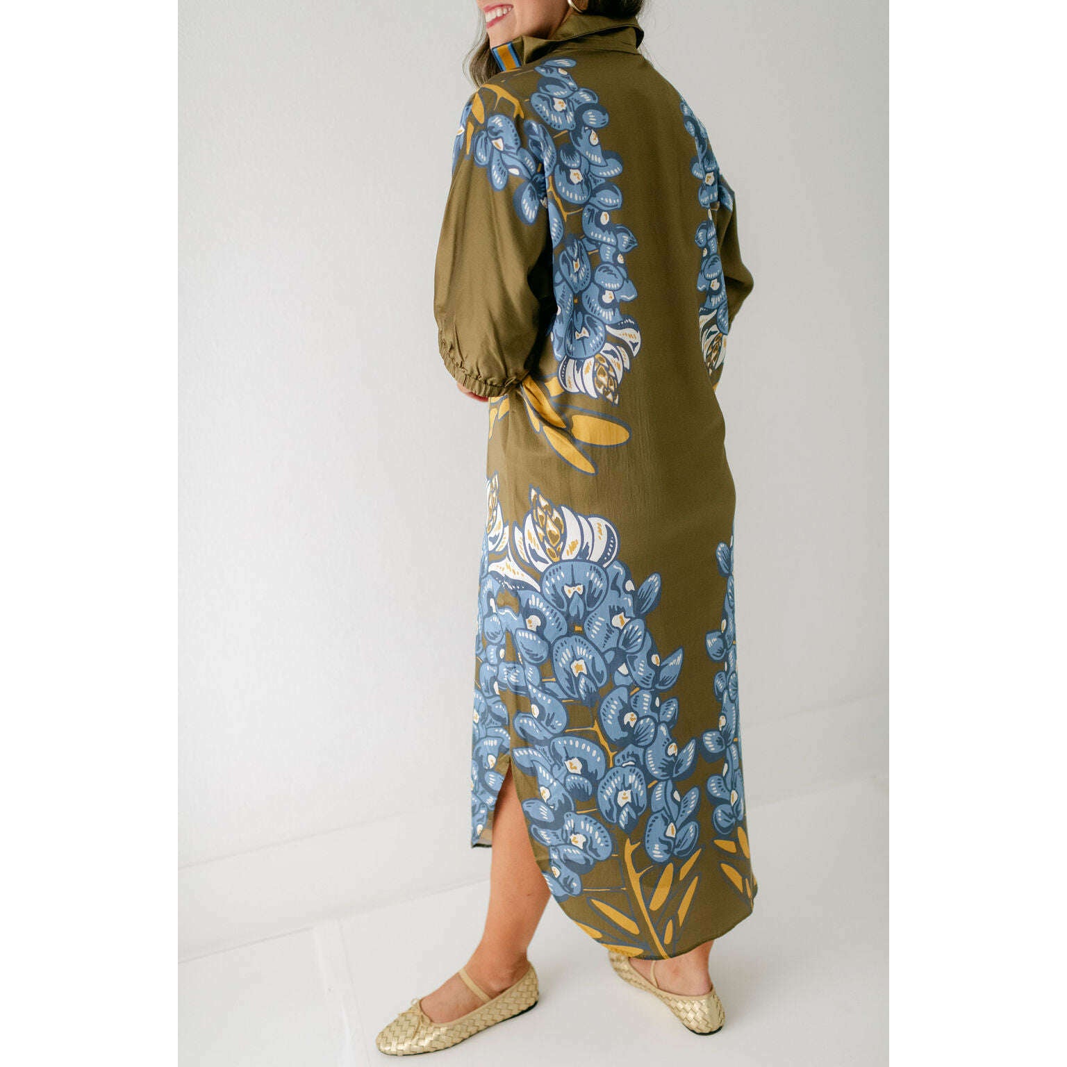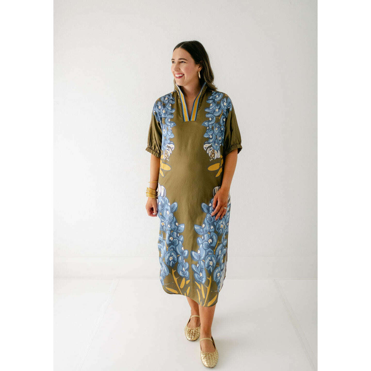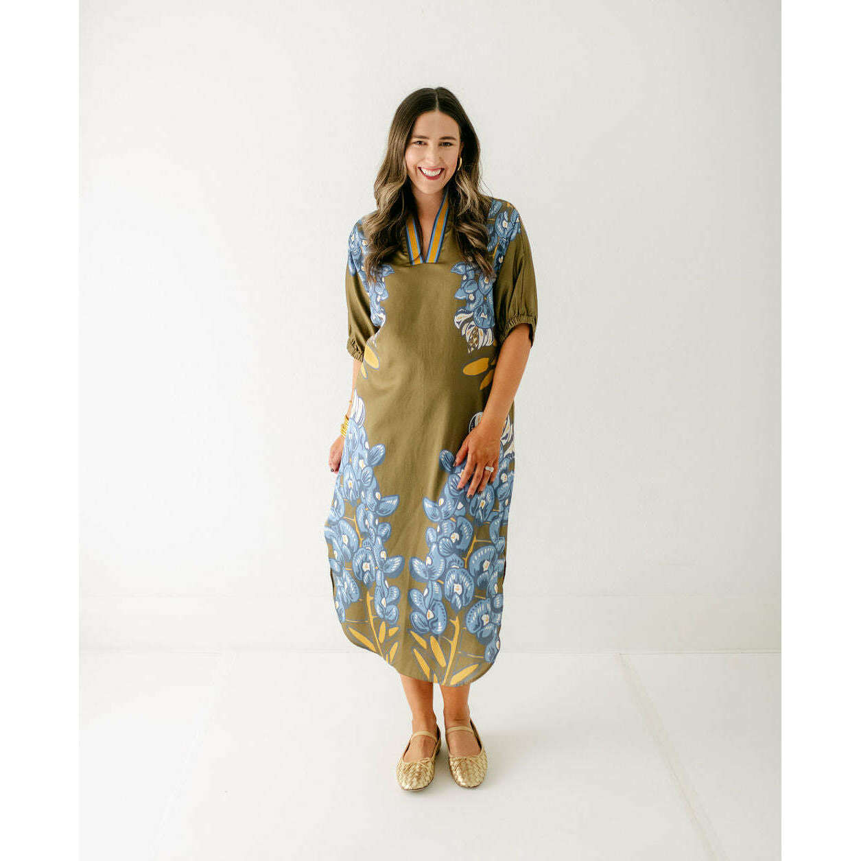 The Emily McCarthy Poppy Caftan in Bluebonnet is a relaxed yet elevated silhouette that captures the essence of western charm through the Texas state flower. Designed with loose elastic dolman sleeves and a classic stand collar, it drapes effortlessly in a loose-fitting shape that flatters while offering all-day comfort. The curved shirttail hem and side slits add fluidity and ease of movement, while the placed print creates a striking vertical effect that elongates the figure. A versatile piece, the Poppy Caftan transitions seamlessly from day to evening with its effortless sophistication.