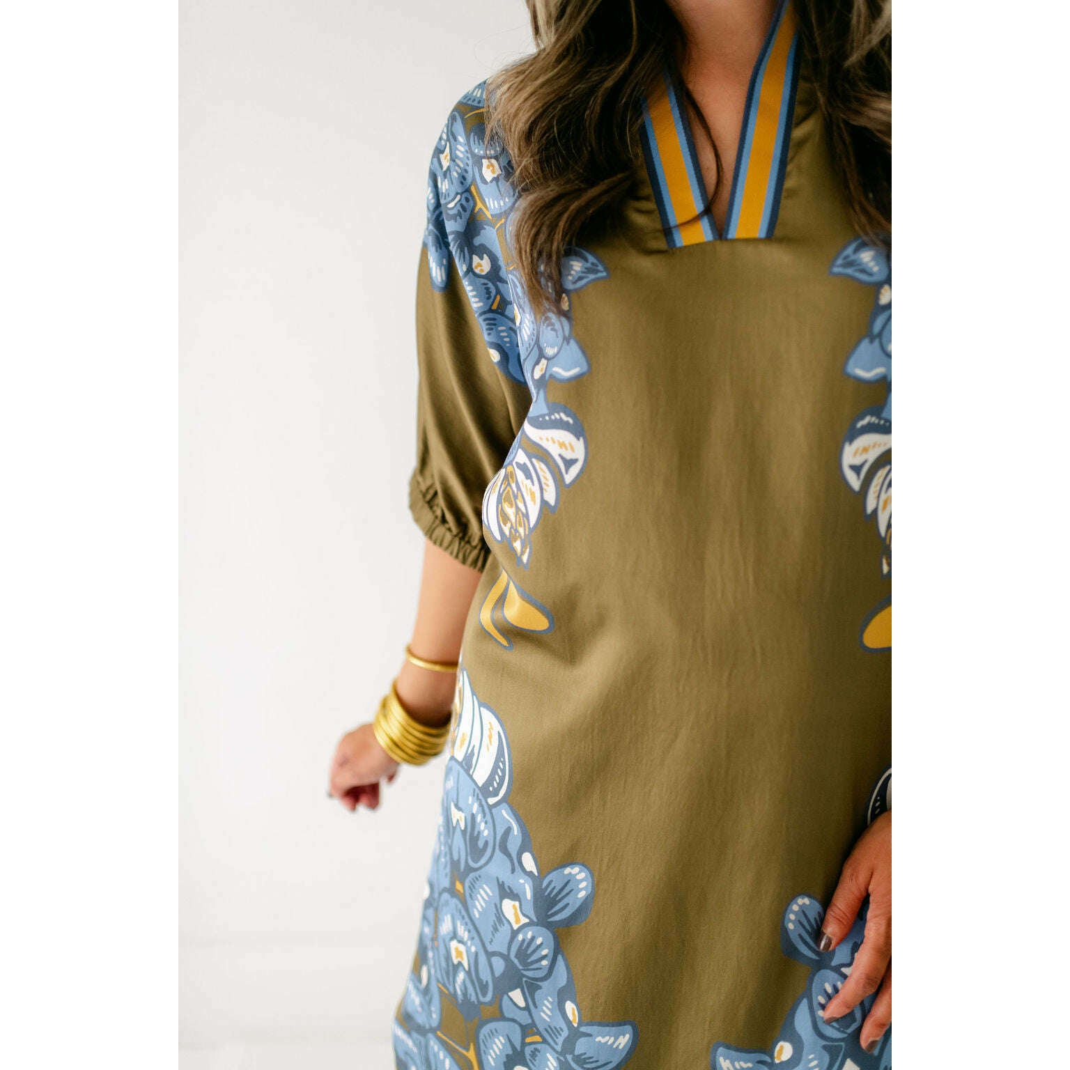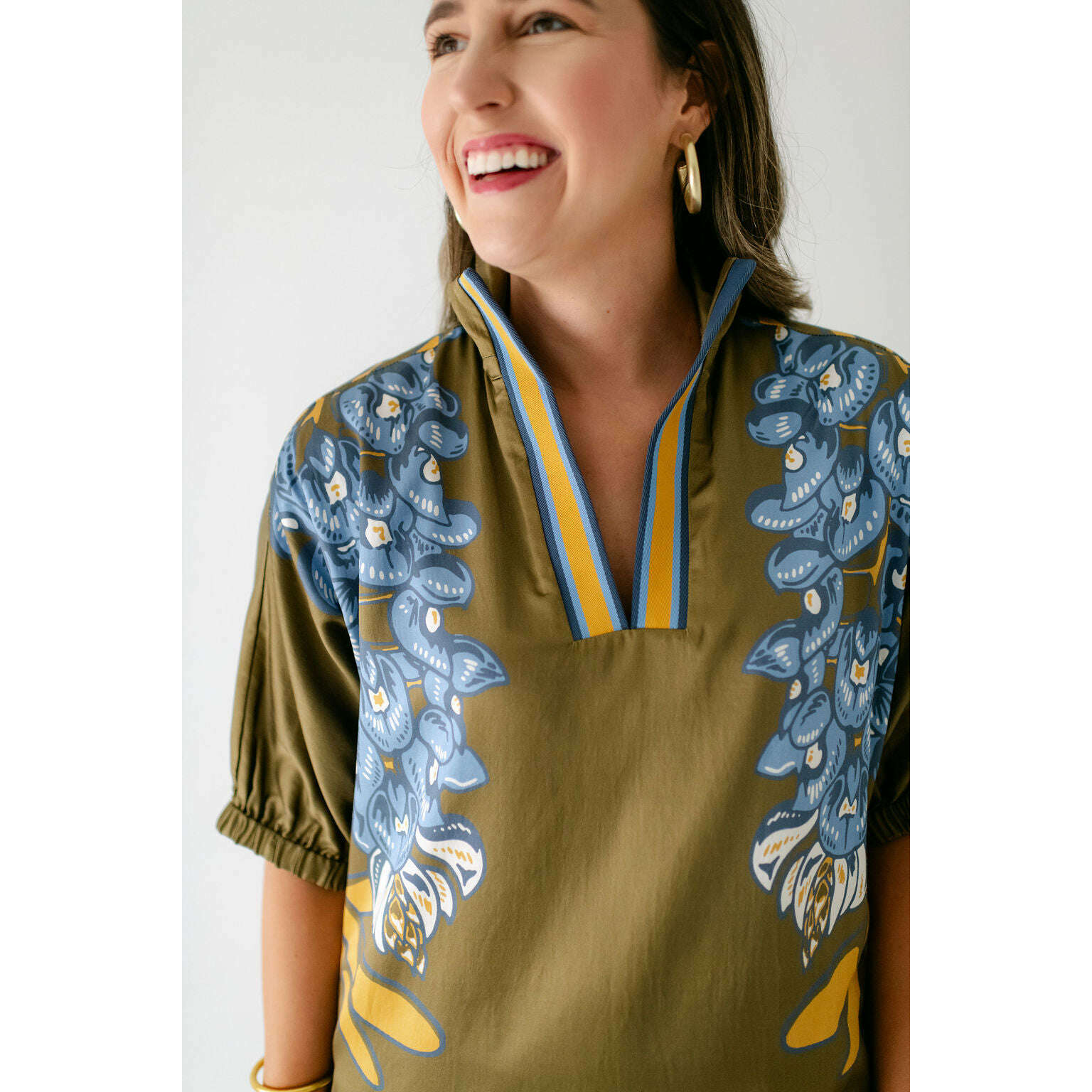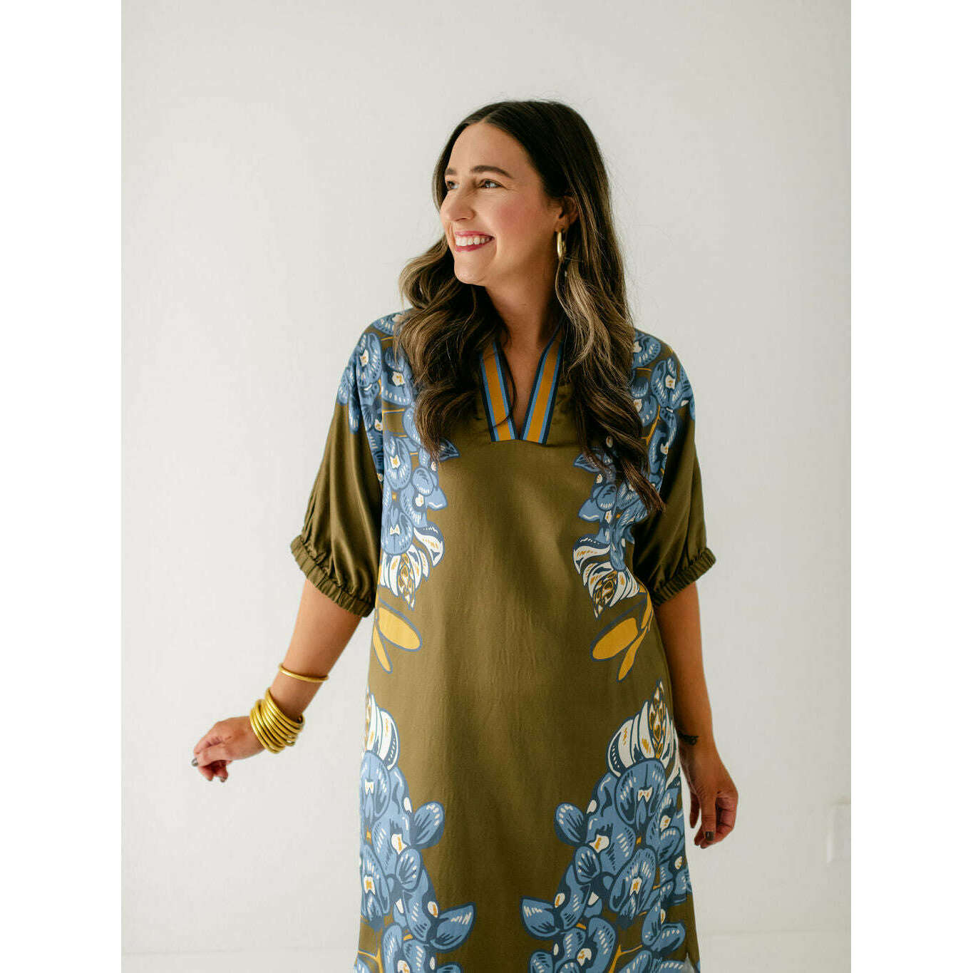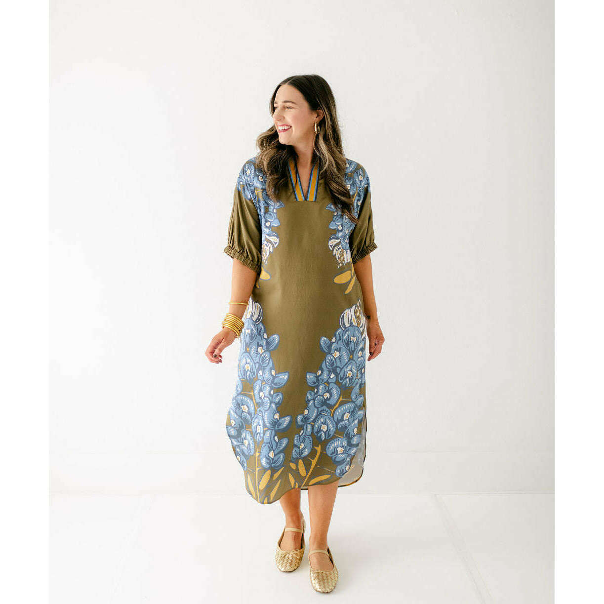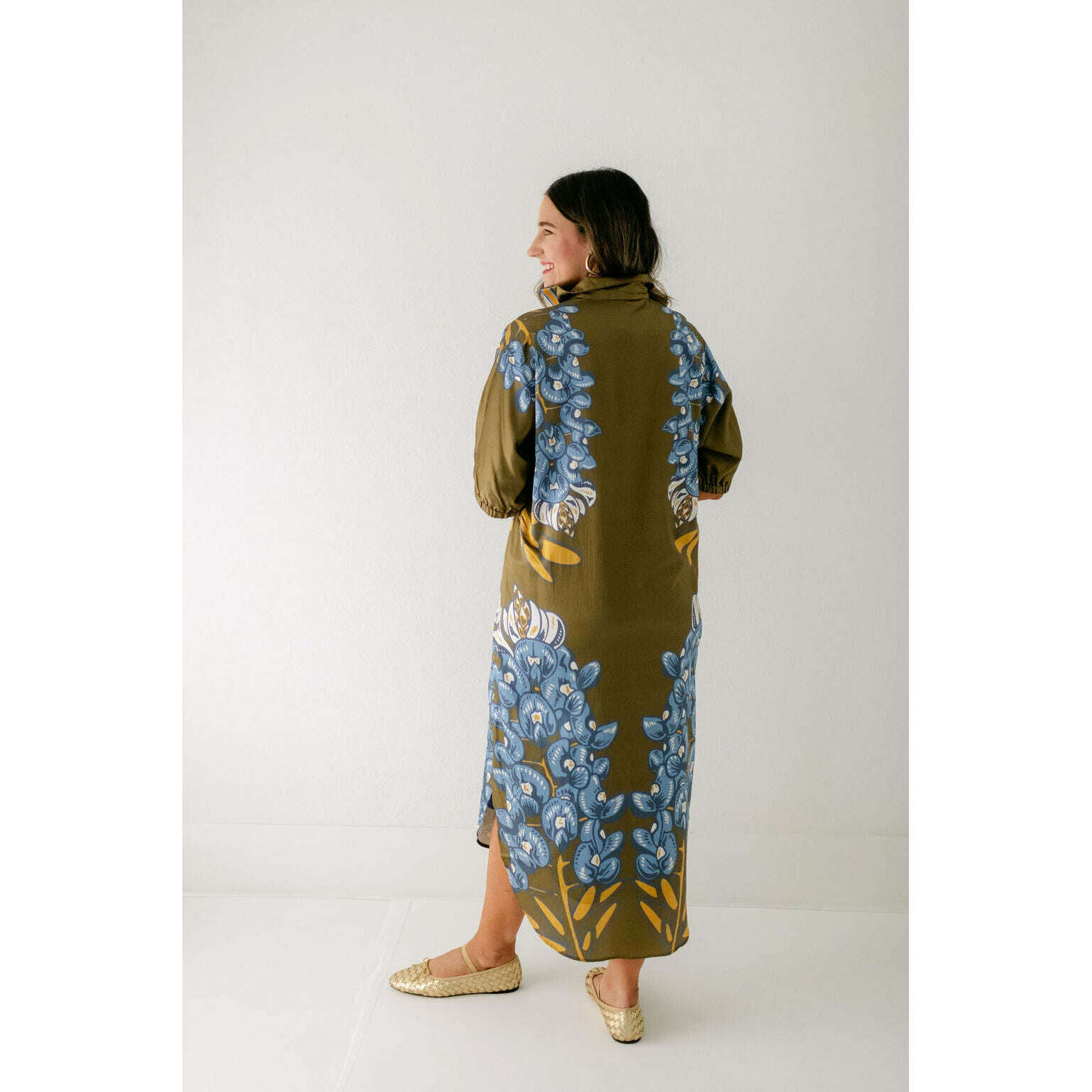 The Emily McCarthy Poppy Caftan in Bluebonnet is a relaxed yet elevated silhouette that captures the essence of western charm through the Texas state flower. Designed with loose elastic dolman sleeves and a classic stand collar, it drapes effortlessly in a loose-fitting shape that flatters while offering all-day comfort. The curved shirttail hem and side slits add fluidity and ease of movement, while the placed print creates a striking vertical effect that elongates the figure. A versatile piece, the Poppy Caftan transitions seamlessly from day to evening with its effortless sophistication.