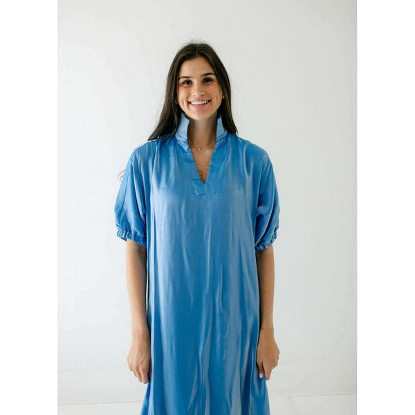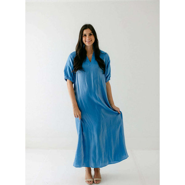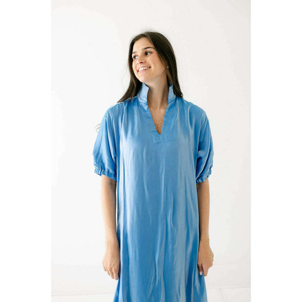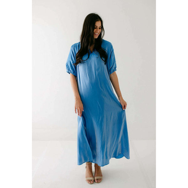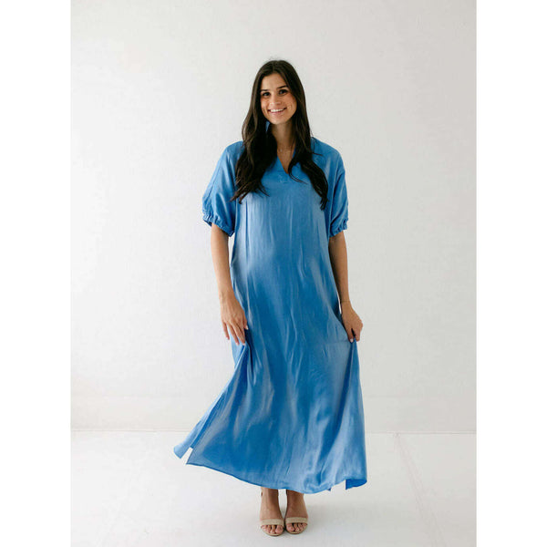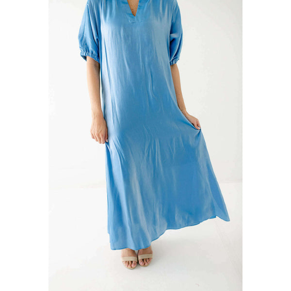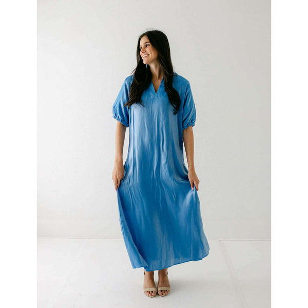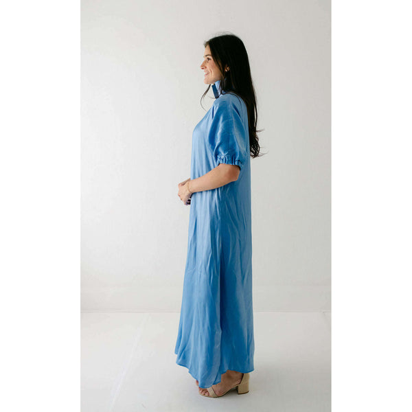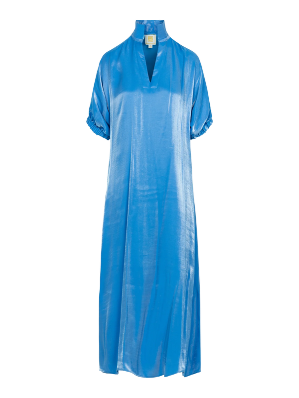 Radiant and effortlessly refined, the Emily McCarthy Poppy Maxi in Sapphire is designed to make an impression. Crafted in an illuminating silk blend that catches the light with every move, this maxi dress features a classic stand collar, loose elastic...