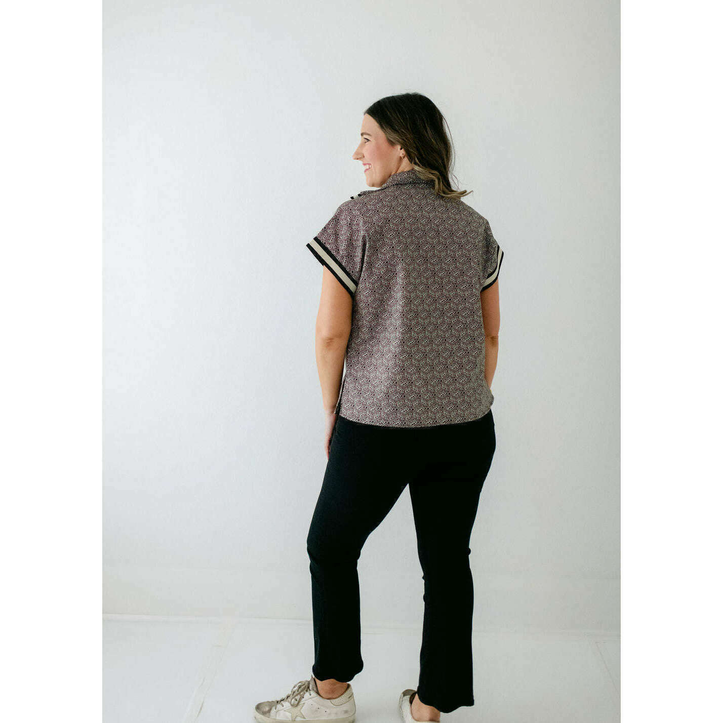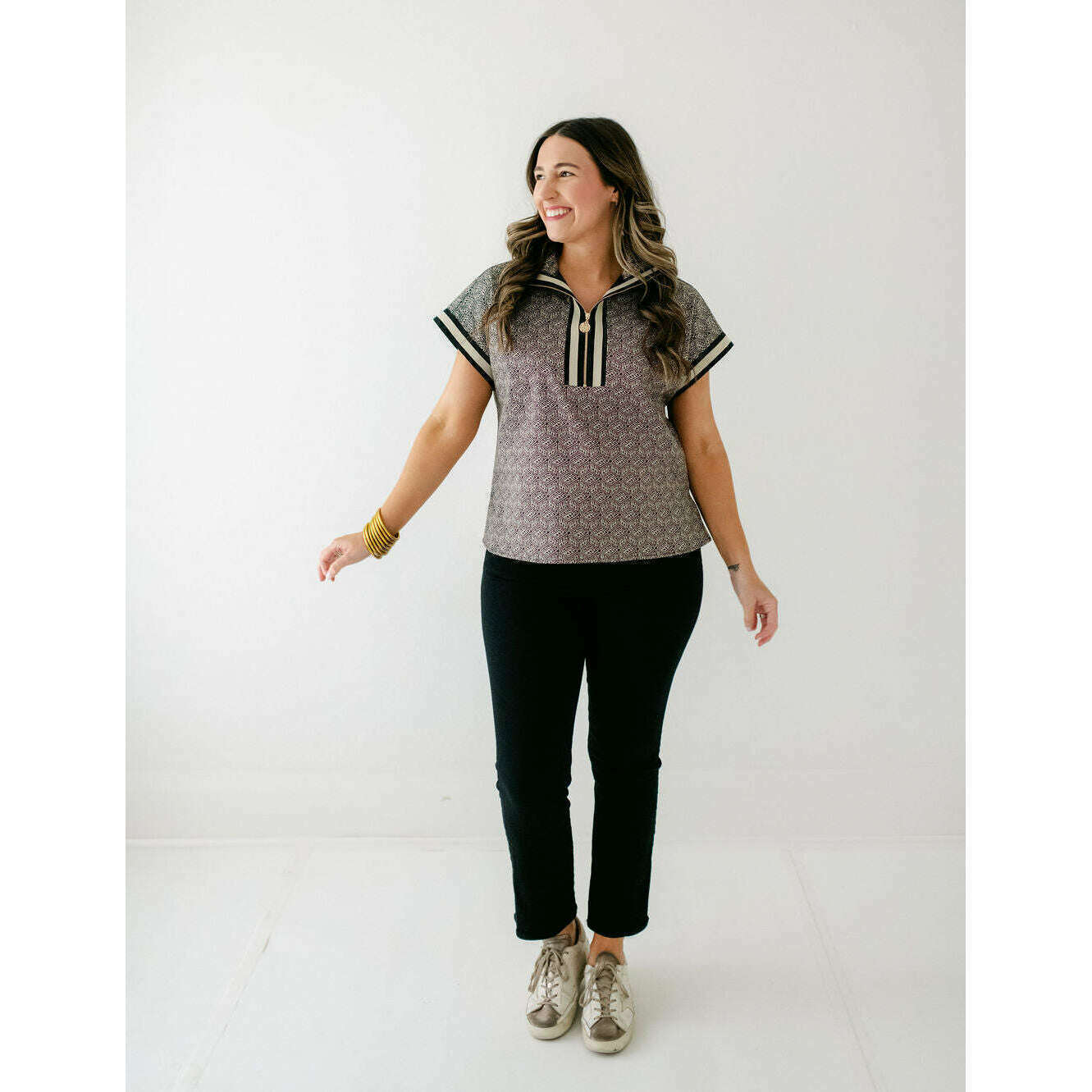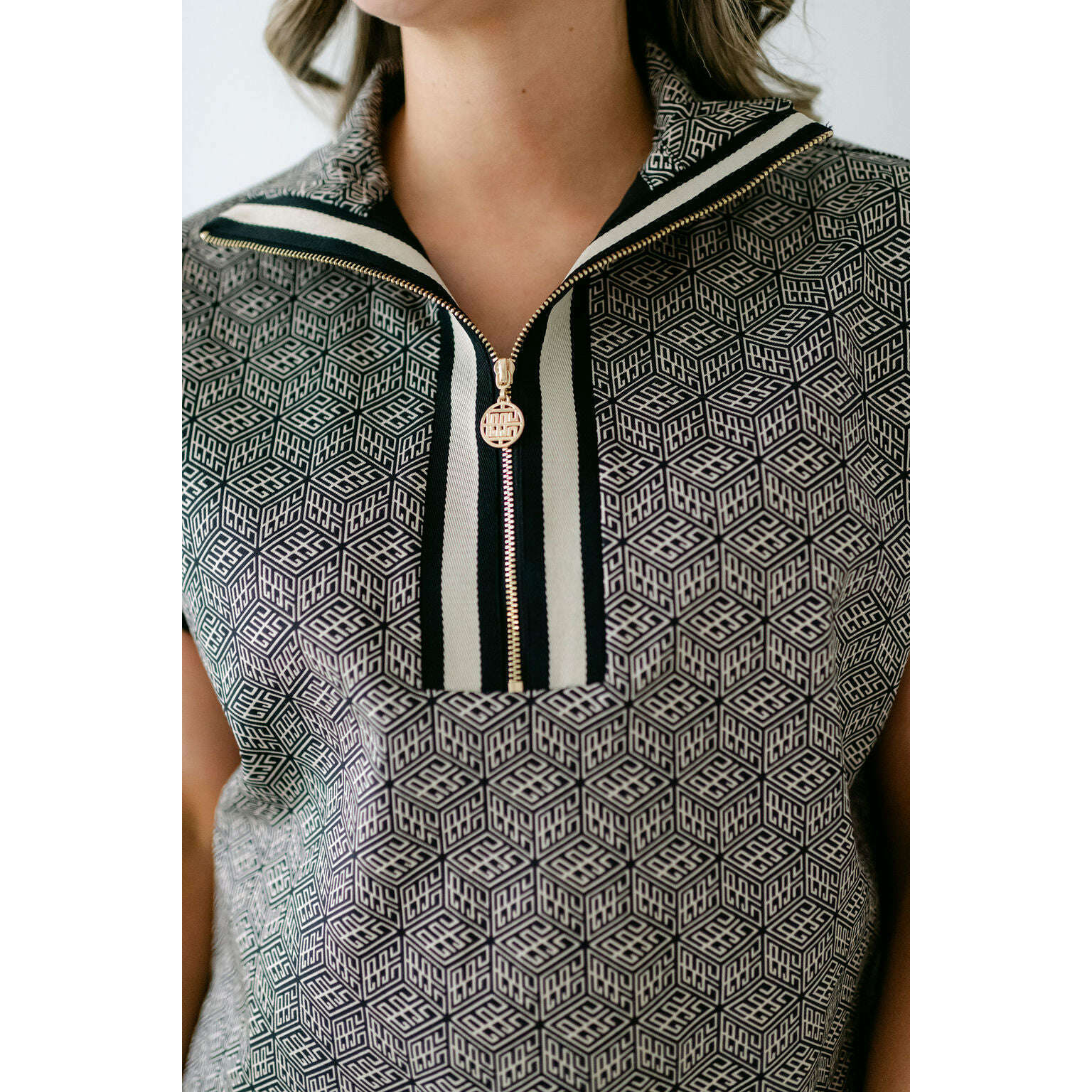 A sporty statement with chic detail, the Poppy Pullover in Black Tonal Monogram features a relaxed dolman sleeve and a 3/4 zip neckline finished with our signature gold zipper pull. Black and white striped trim adds bold contrast, while the tonal monogram print offers a subtle nod to the brand with a repeating logo motif throughout. Whether styled for casual outings, game day gatherings, or layered into your fall rotation, this pullover blends comfort and sophistication with ease.