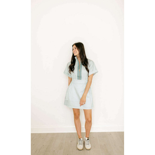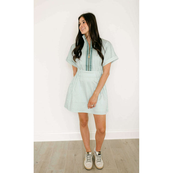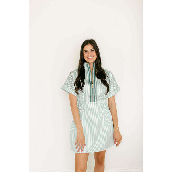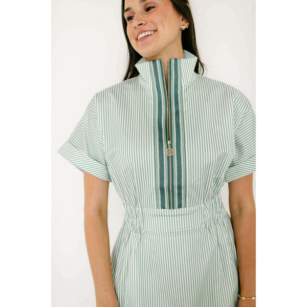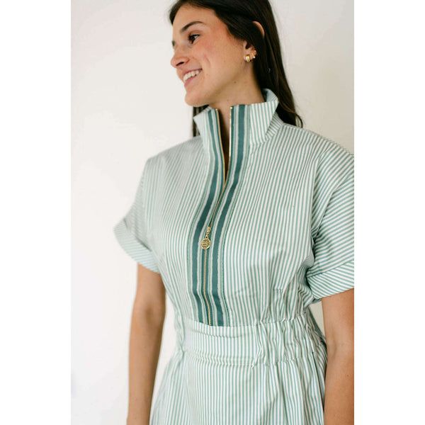 The Emily McCarthy Pullover Dress in Feldspar Stripe blends classic ease with a sporty, modern feel. Designed with a zip-front neckline finished with our gold logo pull, this style features short dolman sleeves, a cinched elastic waistband, and functional side...