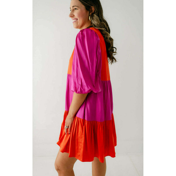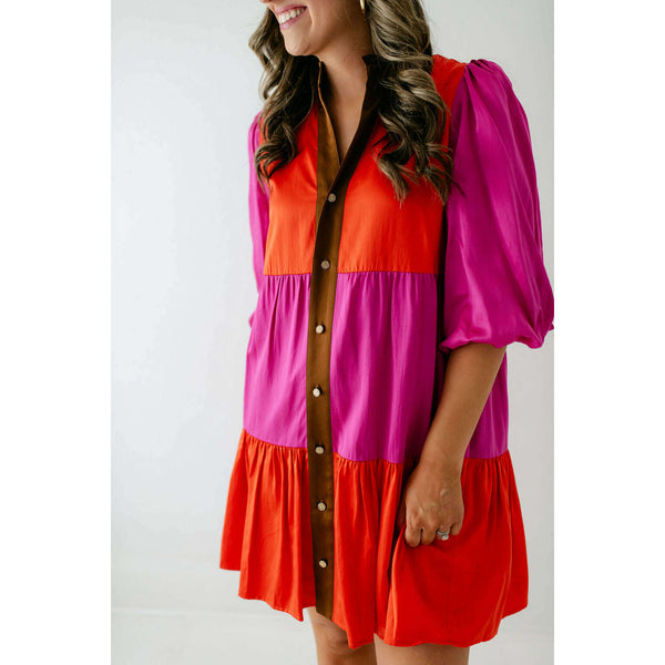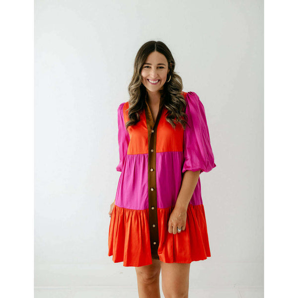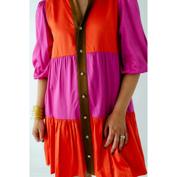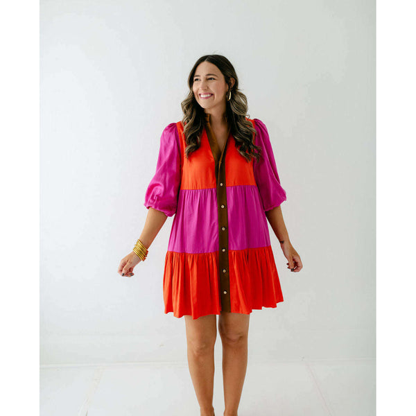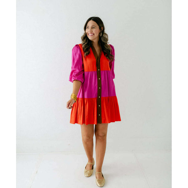 The Emily McCarthy Sadie Dress in Venetian Color Block blends effortless ease with vibrant style. Designed with a mandarin-style collar, front button closure, and a drop-waist hem, this loose-fitting silhouette offers a relaxed yet polished look. Side pockets add practical...