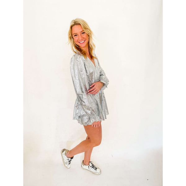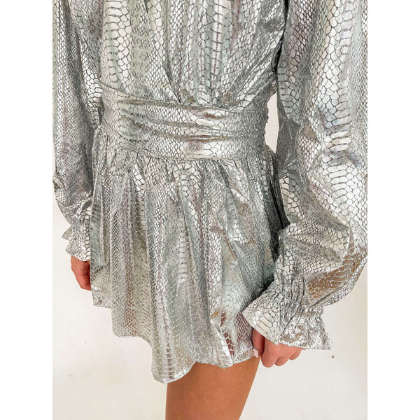 Endless Rose Snakeskin Metallic Romper Fits true to size, the model is wearing an XS Hand wash, dry flat