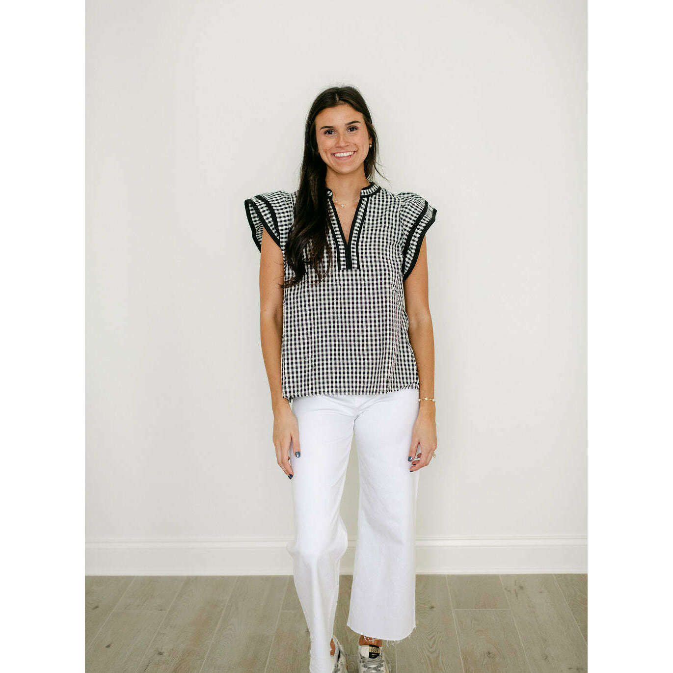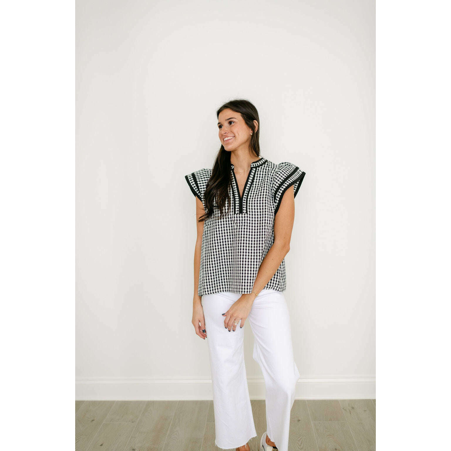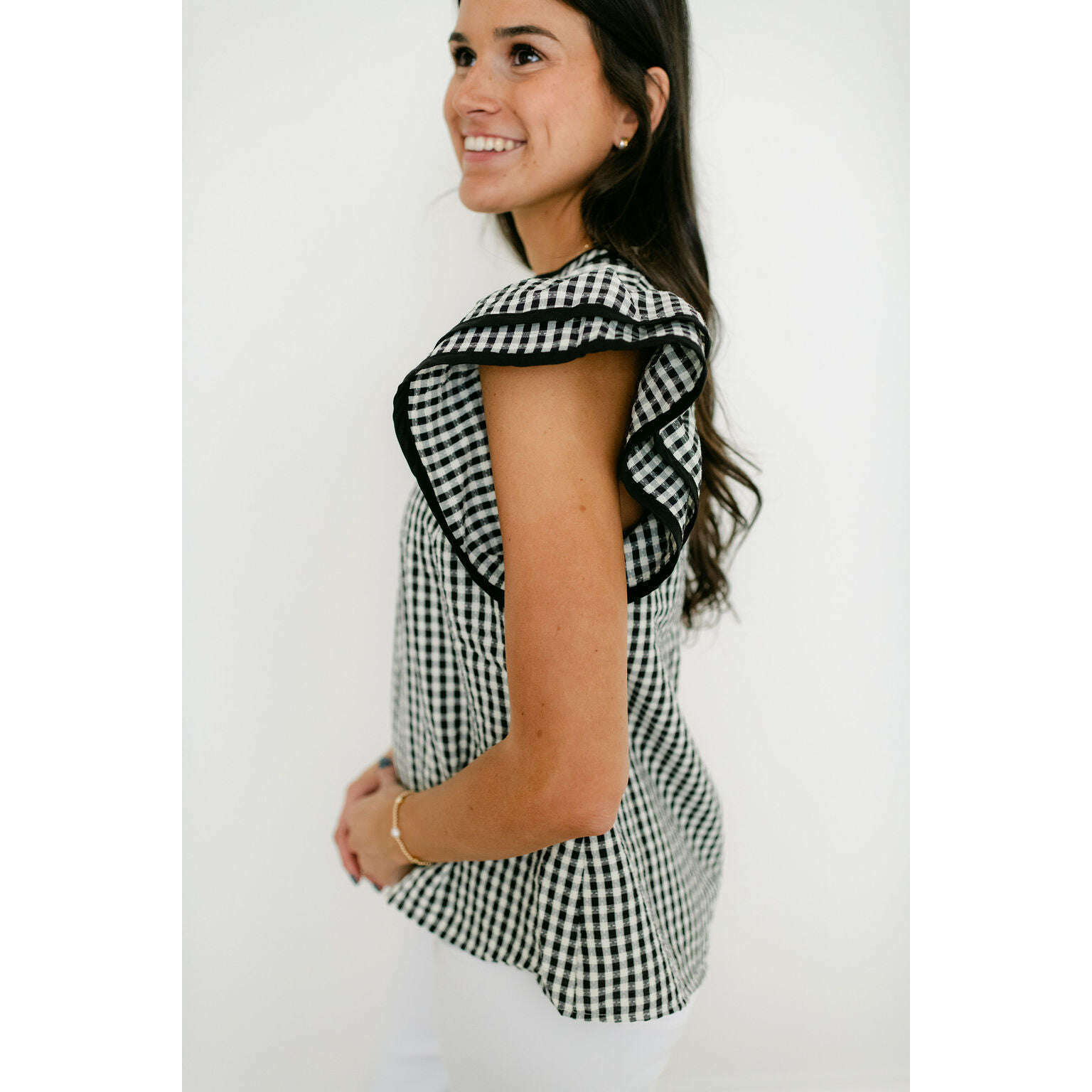 Entro Black and White Gingham Flutter Sleeve Top