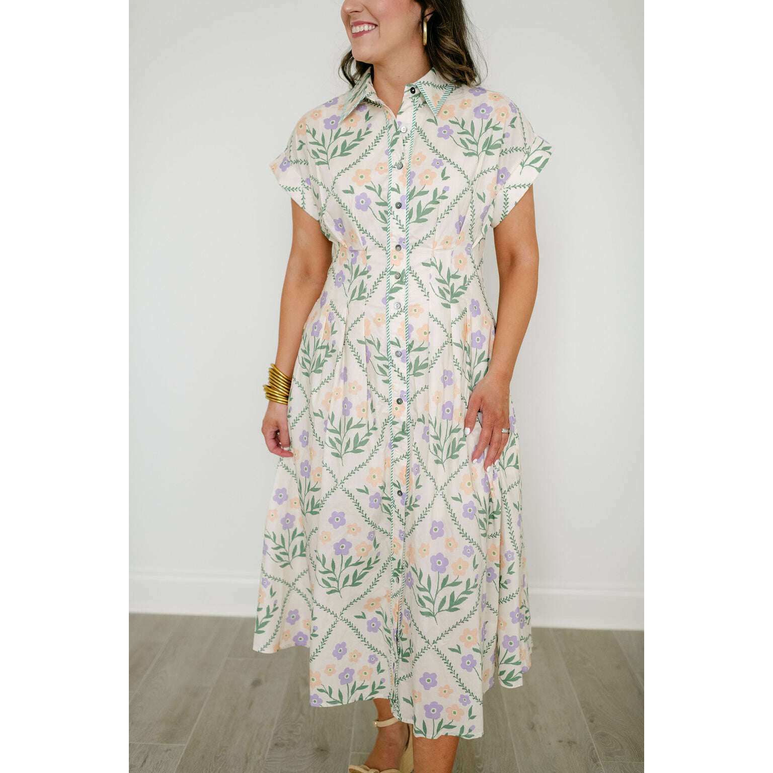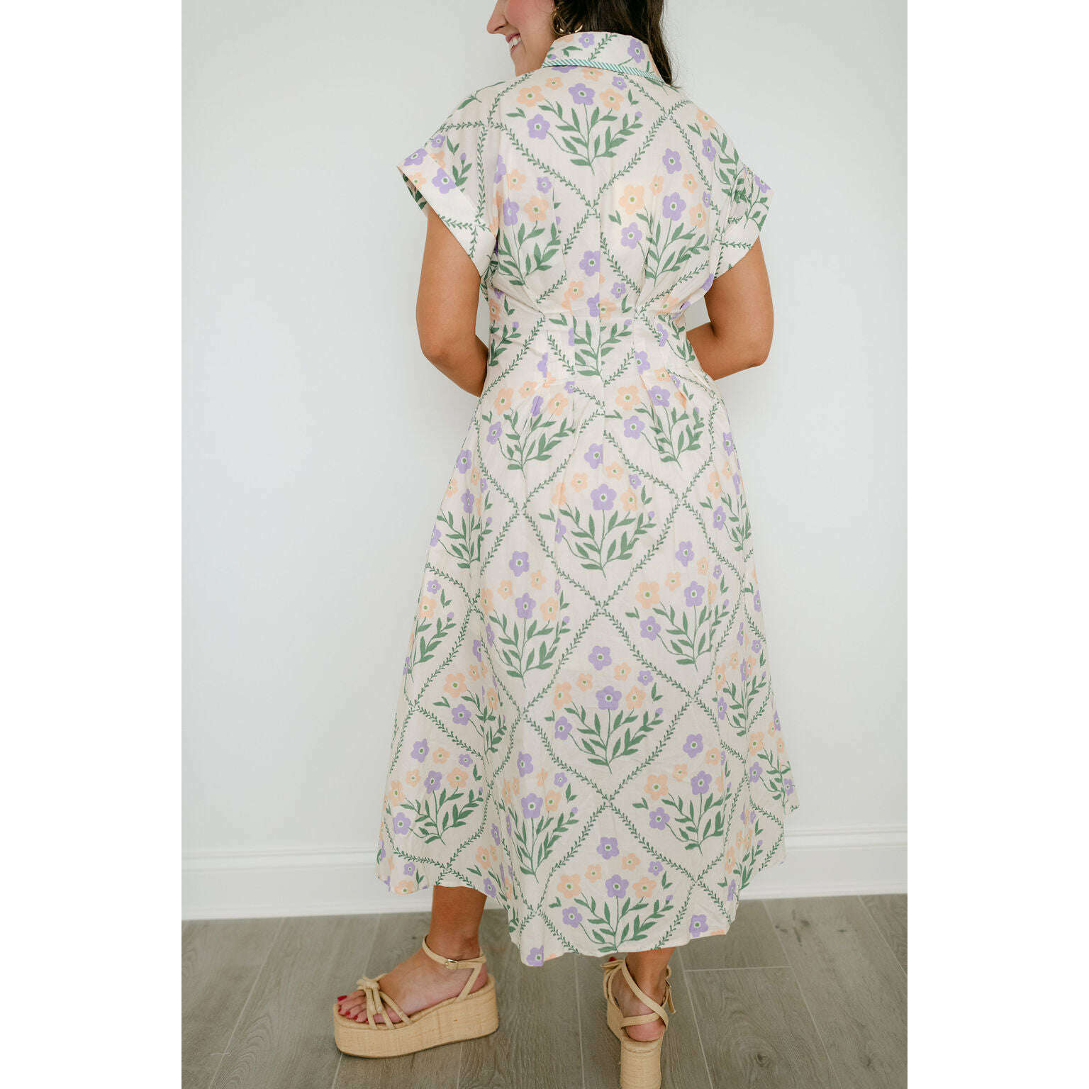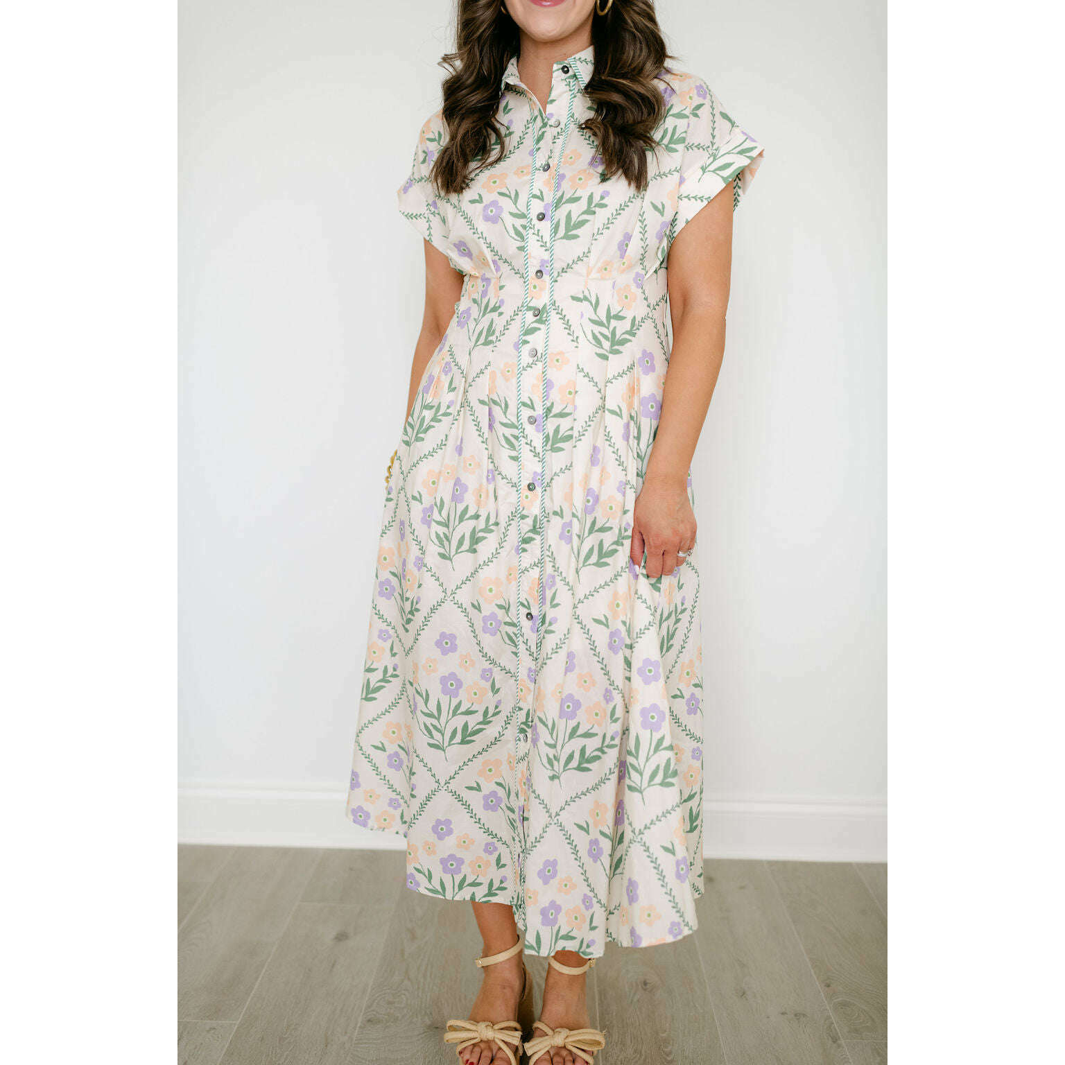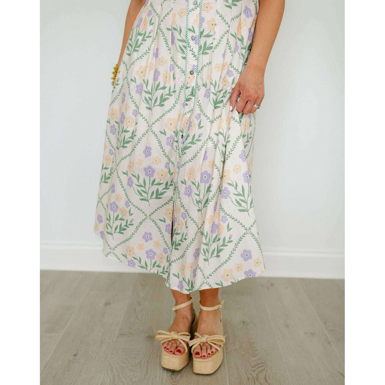 Entro Cream Green and Purple Floral Cinched Waist Dress