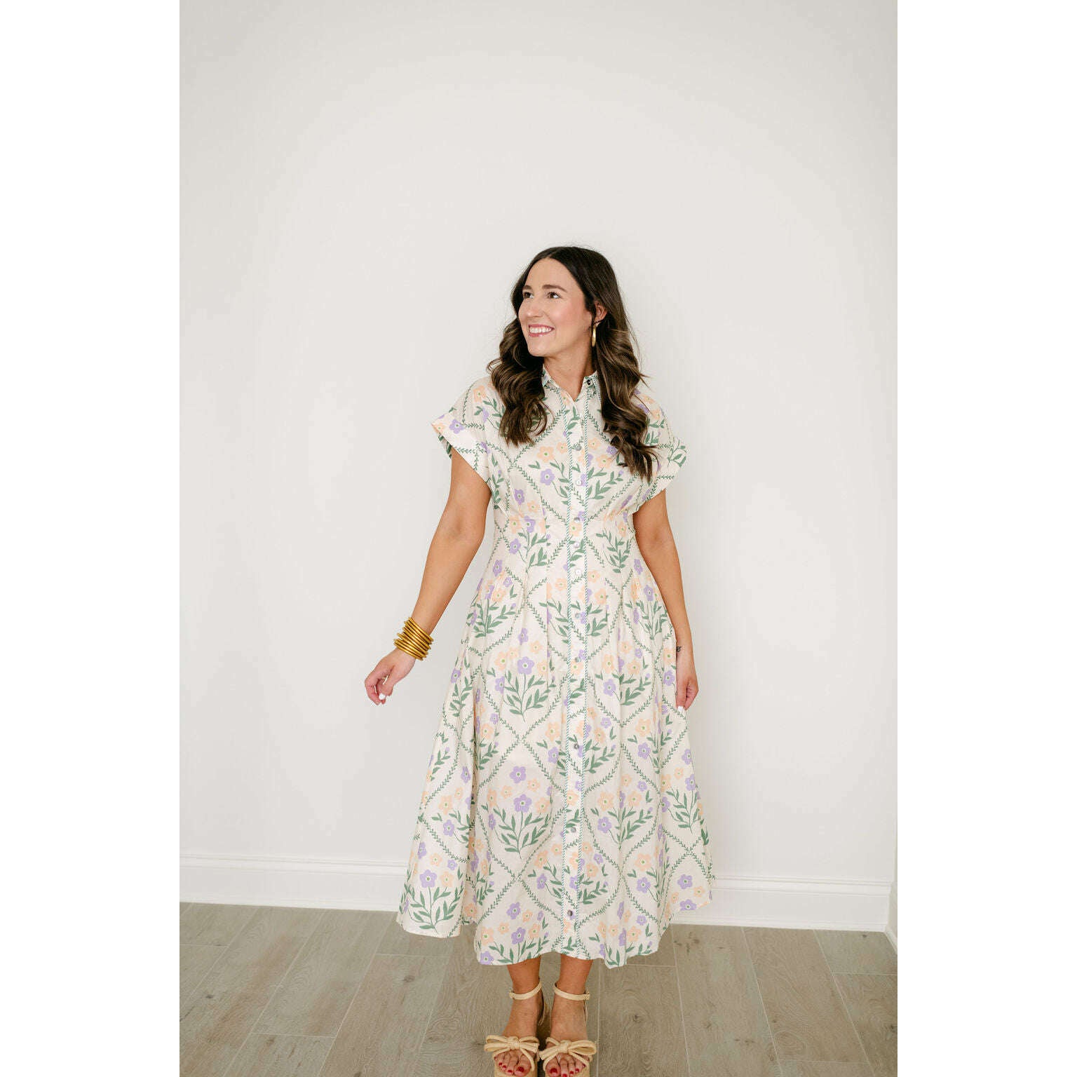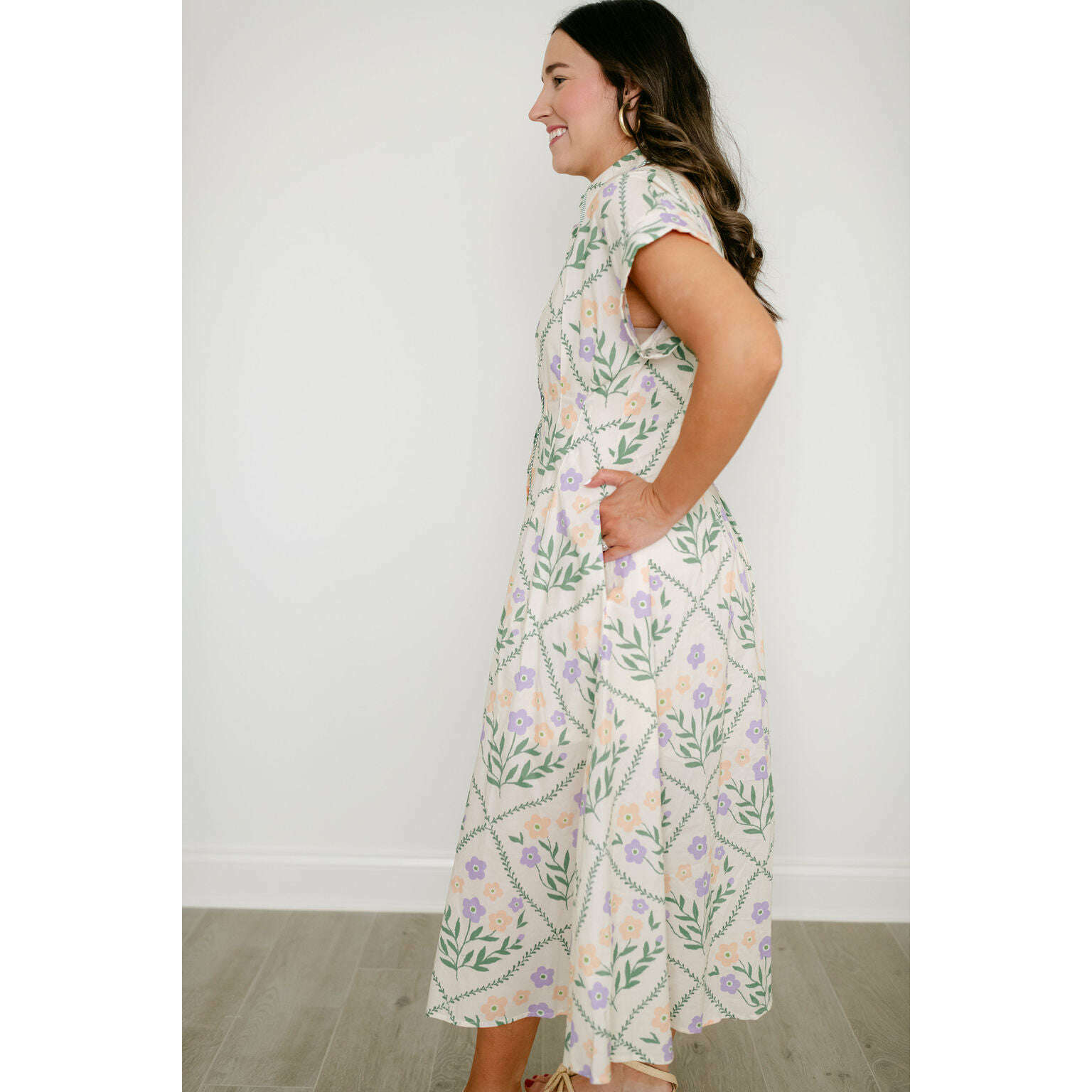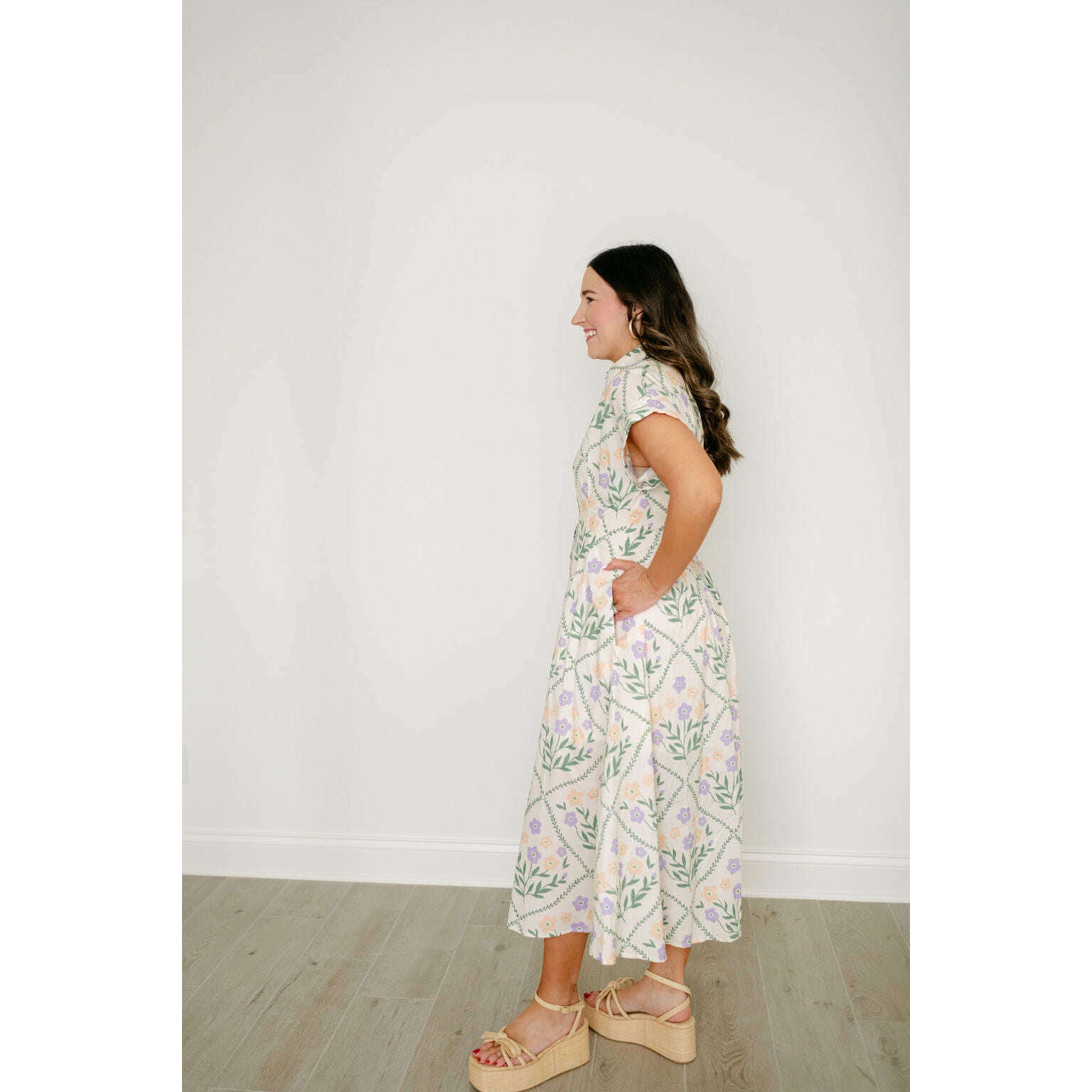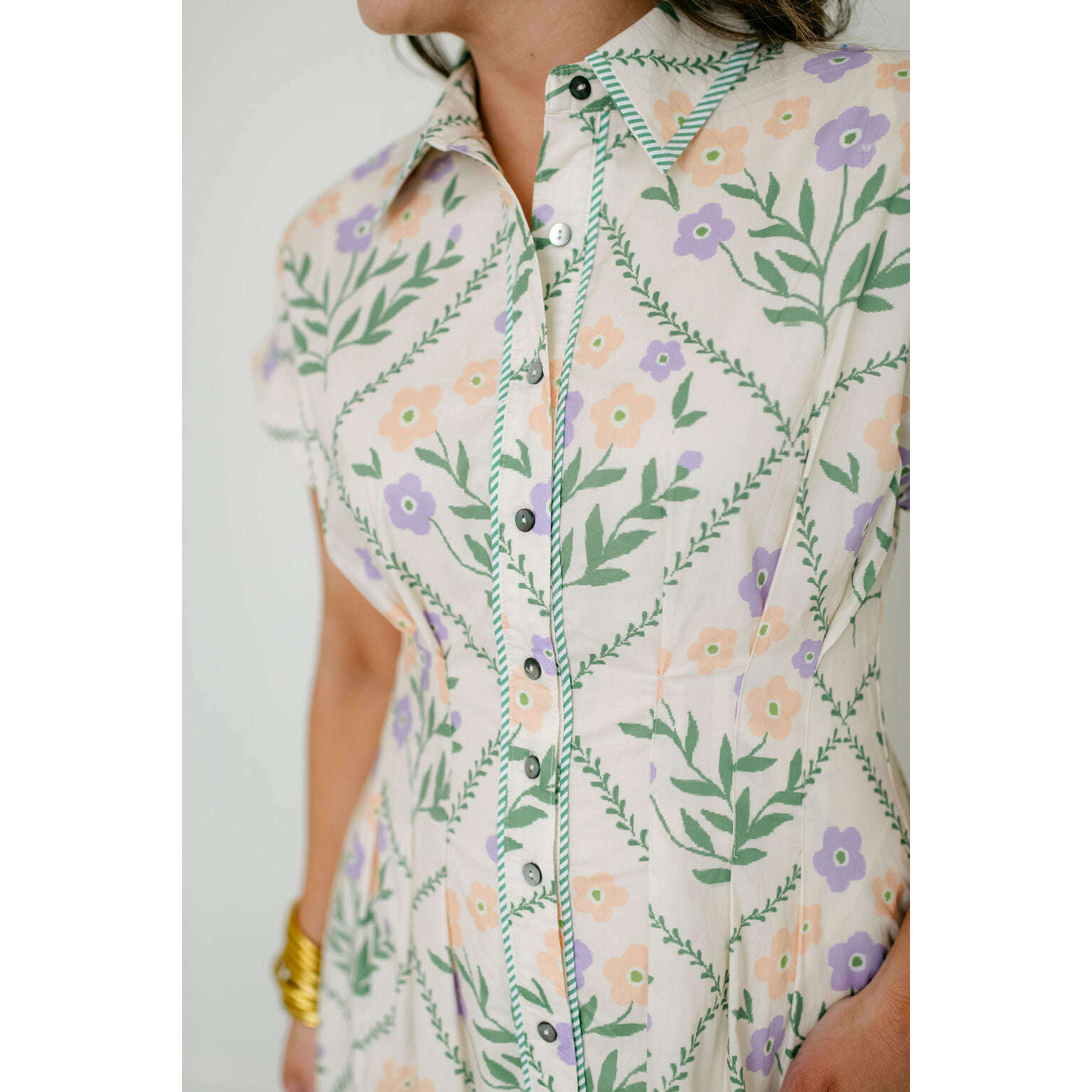 Entro Cream Green and Purple Floral Cinched Waist Dress