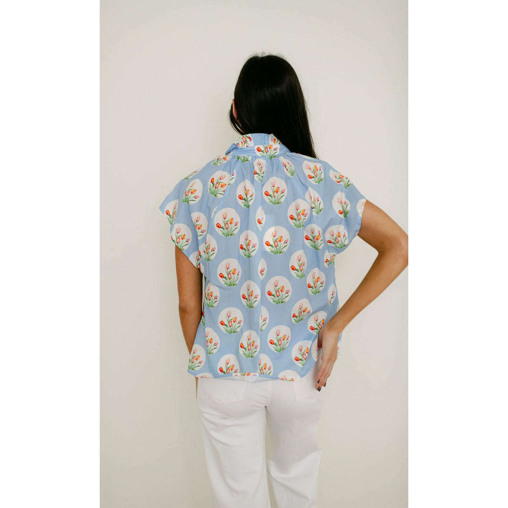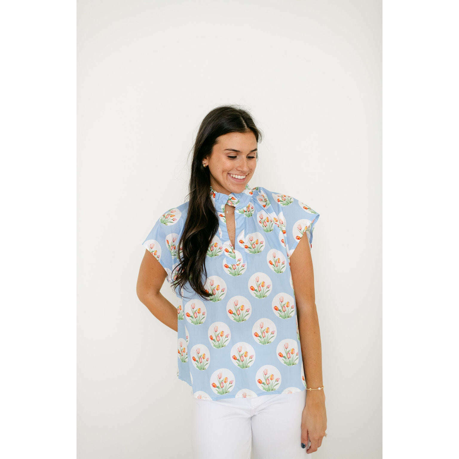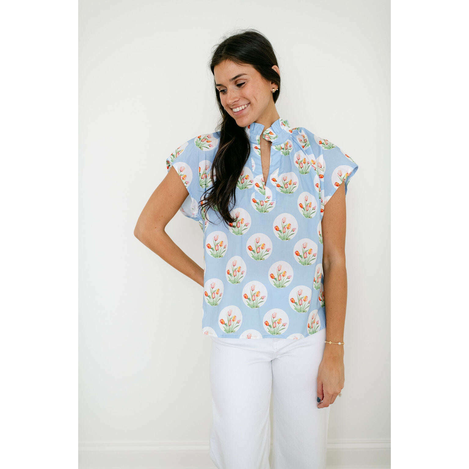 The Entro Light Blue Tulip Print Ruffle Neck Top brings a fun, fresh look to your closet with its eye-catching tulip design in a soft light blue. The ruffled neckline adds a sweet feminine detail that makes this top perfect for standing out without trying too hard.