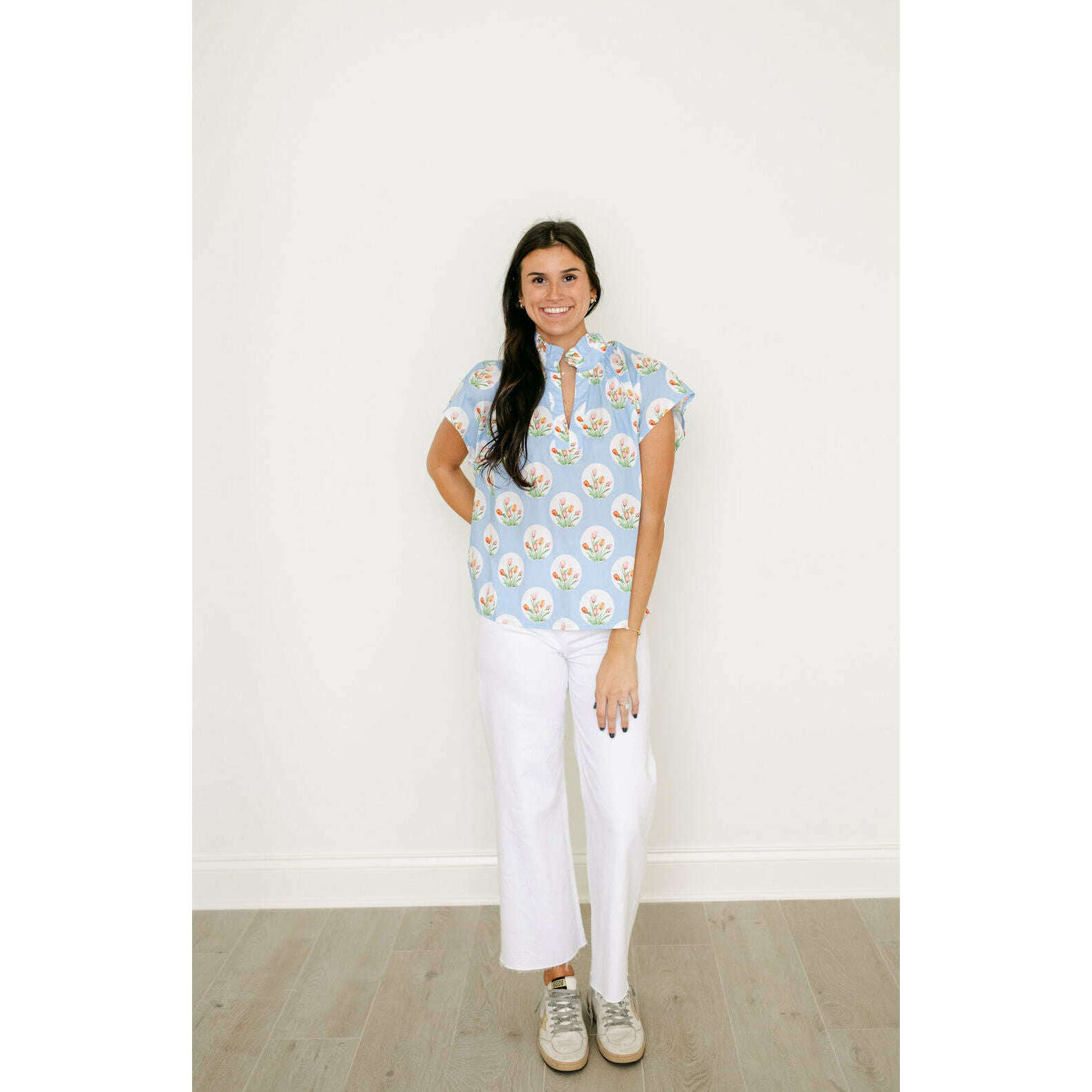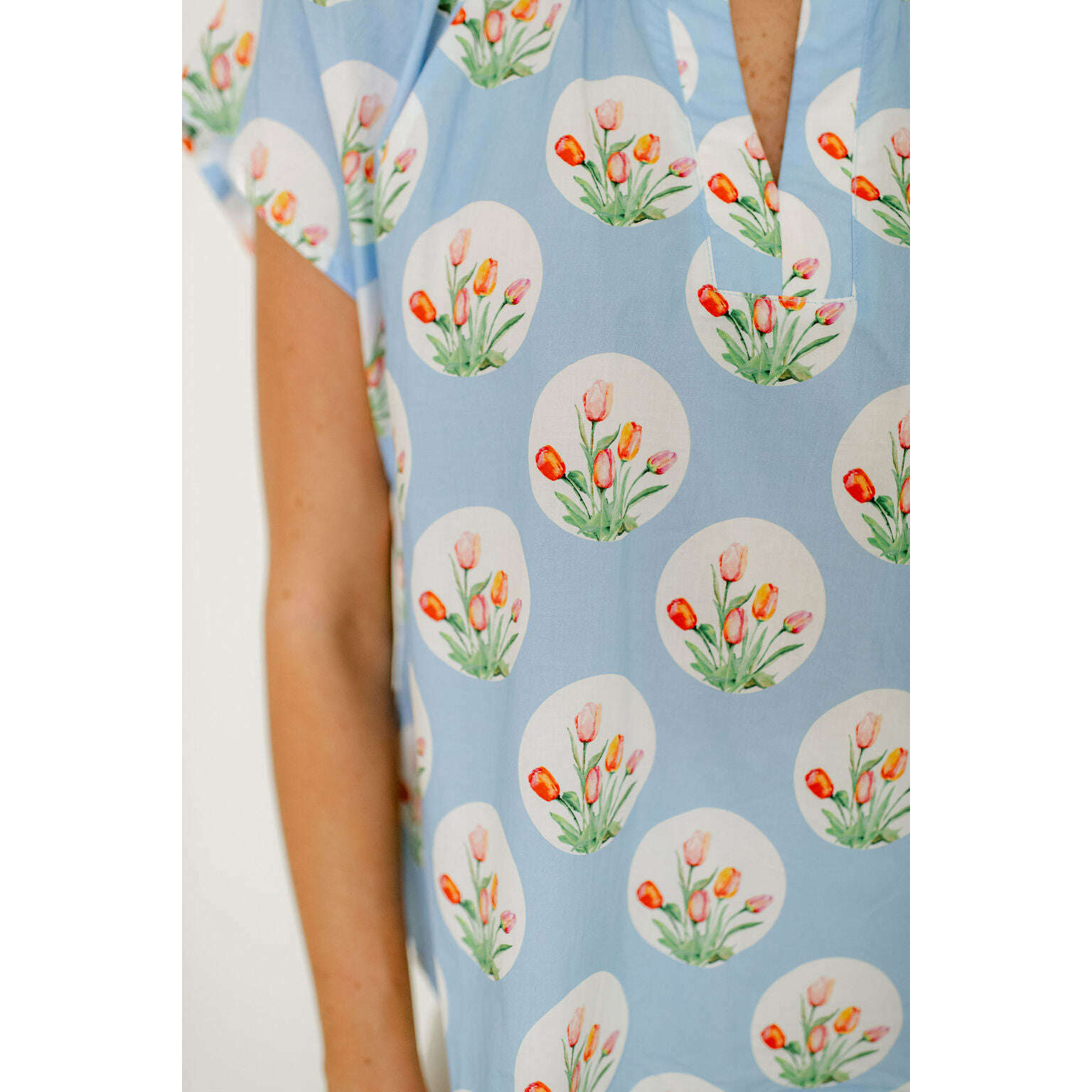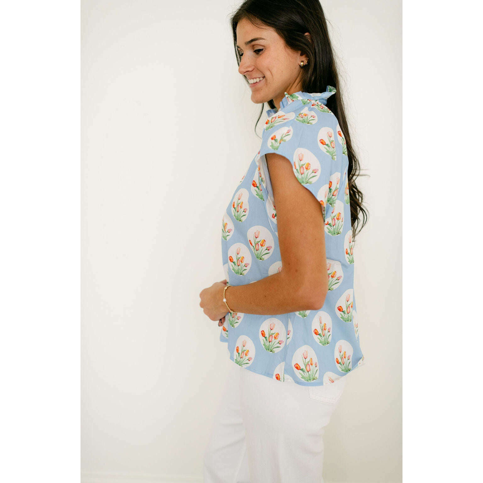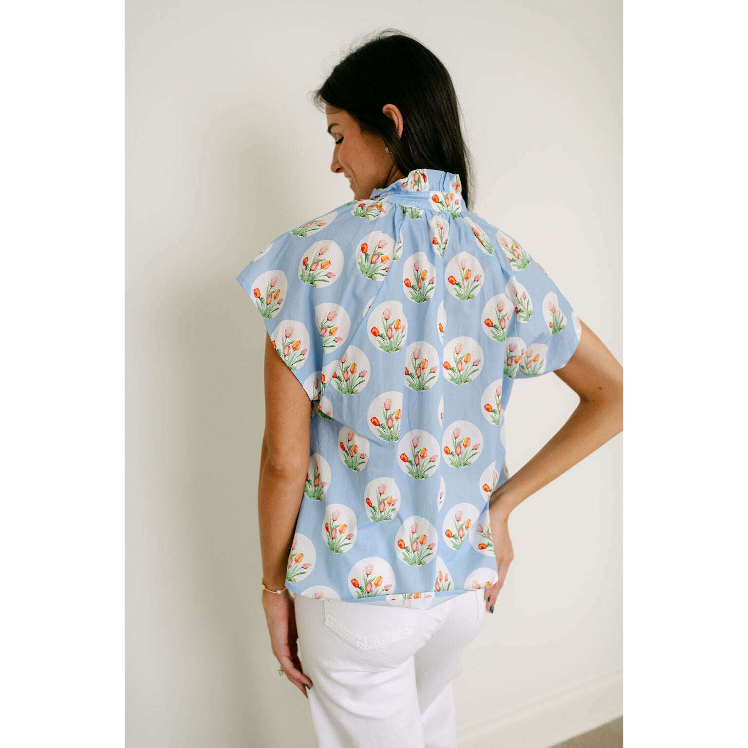 The Entro Light Blue Tulip Print Ruffle Neck Top brings a fun, fresh look to your closet with its eye-catching tulip design in a soft light blue. The ruffled neckline adds a sweet feminine detail that makes this top perfect for standing out without trying too hard.