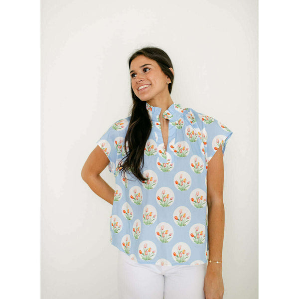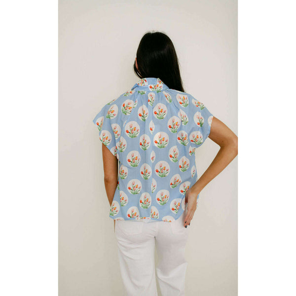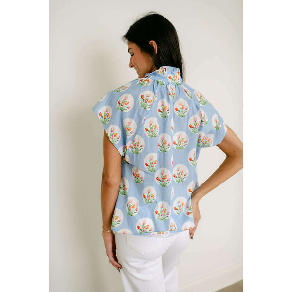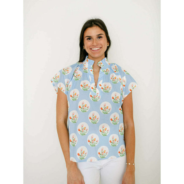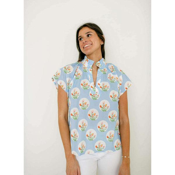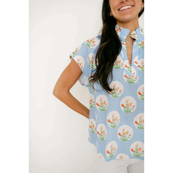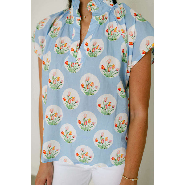 Entro Light Blue Tulip Print Ruffle Neck Top
