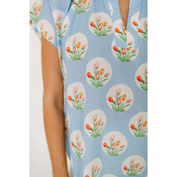 The Entro Light Blue Tulip Print Ruffle Neck Top brings a fun, fresh look to your closet with its eye-catching tulip design in a soft light blue. The ruffled neckline adds a sweet feminine detail that makes this top perfect...