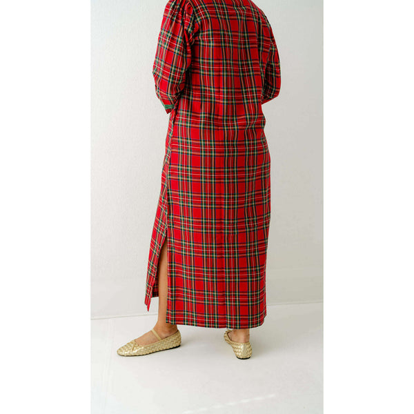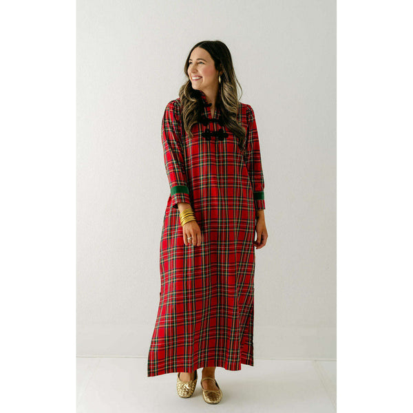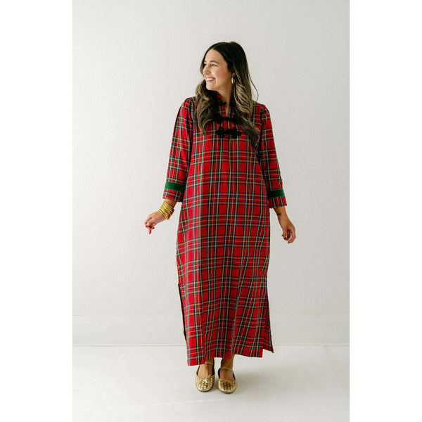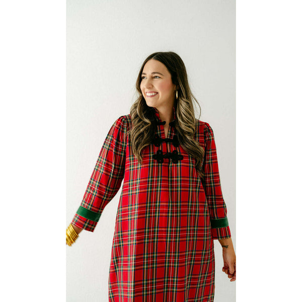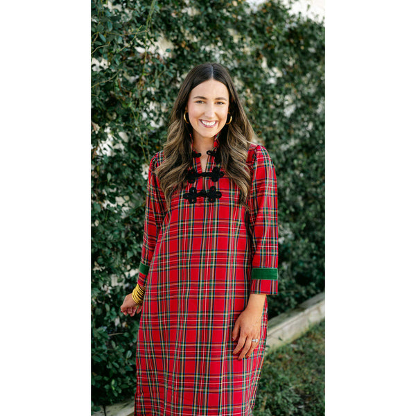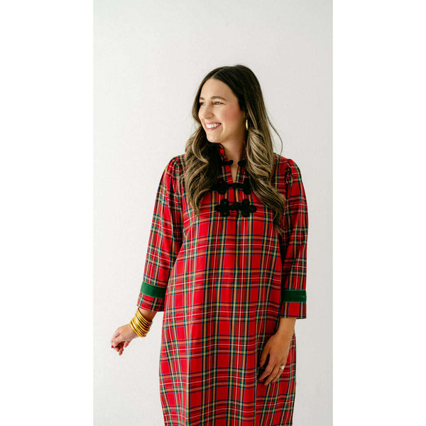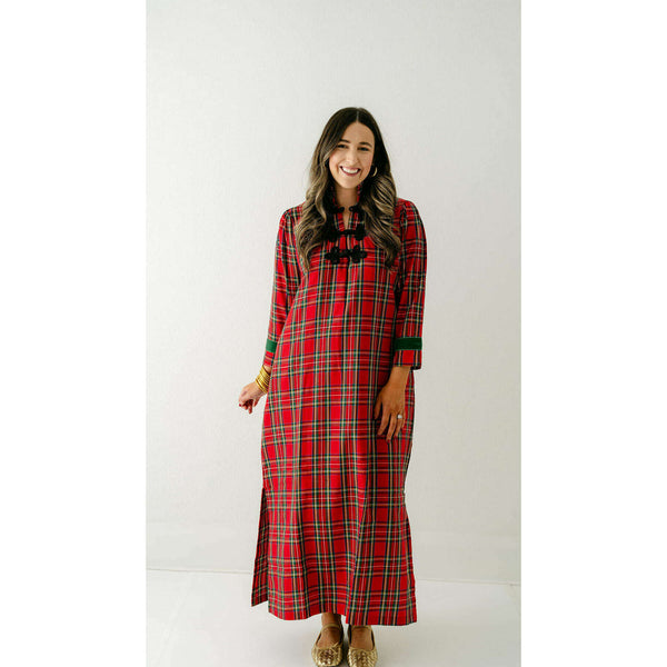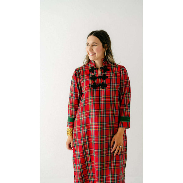 This festive House of MBR Bouvier cut caftan is dressed for the season in a red tartan plaid and trimmed with black frog closures and green velvet. It is constructed in a soft 100% cotton fabric and perfect for all...