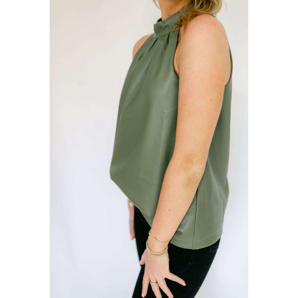 How fun is our Jade Melody Tam Pleather Halter Sage top?! This is the perfect addition to your fall wardrobe. Fits true to size, Aubrey is wearing an XS. She is 5'6 and a size 2 Spot clean